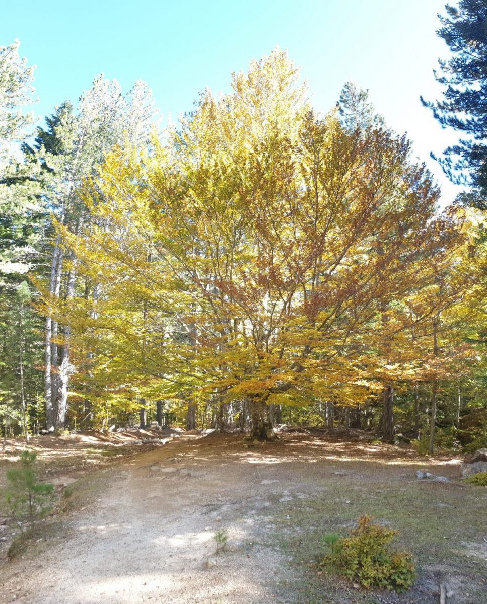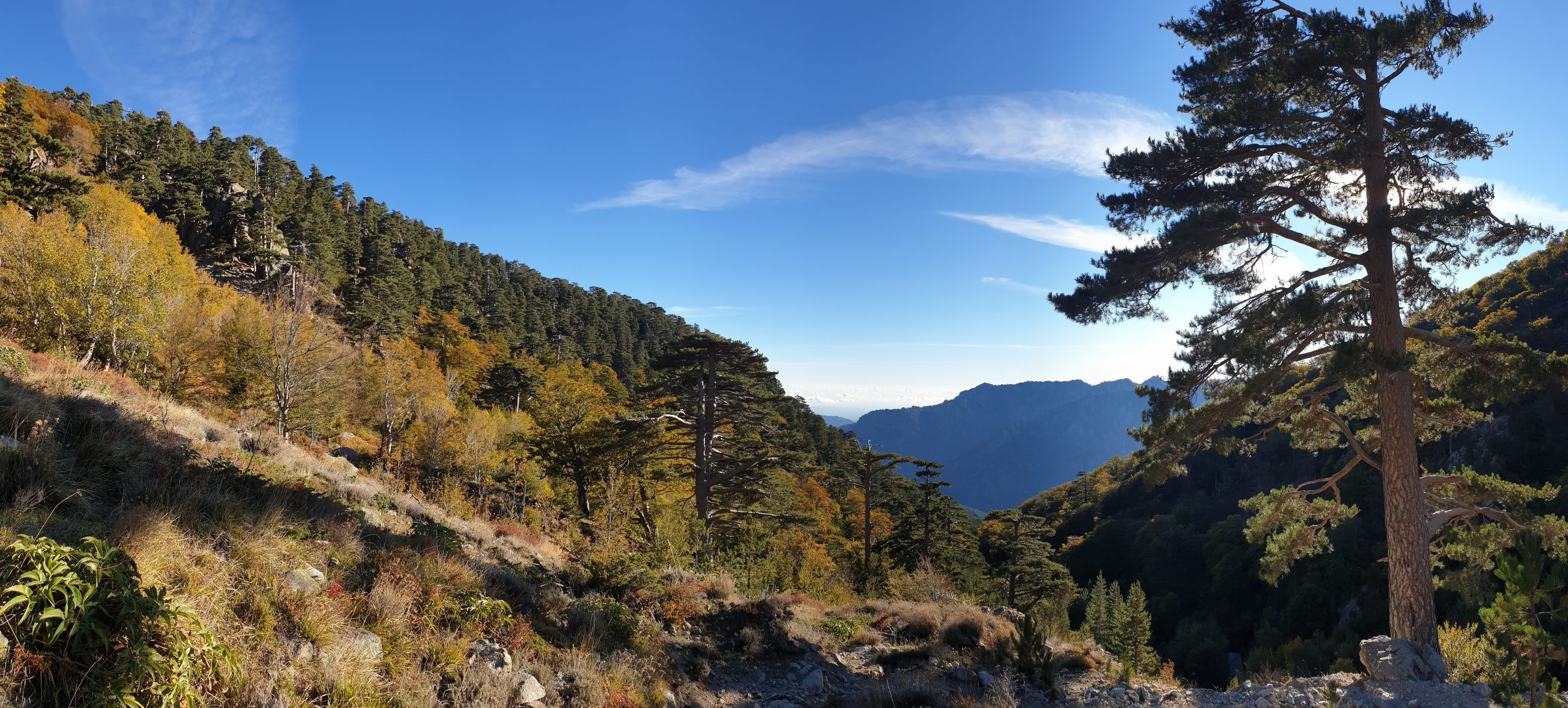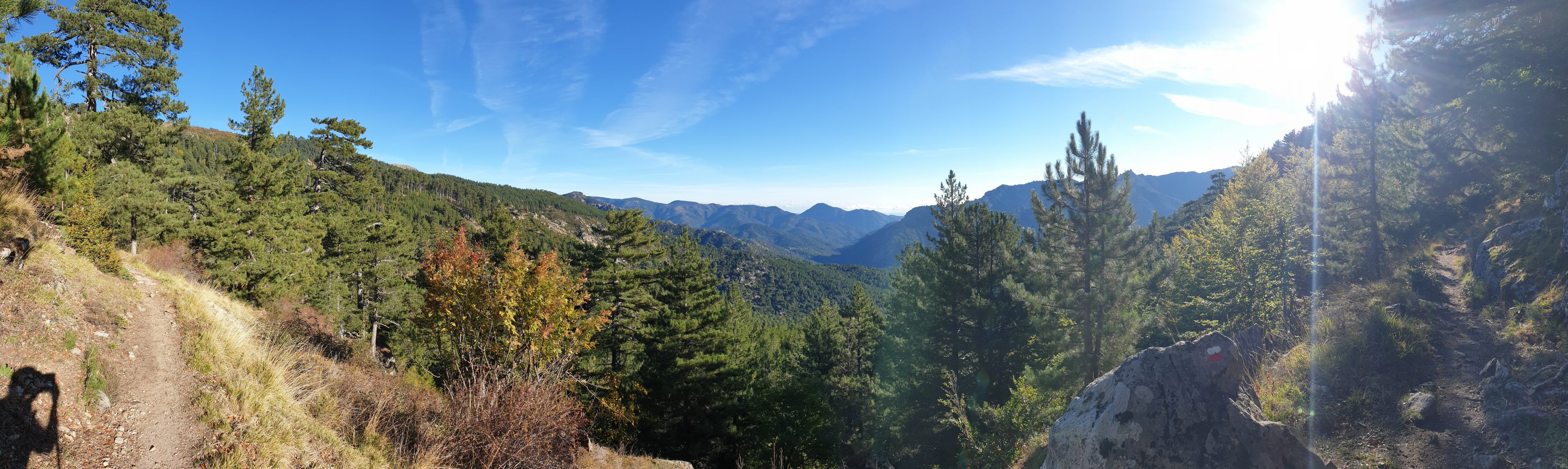 Realisiert habe ich meinen Fehler erst, als der Weg entlang dem Ruisseau de Casso zur Strasse abbog. Zum zurücksteigen konnte ich mich nicht motivieren, und so folgte ich halt der originalen Wegführung des GR-20. Diese ist — man muss es sagen — recht langweilig. Über gut sechs Kilometer traversiert man durch bewaldete Hänge bis zur Bergerie de Ghjalcone, wo der Weg ins Tal des Ruisseau Guado Alla Macchia absteigt, auf der anderen Bachseite kurz weitertraversiert und danach auf einer üblen Schotterpiste zum Col de Verde absteigt. Wahrlich kein Prunkstück, diese Waldläuferei!