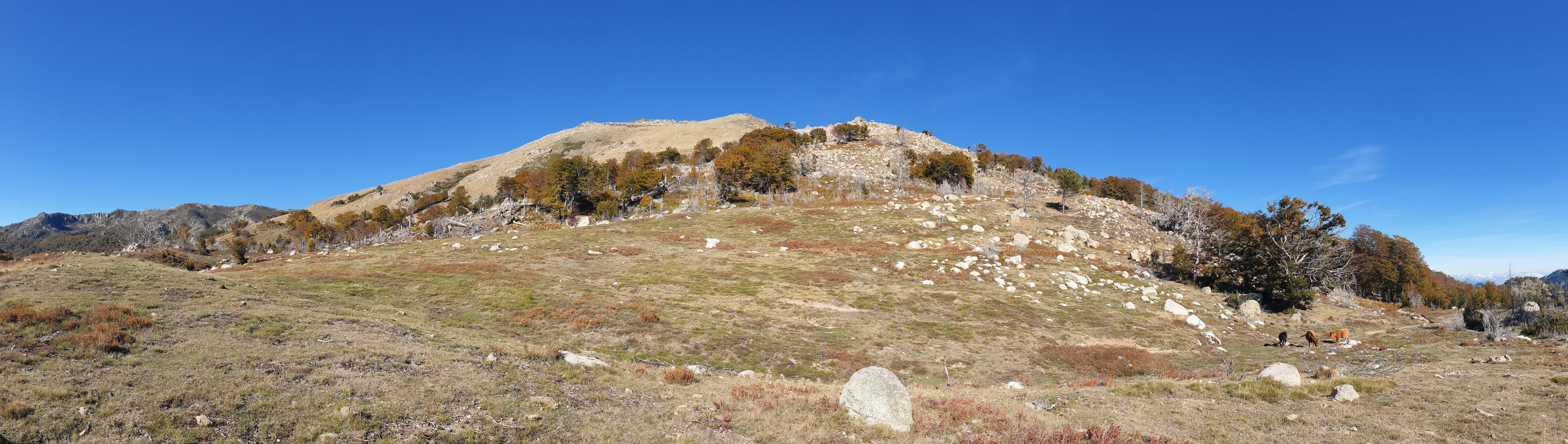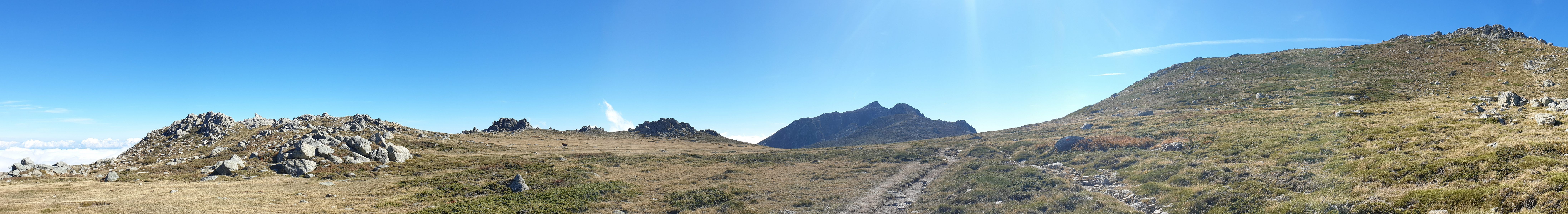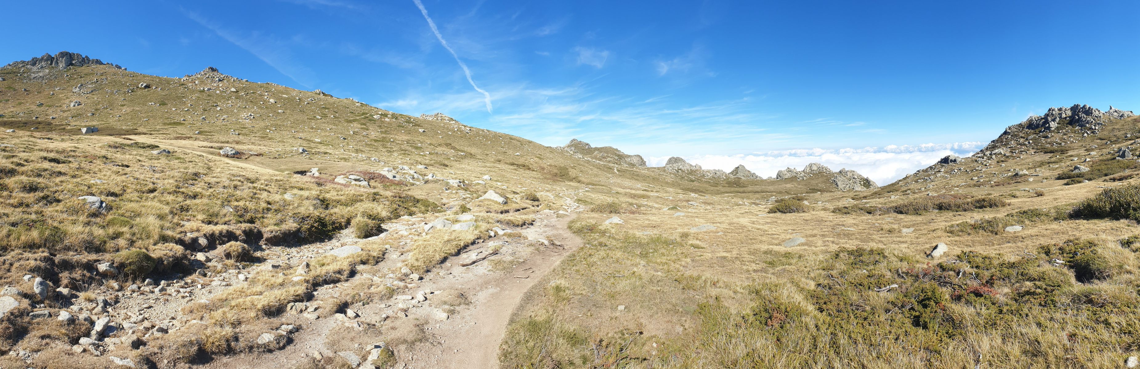Der weitere Aufstieg zur Bocca d’Oru (1846) ist schnell geschafft, und ab dort folgte einer der allerschönsten Abschnitte auf dem ganzen GR-20. Die Hochebene U Prati erinnert mich ihren runden Granitbuckeln und dem grobkörnigen, granitischen Sandgrund an die Landschaften von Joshua Tree. Der Weg verläuft fast eben und ist mit einer weichen Humusschicht überzogen. An jenem Tag lag im Osten tief unten eine Wolkenschicht, sodass ich mich auf Wolke sieben wähnte. Und natürlich standen auch noch einige Rindviecher dekorativ herum. Es war phantastisch schön!