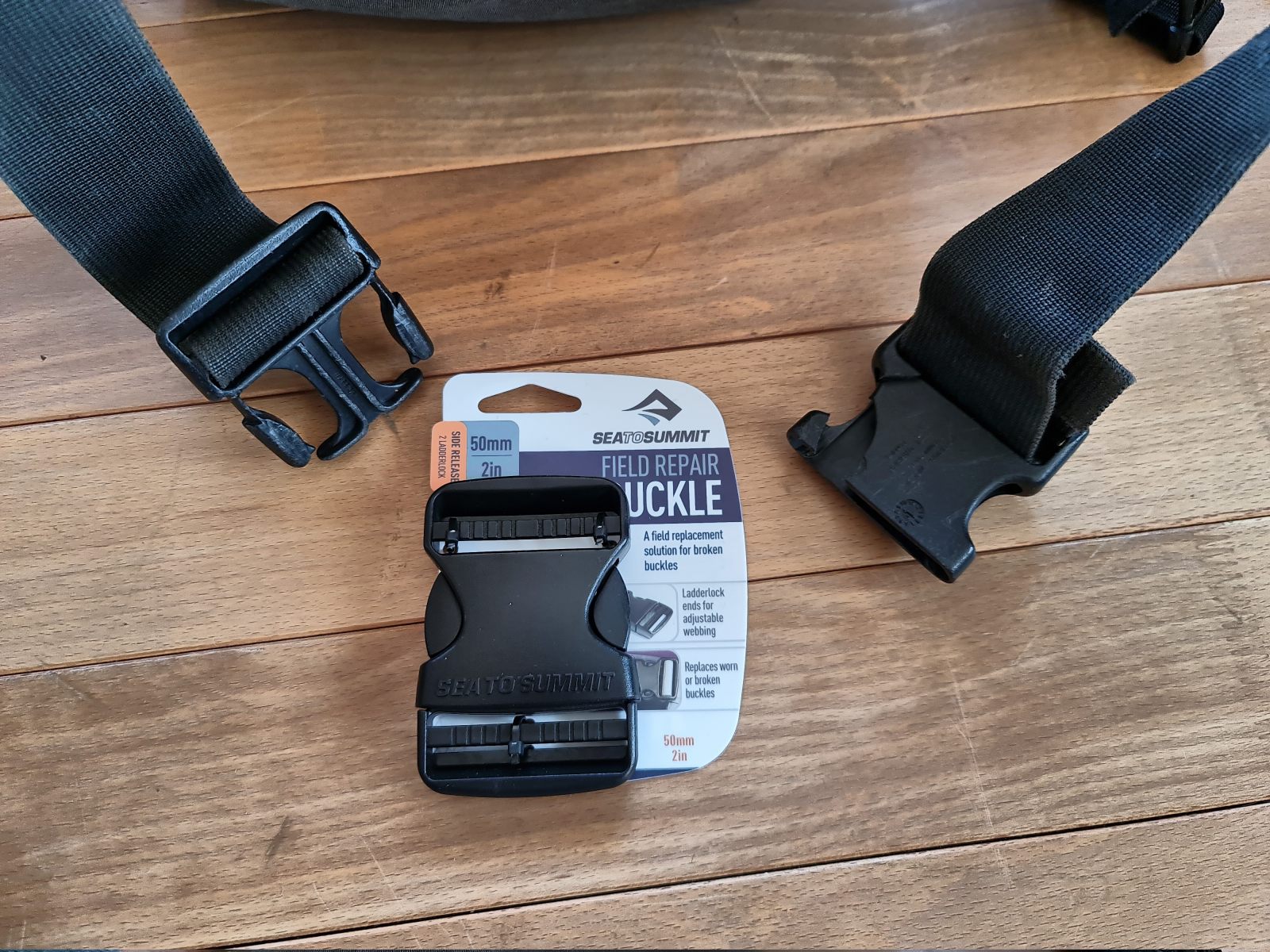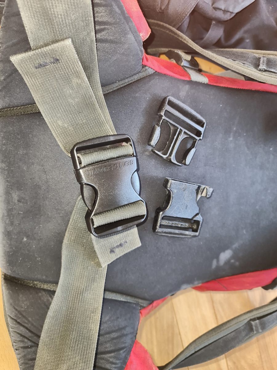 Glücklicherweise gibt es von Sea To Summit Ersatzschnallen in viererlei Ausführung; auf jeder Seite hat es entweder eine verstellbare Riemenschnalle, oder es kann ein fixer Steg eingeschraubt werden, wenn die Gurte zu einer festen Schlaufe vernäht ist. Das alles ist natürlich keine Hexerei, dennoch hat es Jahre (!) gedauert, bis ich davon etwas mitgekriegt habe. Entsprechend gross war der Reparaturbedarf im Rucksackbestand unseres Haushalts angewachsen. Die grösste Schwierigkeit besteht darin, den richtigen Schnallentyp zur passenden Riemenbreite zu kaufen …