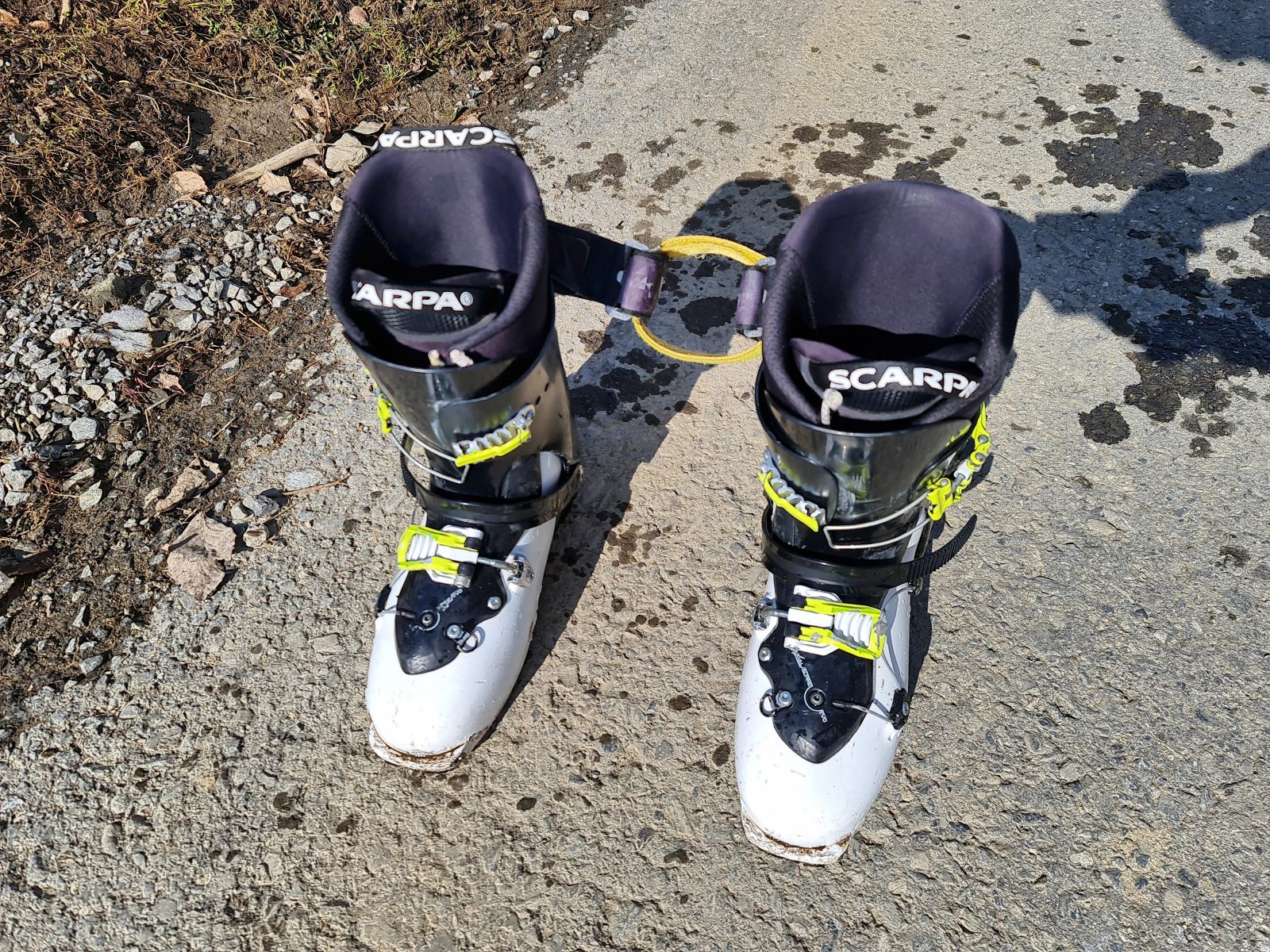 Im Zug oder wenn man im Abstieg nach einer Tour auf leichte Schuhe wechselt, stellt sich die Frage, wie man die Skischuhe am besten aufbindet. Mitunter zu diesem Zweck habe ich am Rucksackträger immer ein Skiriemli befestigt. Damit lassen sich die Klettbänder der Schuhe schnell zusammenbinden und können so hinter den Schultern über den Rucksack gehängt werden. Kein Gebambel und angenehm nah am Rücken zu tragen.