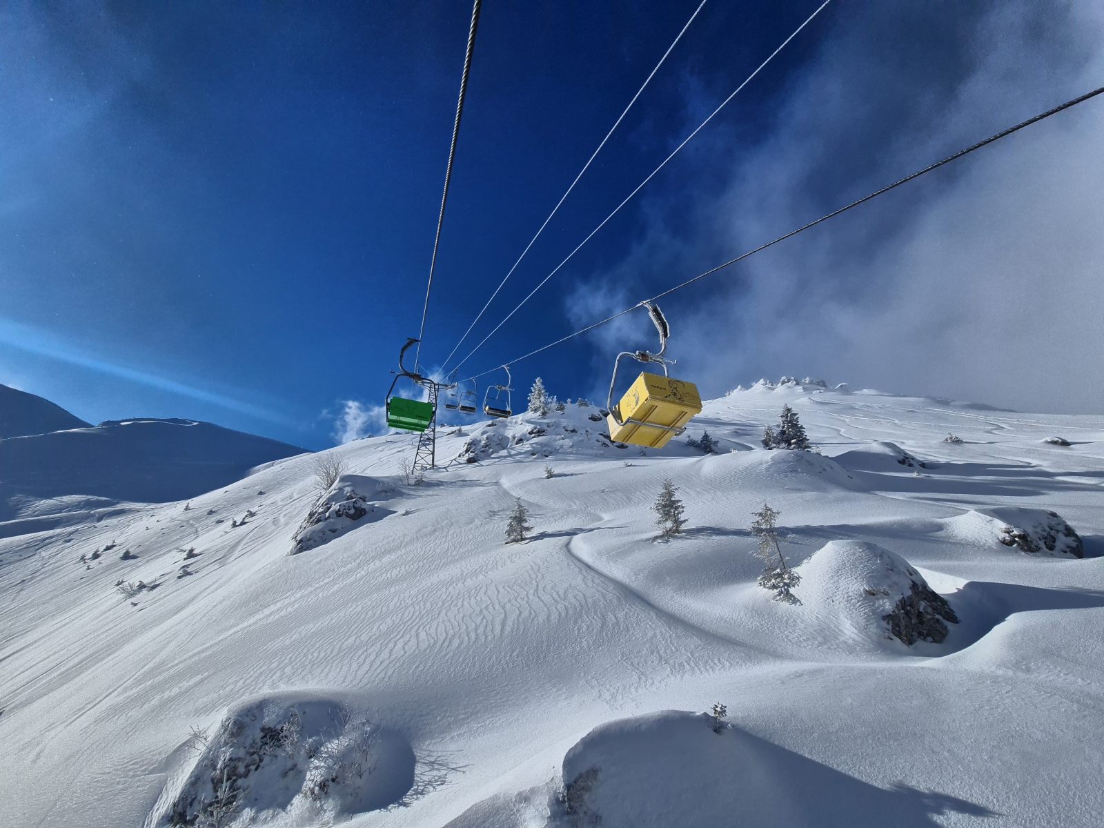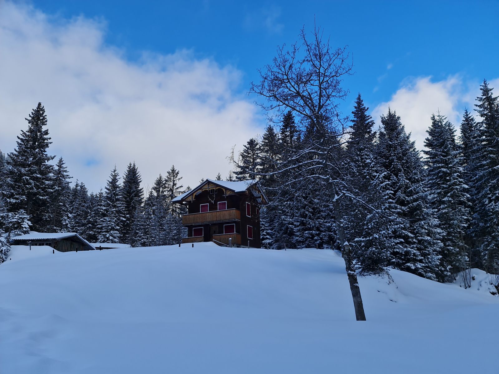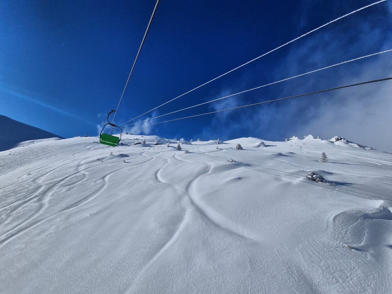 Andere waren schon unterwegs und johlten freudig durchs Gelände. Ich stieg kurz über den Haldigrat auf für eine erste Abfahrt im unverspurten Gelände. Der Südwind blies zwischendurch kräftig, und es war sehr kalt. Die 20 cm Neuschnee lagen auf der omnipräsenten Regenkruste der letzten Wochen. Der Schlusshang war schon recht gut beackert, aber deswegen ist man ja nicht gekommen. Unten hatte jemand ein improvisiertes Besenbeizli installiert — leider jedoch ohne Kaffee, dafür mit Schoggikuchen.