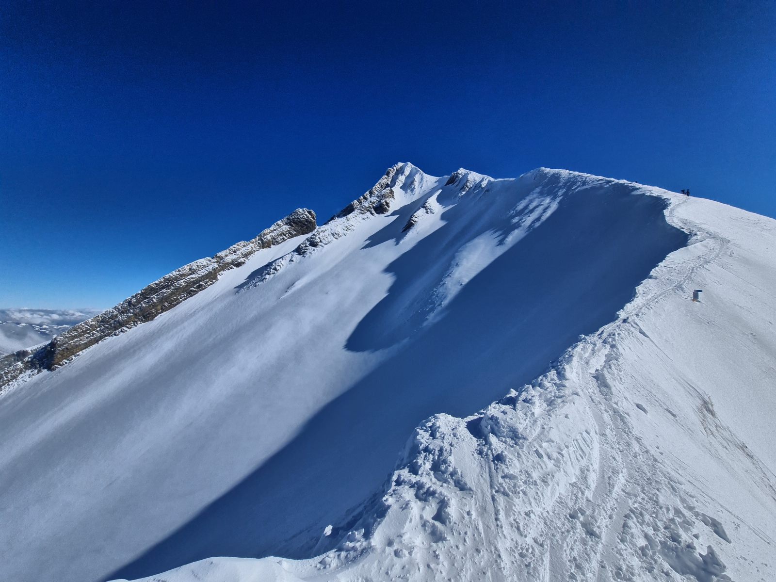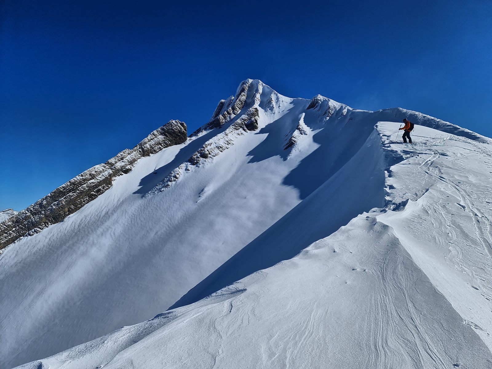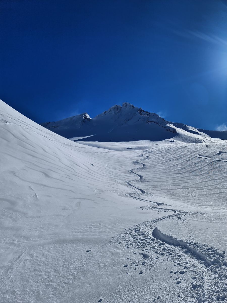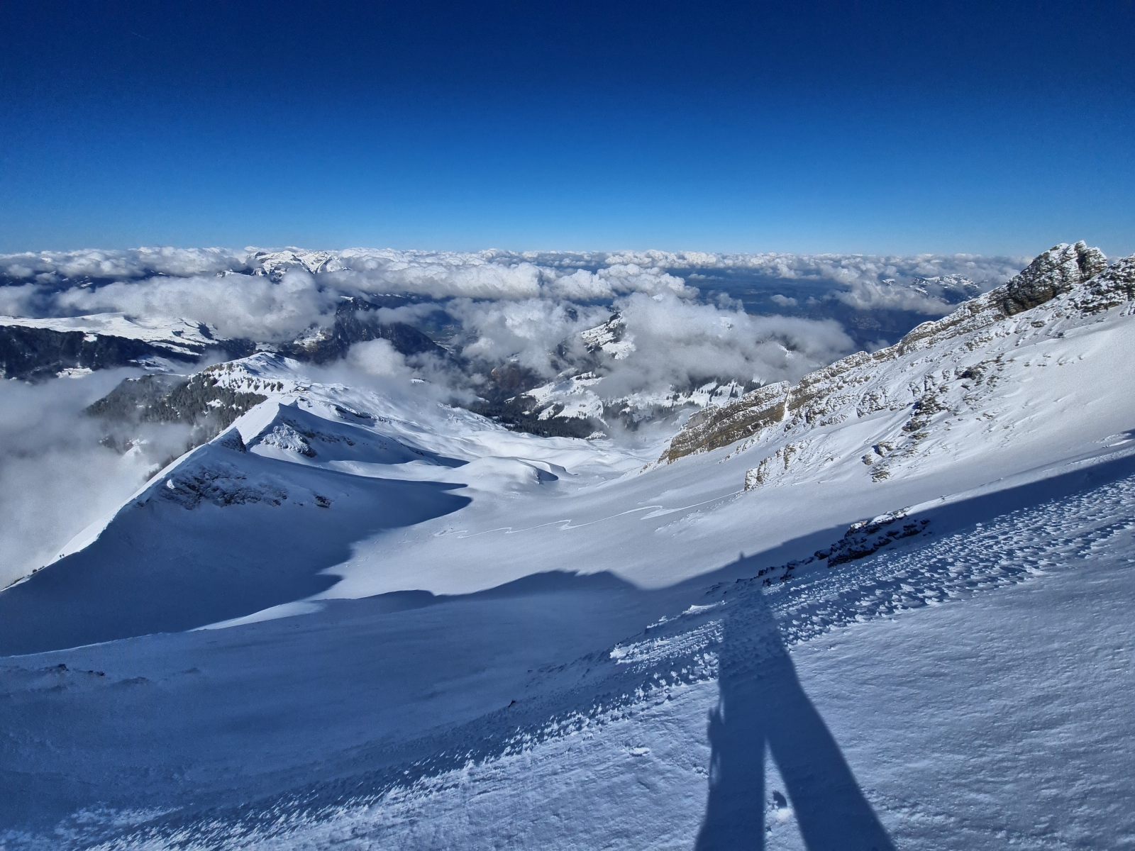 Von der Bergstation wieder über den Grat, der nun schon gespurt war. Je weiter oben desto stiller wurde der Wind und wärmer die Temperaturen. Auf der Südwestschulter breitete sich unter mir der prächtige Hang aus mit nur zwei einsamen Spuren. Die Abfahrt war traumhaft schön, und sie blieb es bis zum Alpboden hinunter. Toll, dass es das Haldigratbähnli für so schöne Tage gibt!