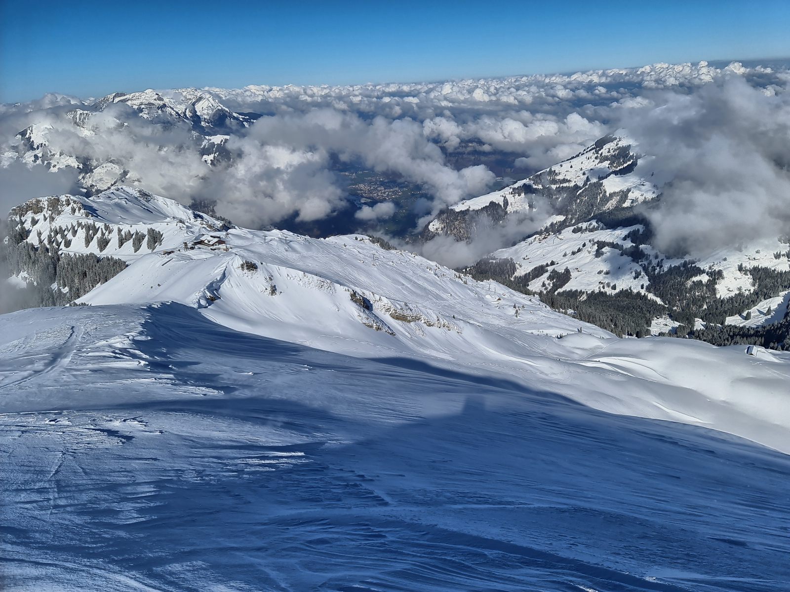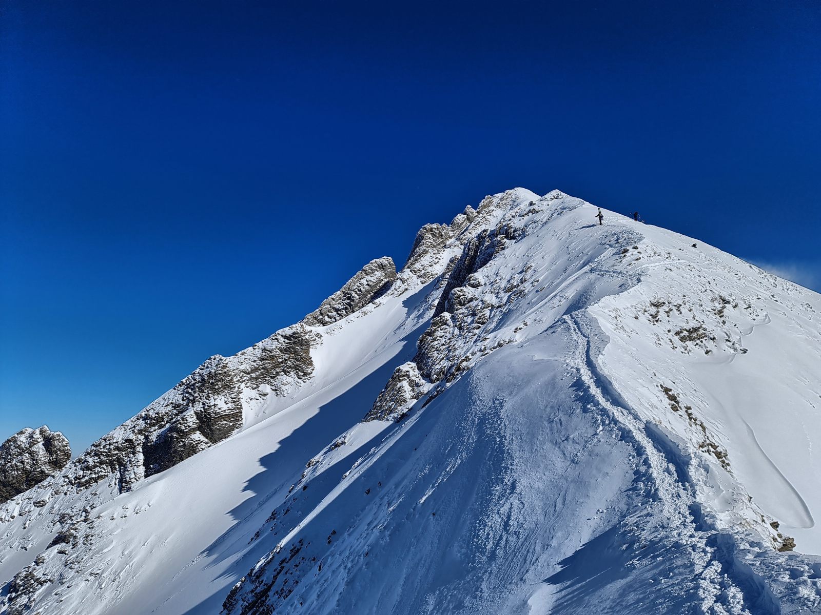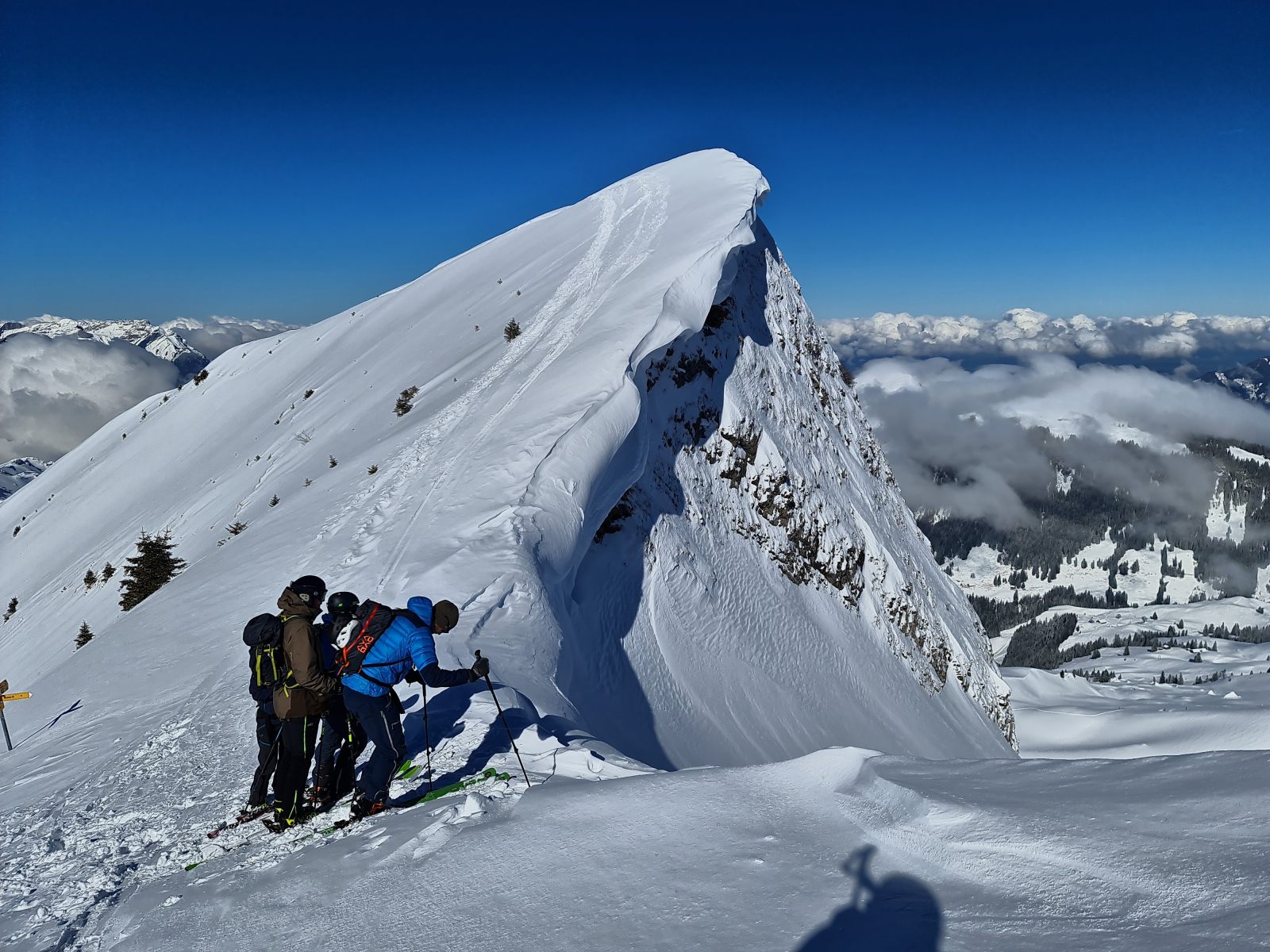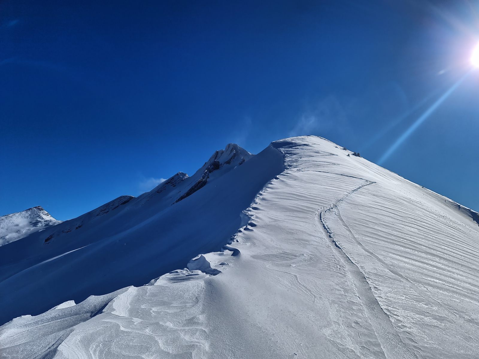 Von der Bergstation wieder über den Grat, der nun schon gespurt war. Je weiter oben desto stiller wurde der Wind und wärmer die Temperaturen. Auf der Südwestschulter breitete sich unter mir der prächtige Hang aus mit nur zwei einsamen Spuren. Die Abfahrt war traumhaft schön, und sie blieb es bis zum Alpboden hinunter. Toll, dass es das Haldigratbähnli für so schöne Tage gibt!