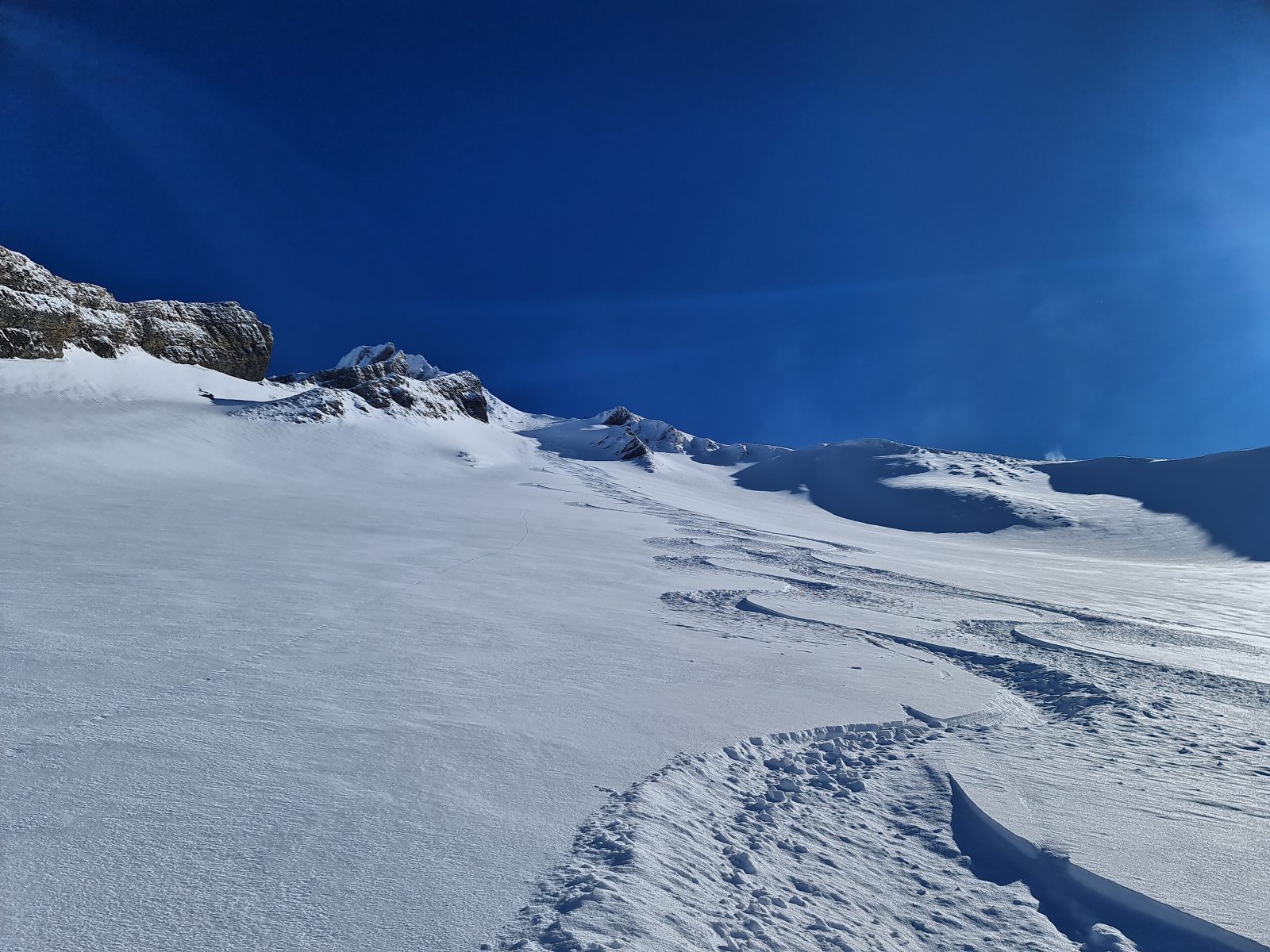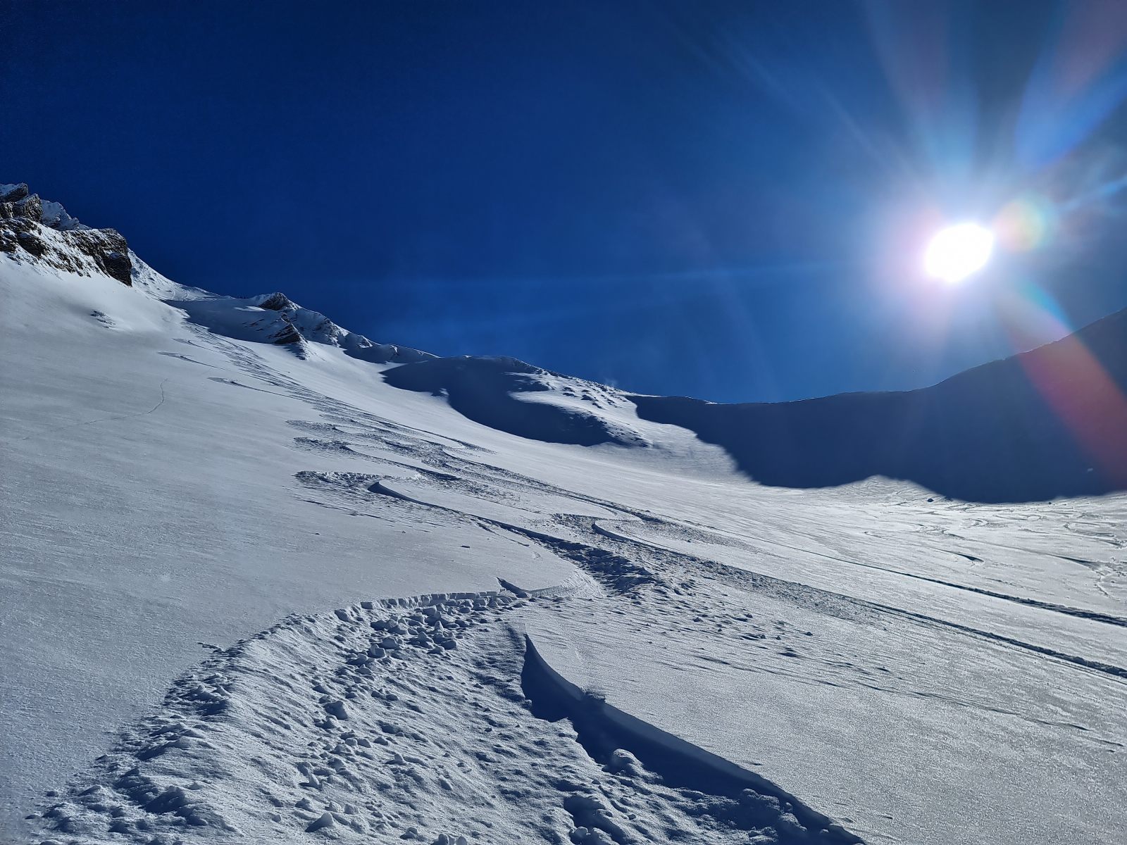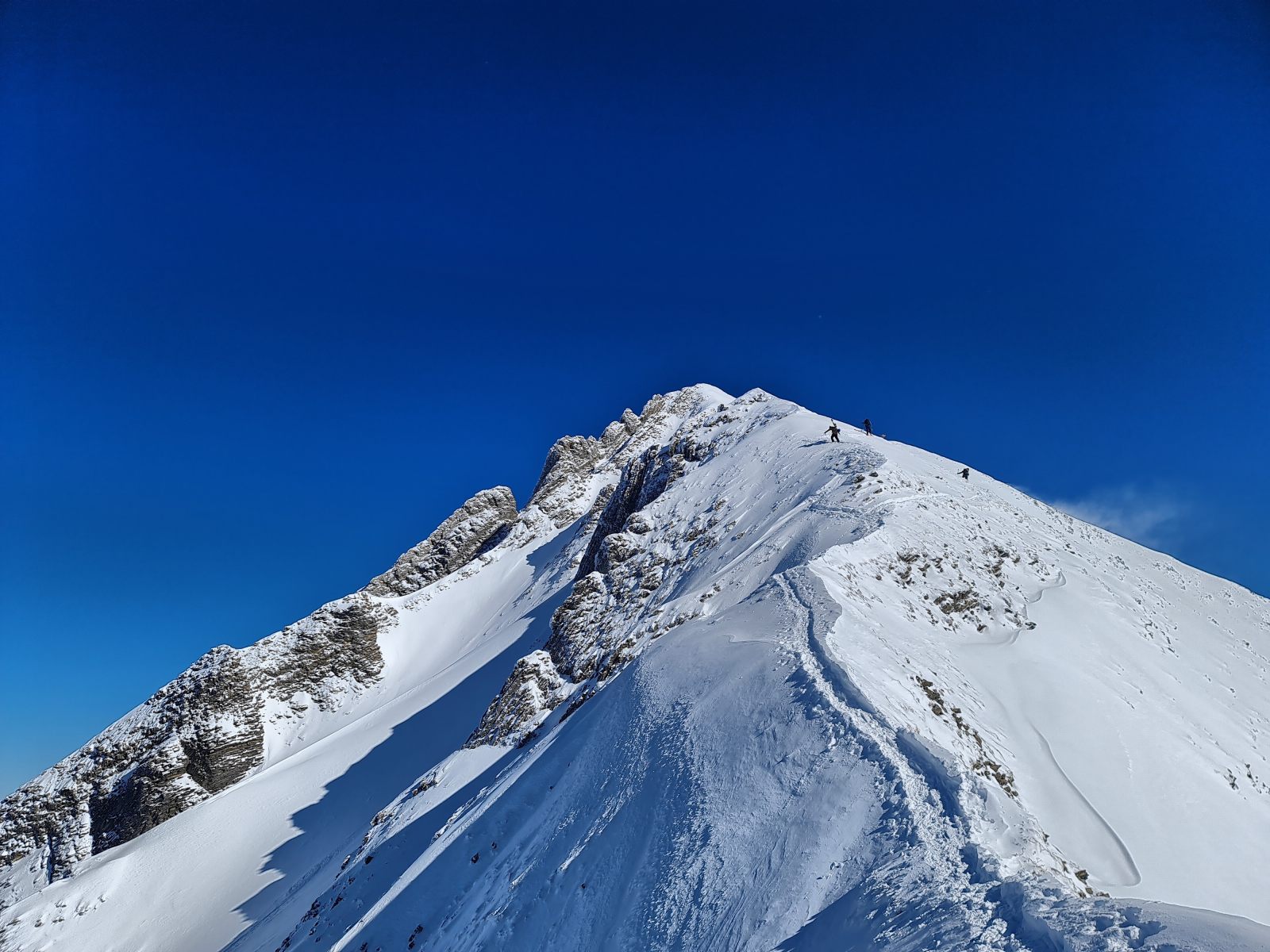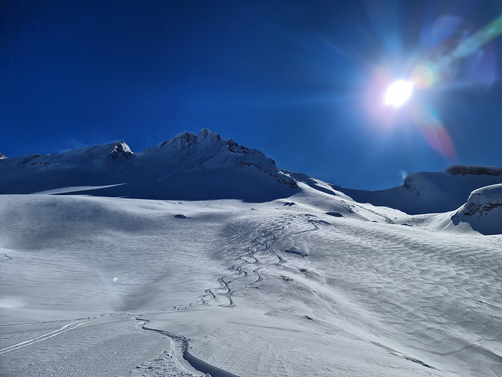 Von der Bergstation wieder über den Grat, der nun schon gespurt war. Je weiter oben desto stiller wurde der Wind und wärmer die Temperaturen. Auf der Südwestschulter breitete sich unter mir der prächtige Hang aus mit nur zwei einsamen Spuren. Die Abfahrt war traumhaft schön, und sie blieb es bis zum Alpboden hinunter. Toll, dass es das Haldigratbähnli für so schöne Tage gibt!
