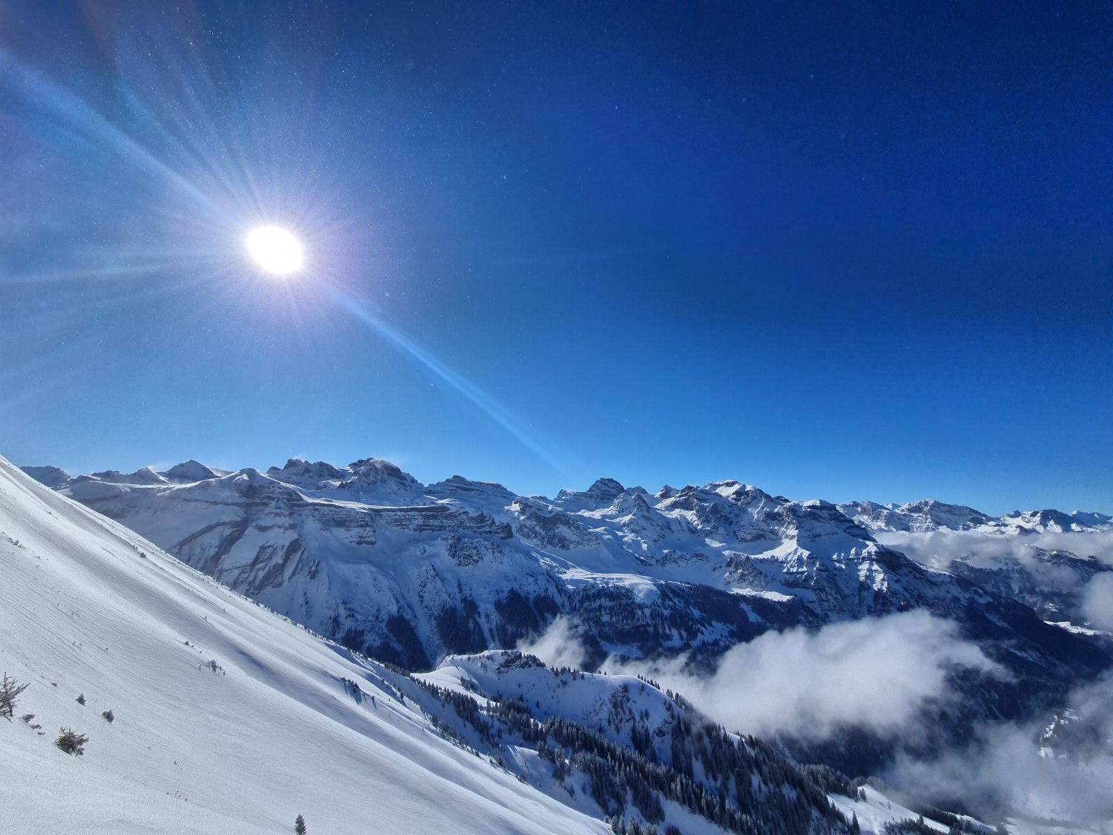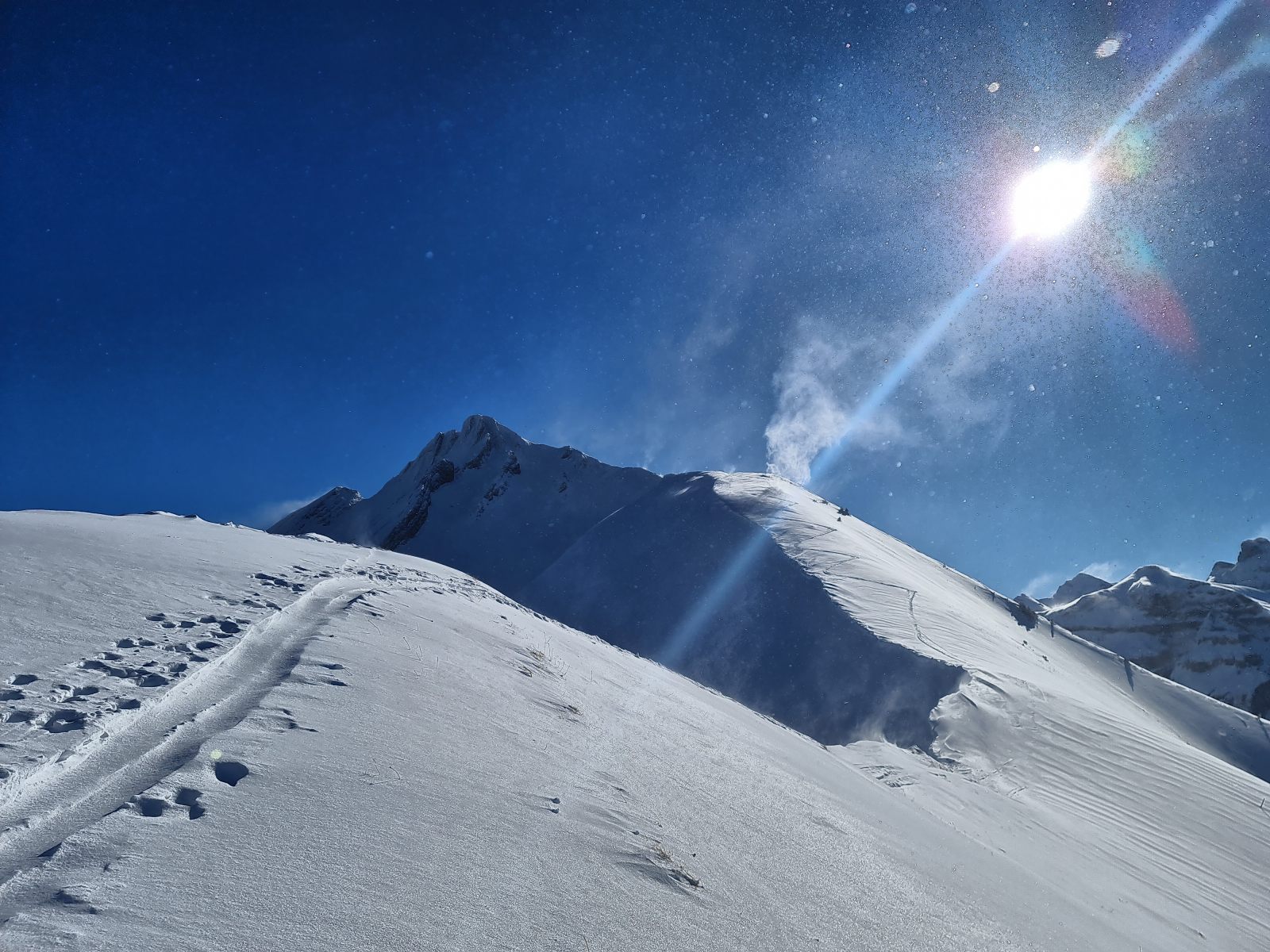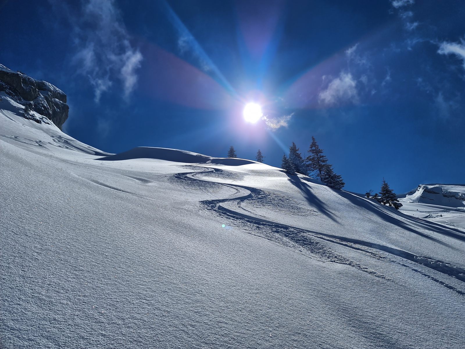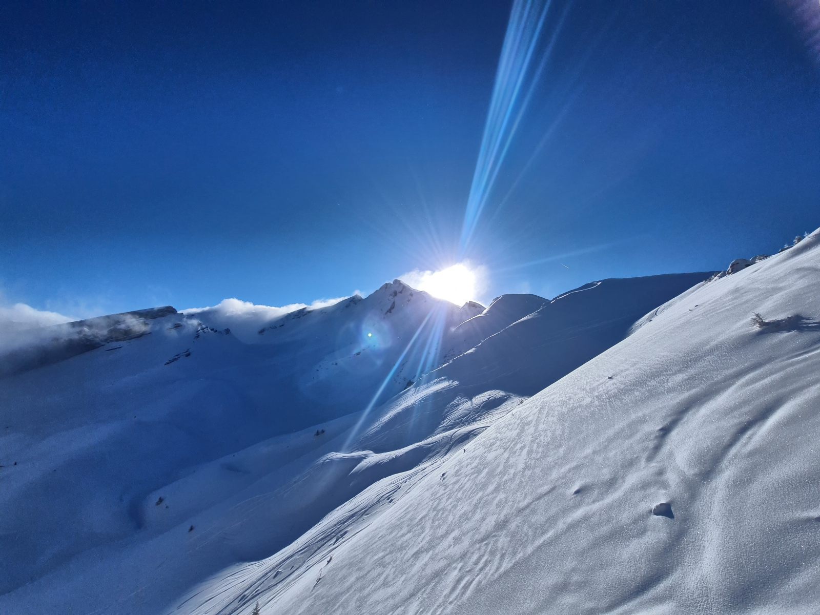 Von der Bergstation wieder über den Grat, der nun schon gespurt war. Je weiter oben desto stiller wurde der Wind und wärmer die Temperaturen. Auf der Südwestschulter breitete sich unter mir der prächtige Hang aus mit nur zwei einsamen Spuren. Die Abfahrt war traumhaft schön, und sie blieb es bis zum Alpboden hinunter. Toll, dass es das Haldigratbähnli für so schöne Tage gibt!
