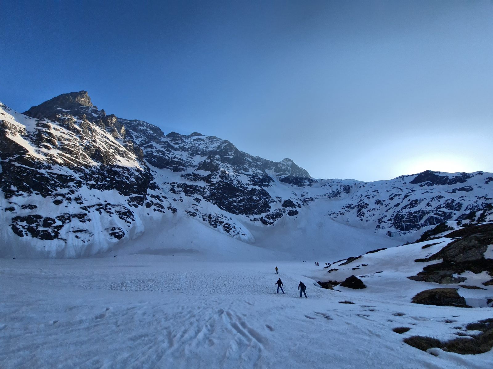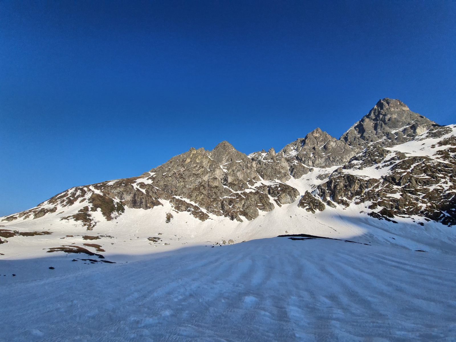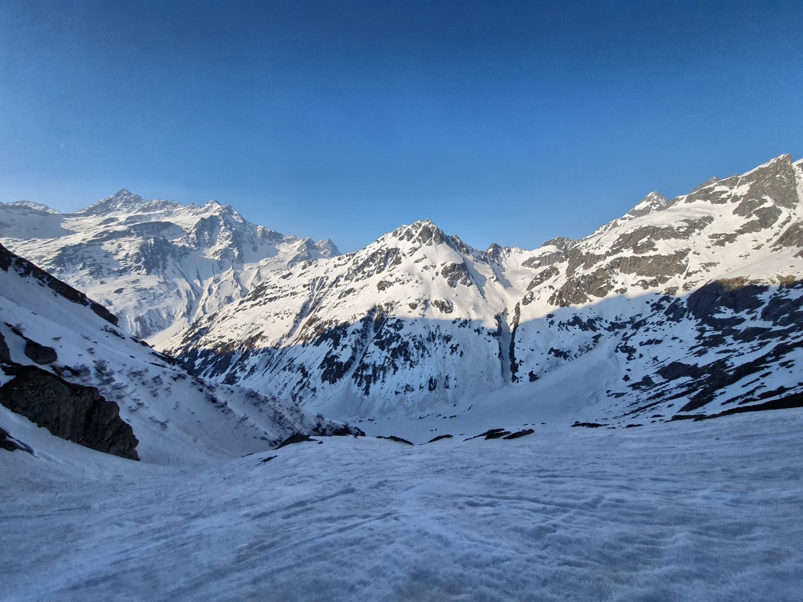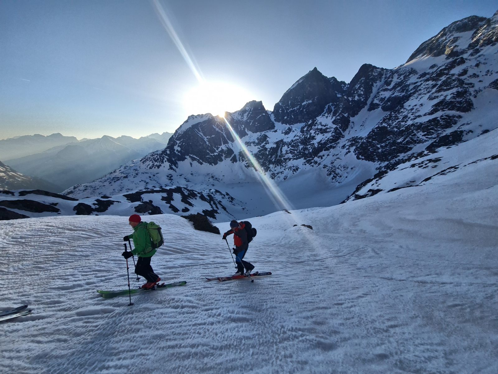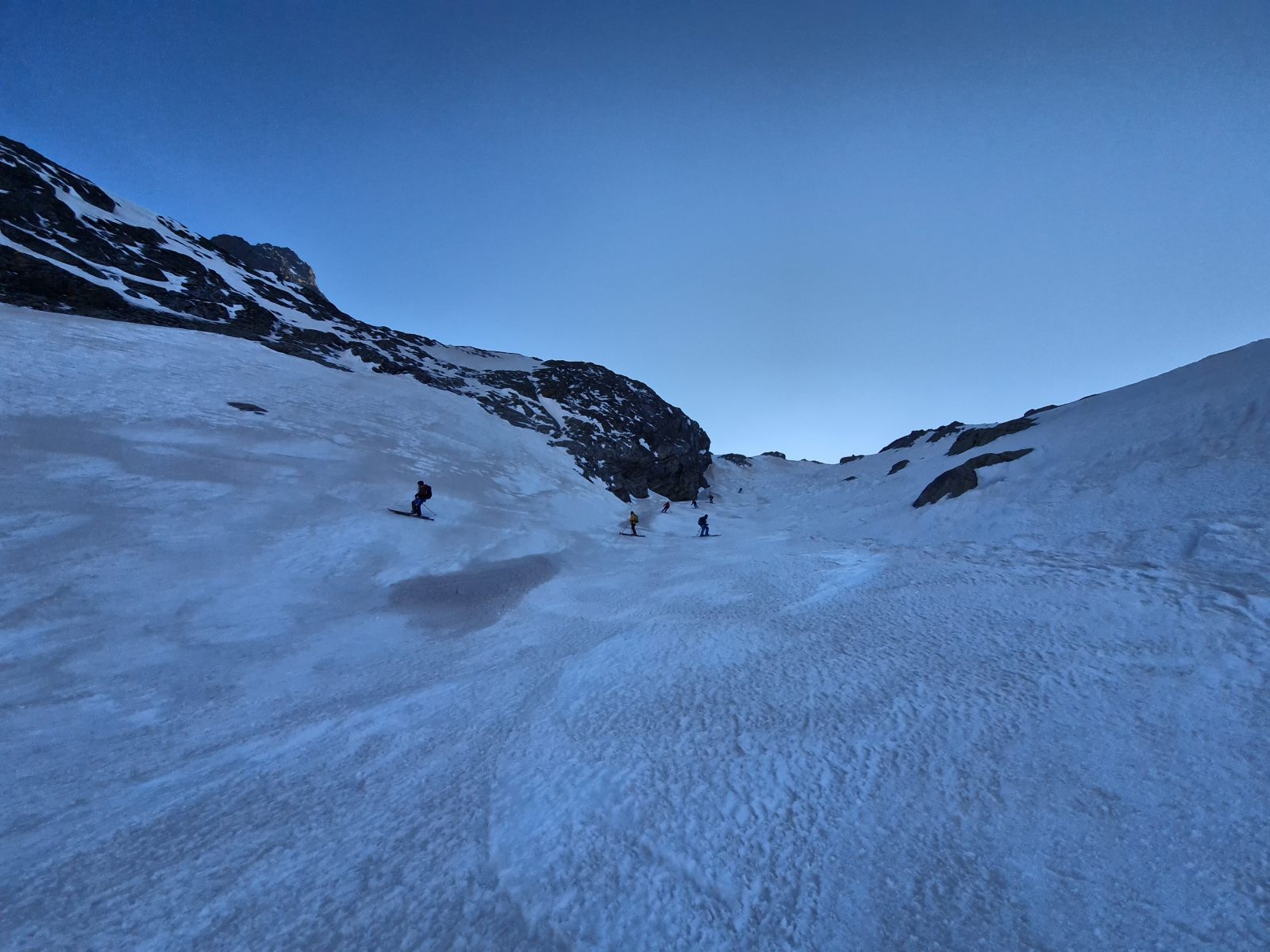 Die Abfahrt im nachmittäglichen Licht über den Glatt Firn war wunderschön. Weiter unten wechselten die Schneeverhältnisse zuerst zu einer dünnen Saharastaubschmelzkruste und danach zu windgefrästen Zastrugis. Glücklicherweise liess sich der Grossteil der Abfahrt in den zwar harten, aber glatt und gutgriffigen Hängen direkt zum Obersee hinunter verhältnismässig genussvoll absolvieren.