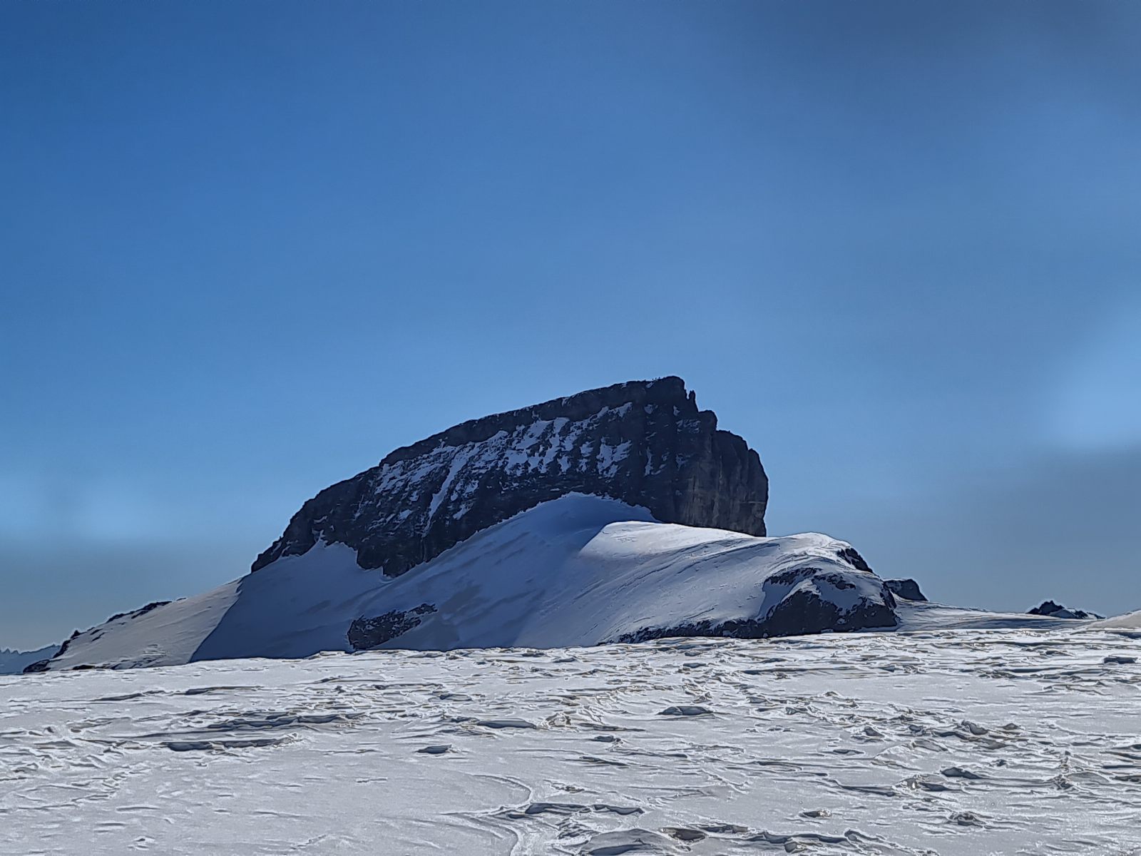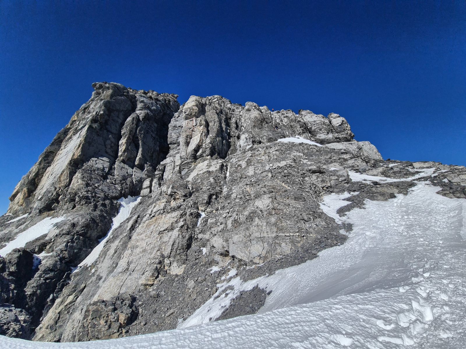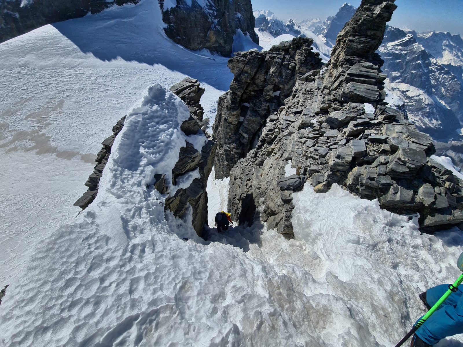 Der Aufstieg zum Gross Spannort führt derzeit ganz links aussen durch eine kurze Rinne und über einen Firnhang zu einer Traverse unter den Felsen, bevor durch einen engen Schlitz zur Schulter hochgestiegen wird. Die Firnverhältnisse waren sehr gut und die Spur sehr sicher. Von der Schulter wie üblich über die kurze Kletterpassage und weiter zum Gipfel. Weil die ganze Zeit ein giftiger Südwind pfiff, verweilten wir nur kurz und machten uns an den Abstieg. Mit einer Gruppe dauert der ebenso lange wie der Aufstieg. Insbesondere im letzten Firnhang muss mit über den Pickel gesichert werden.