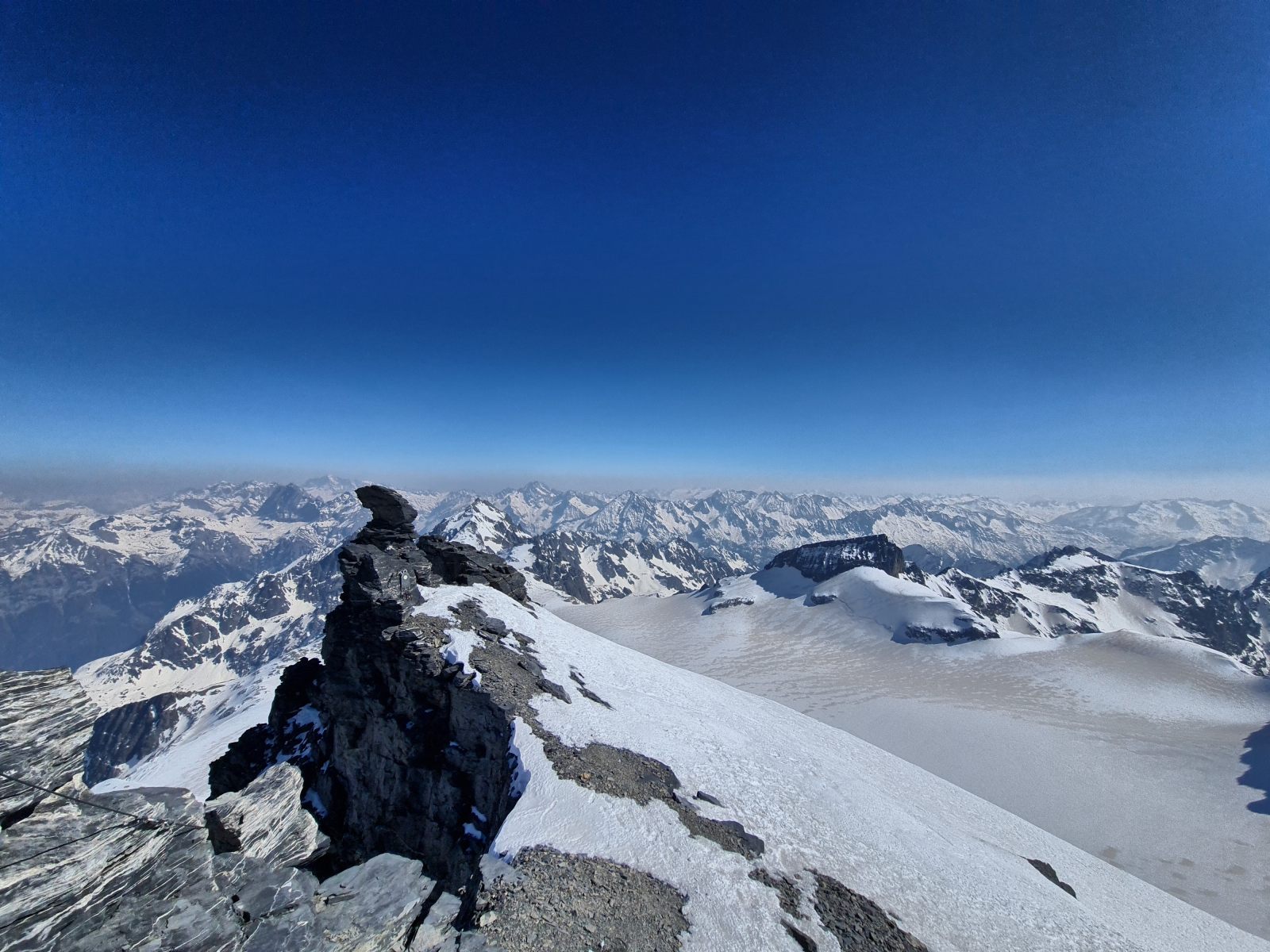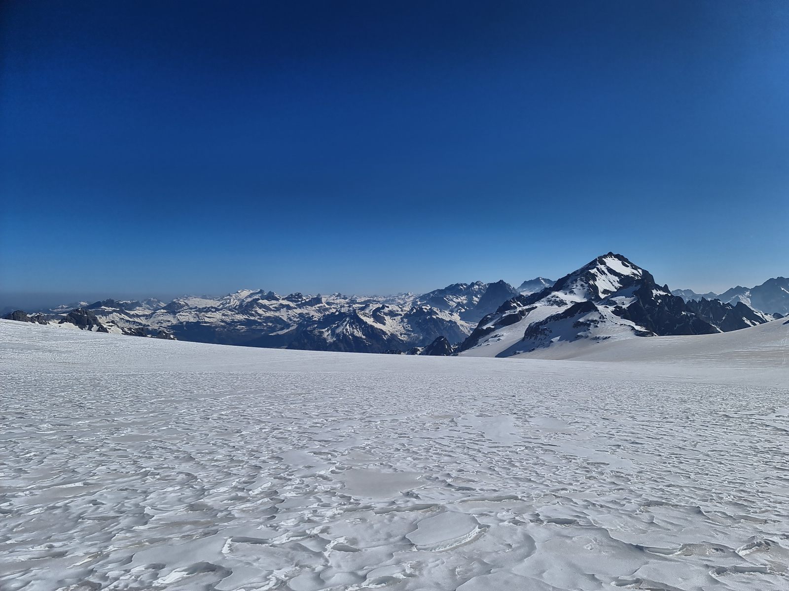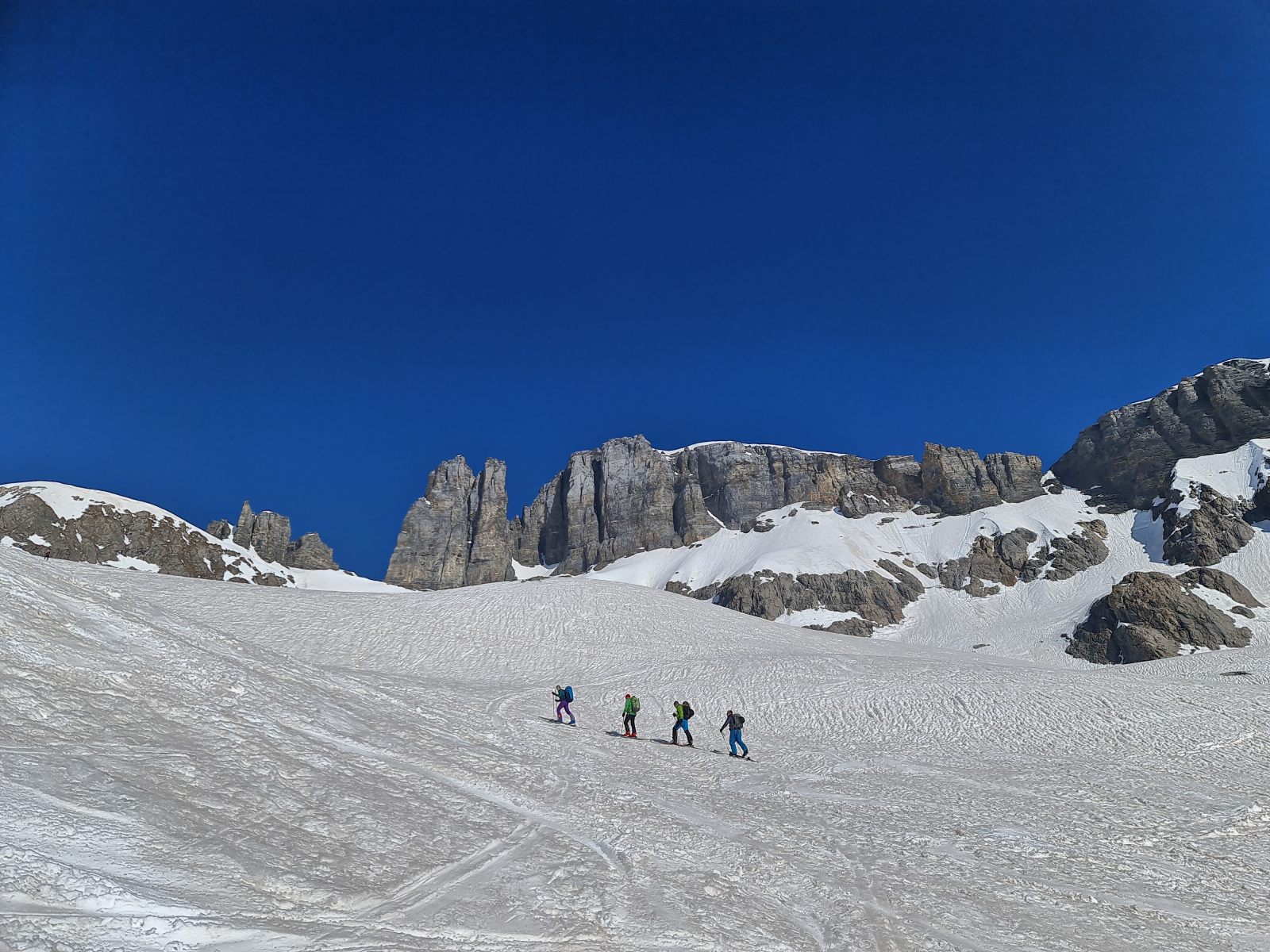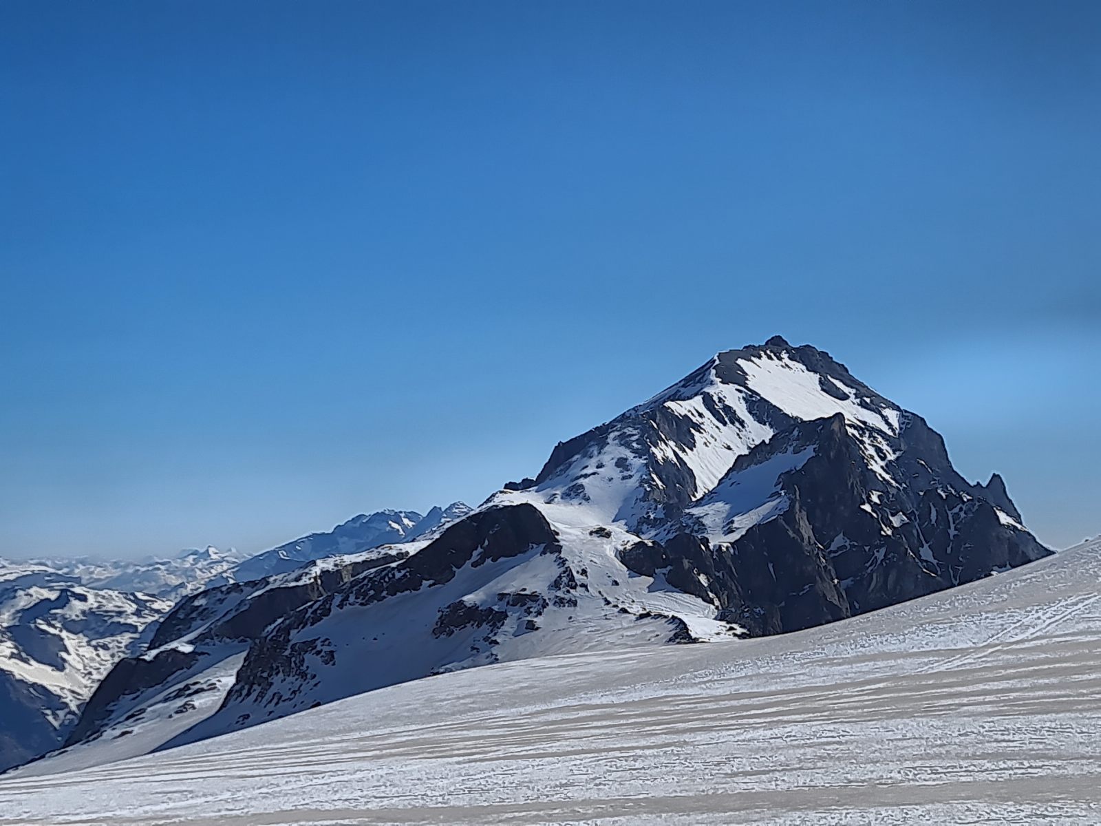 Der Aufstieg zum Gross Spannort führt derzeit ganz links aussen durch eine kurze Rinne und über einen Firnhang zu einer Traverse unter den Felsen, bevor durch einen engen Schlitz zur Schulter hochgestiegen wird. Die Firnverhältnisse waren sehr gut und die Spur sehr sicher. Von der Schulter wie üblich über die kurze Kletterpassage und weiter zum Gipfel. Weil die ganze Zeit ein giftiger Südwind pfiff, verweilten wir nur kurz und machten uns an den Abstieg. Mit einer Gruppe dauert der ebenso lange wie der Aufstieg. Insbesondere im letzten Firnhang muss mit über den Pickel gesichert werden.