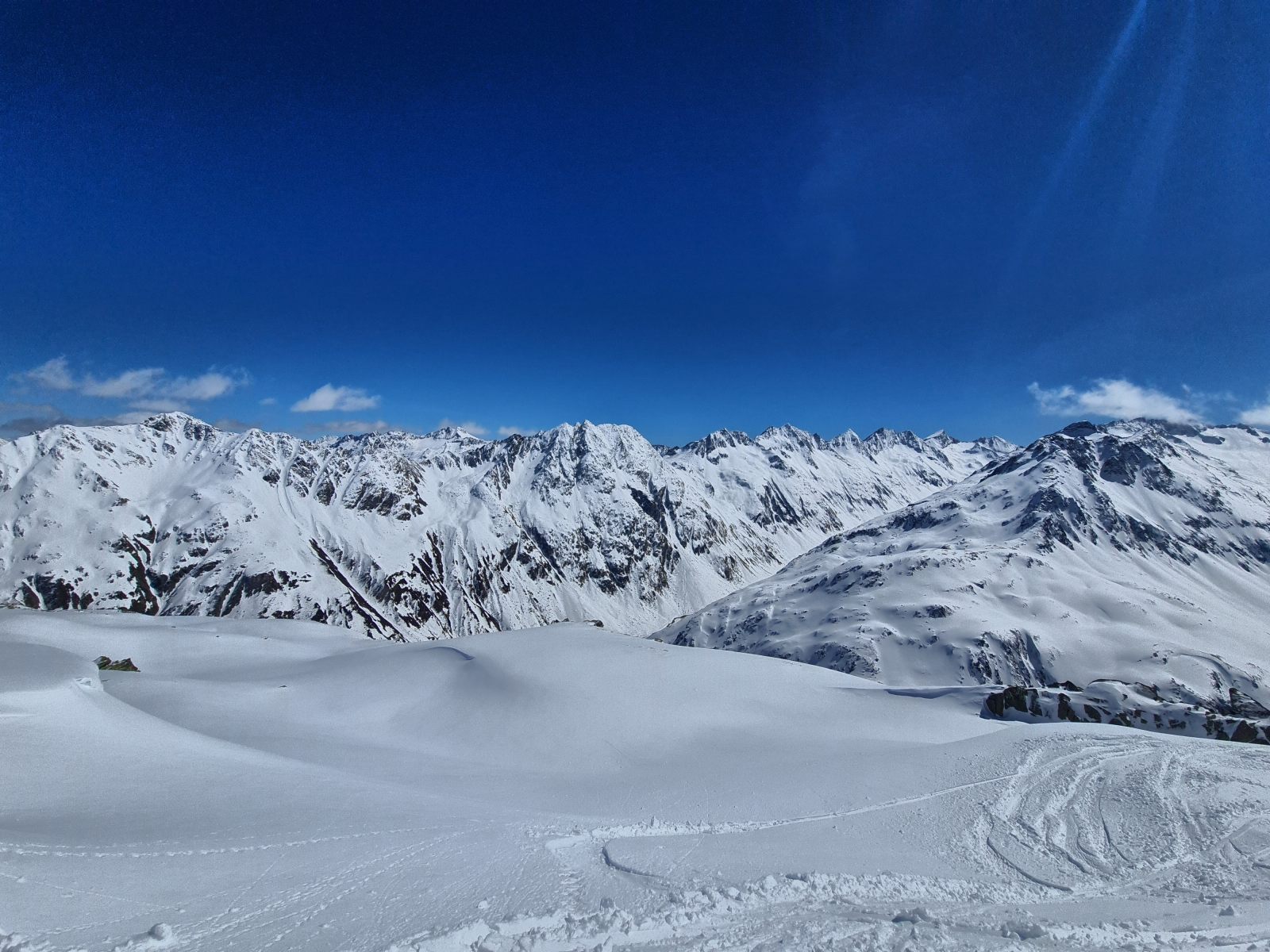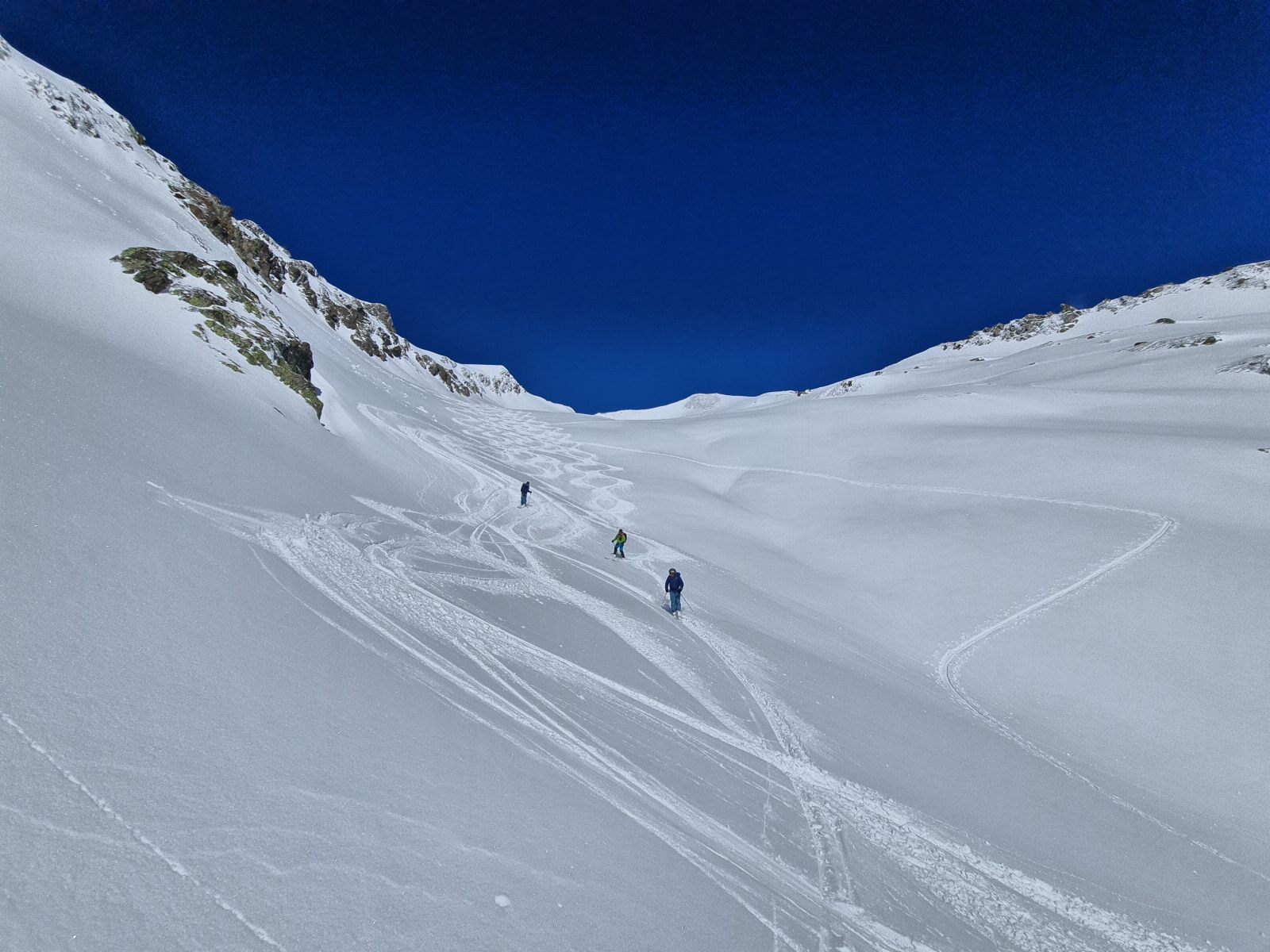 Hochwinter im April! Nach Orkanstürmen und Stauniederschlägen bis in tiefe Lagen gibt es das volle Spektrum bis hin zu Frühingsverhältnissen. Zum Start auf dem Oberalppass dichte Wolken mit Schneefall, danach saukalter Wind bis zur Martschallücke*, dort abrupter Wechsel zu Windstille und Wärme. Abfahrt im Pulverschnee zum Tumasee (dem Ursprung des Rheins), gefolgt von einem nordisch kombinierten Teil über den gefrorenen See — sozusagen ein Engadiner Skimarathon im Kleinstformat. Die Abfahrt ins Maighelstal dann auf tragender Unterlage mit dünner, aufgeweichter Neuschneeschicht — alles toll zum fahren! Hüttenaufstieg bei frühlingshafter Wärme, ebenso die Mittagsrast auf der Terrasse der freundlich bewarteten Maighelshütte.