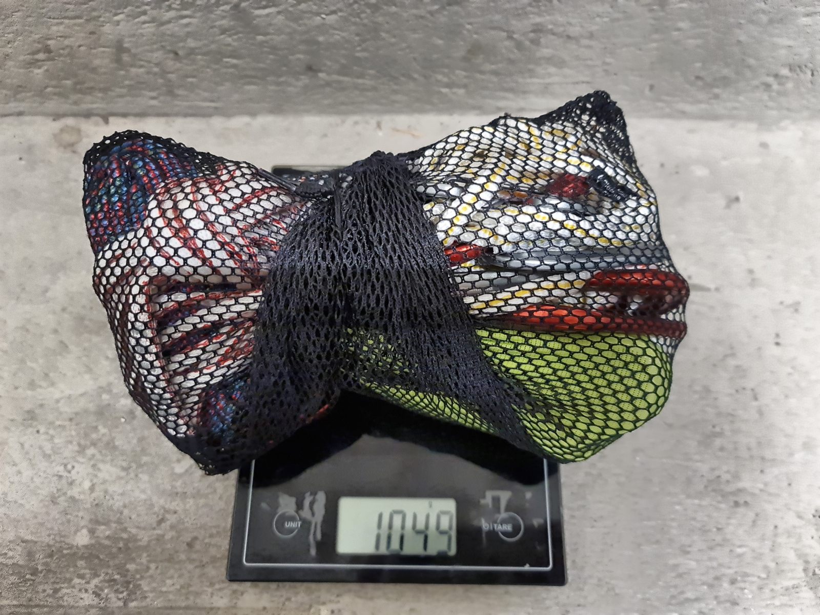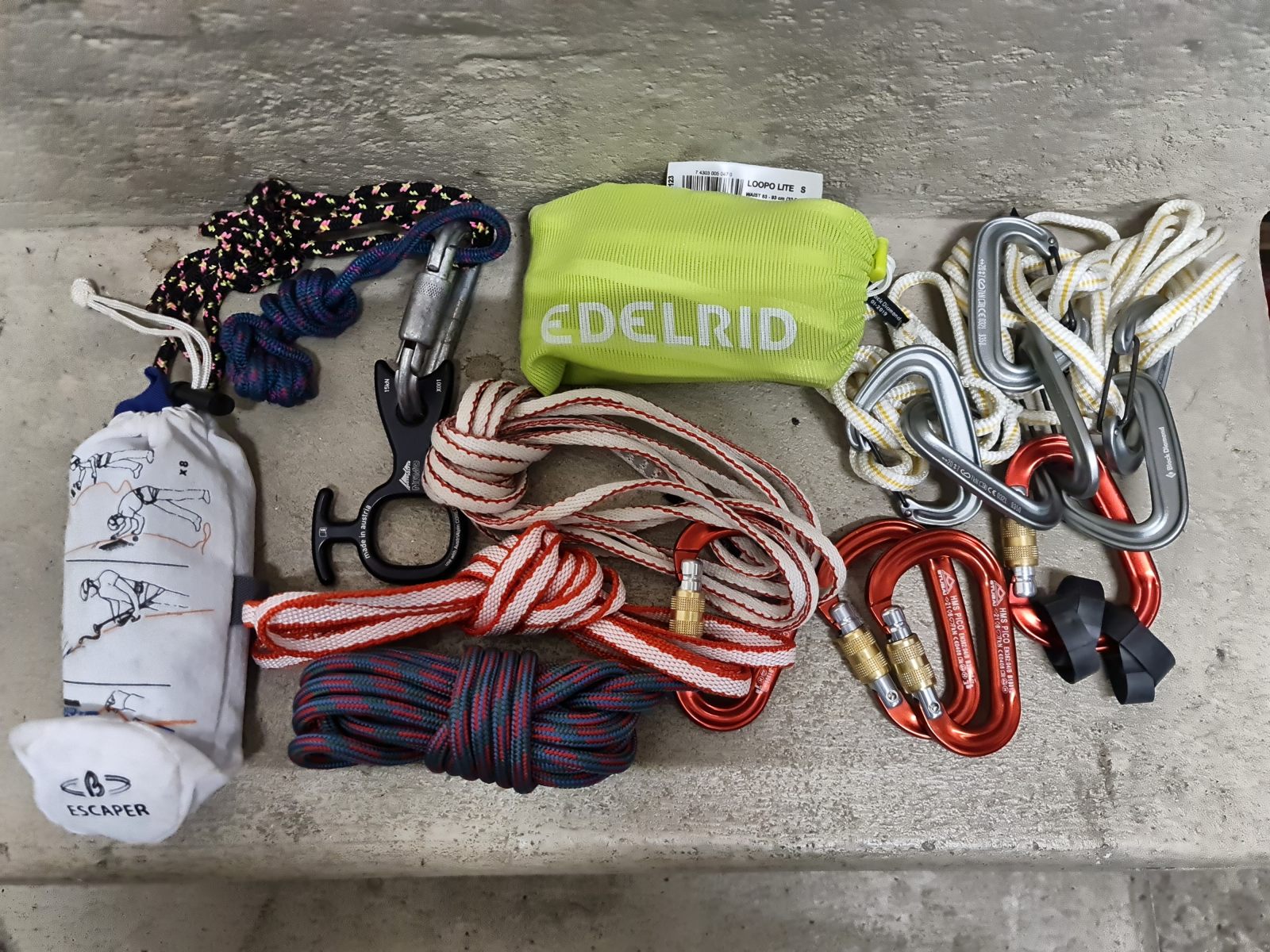 - Kletterzeug (Klettergurt Loopo Lite, 3x HMS-Karabiner, Abseilverankerung Escaper, Abseilgerät Nemo, Schlingen, 3x Express) = 1.0 kg