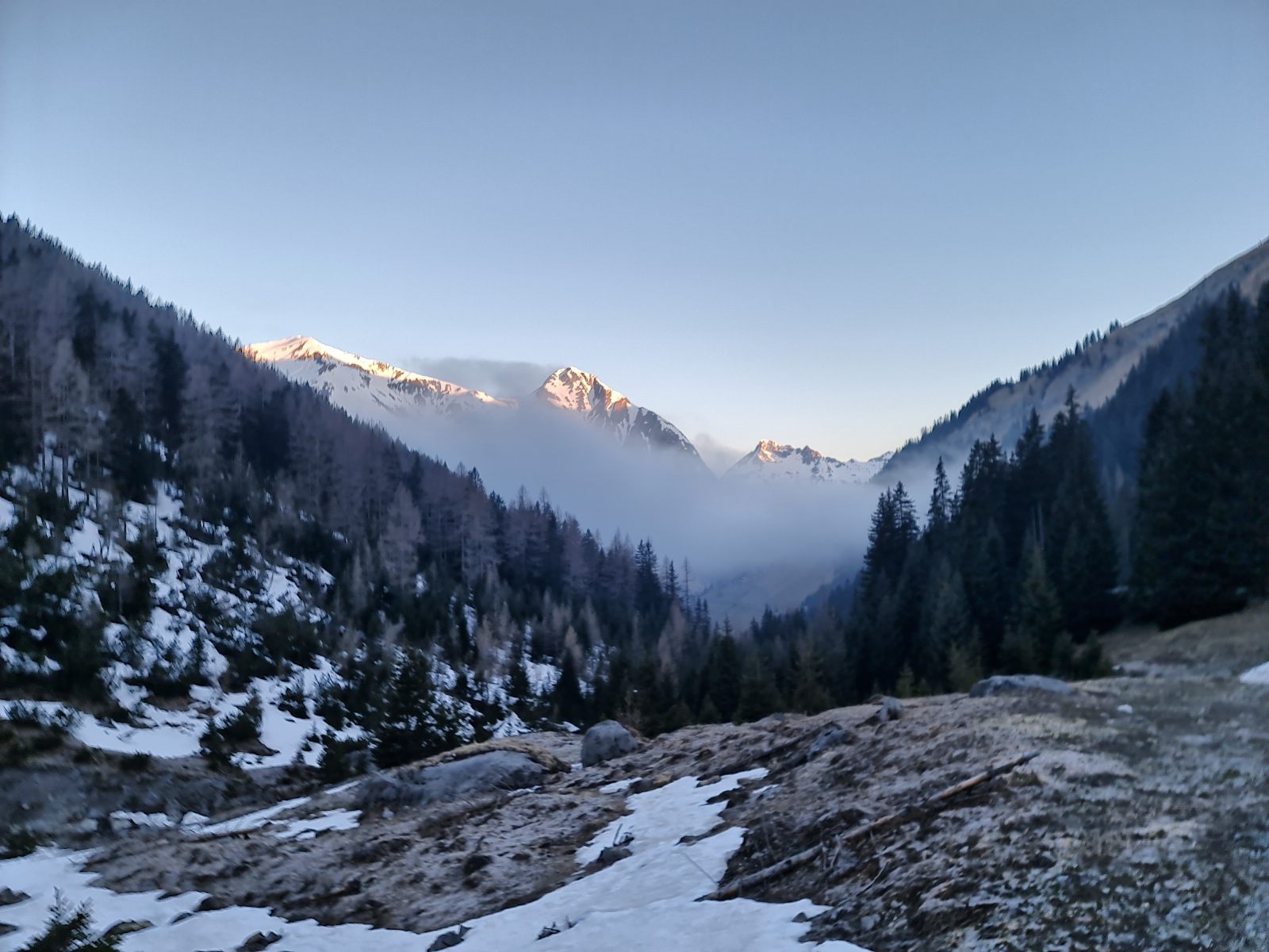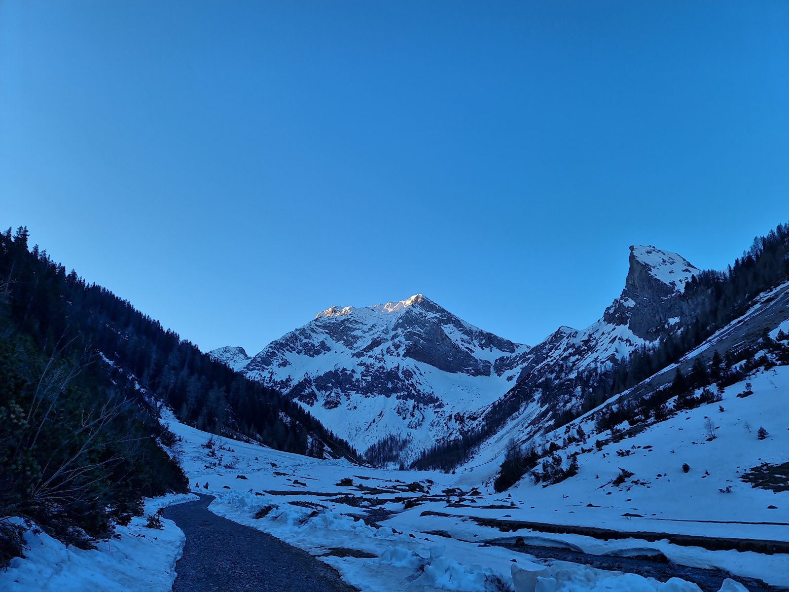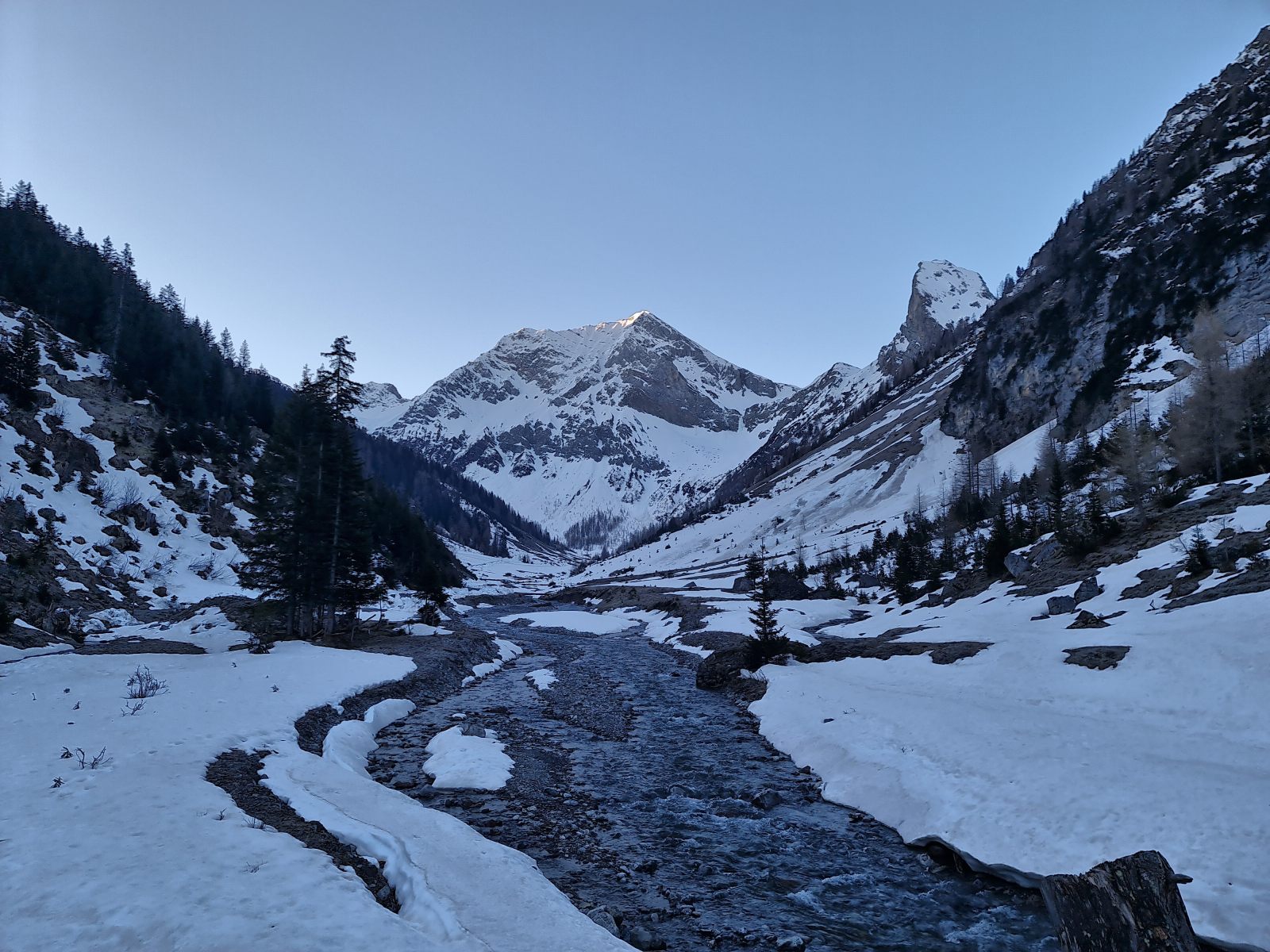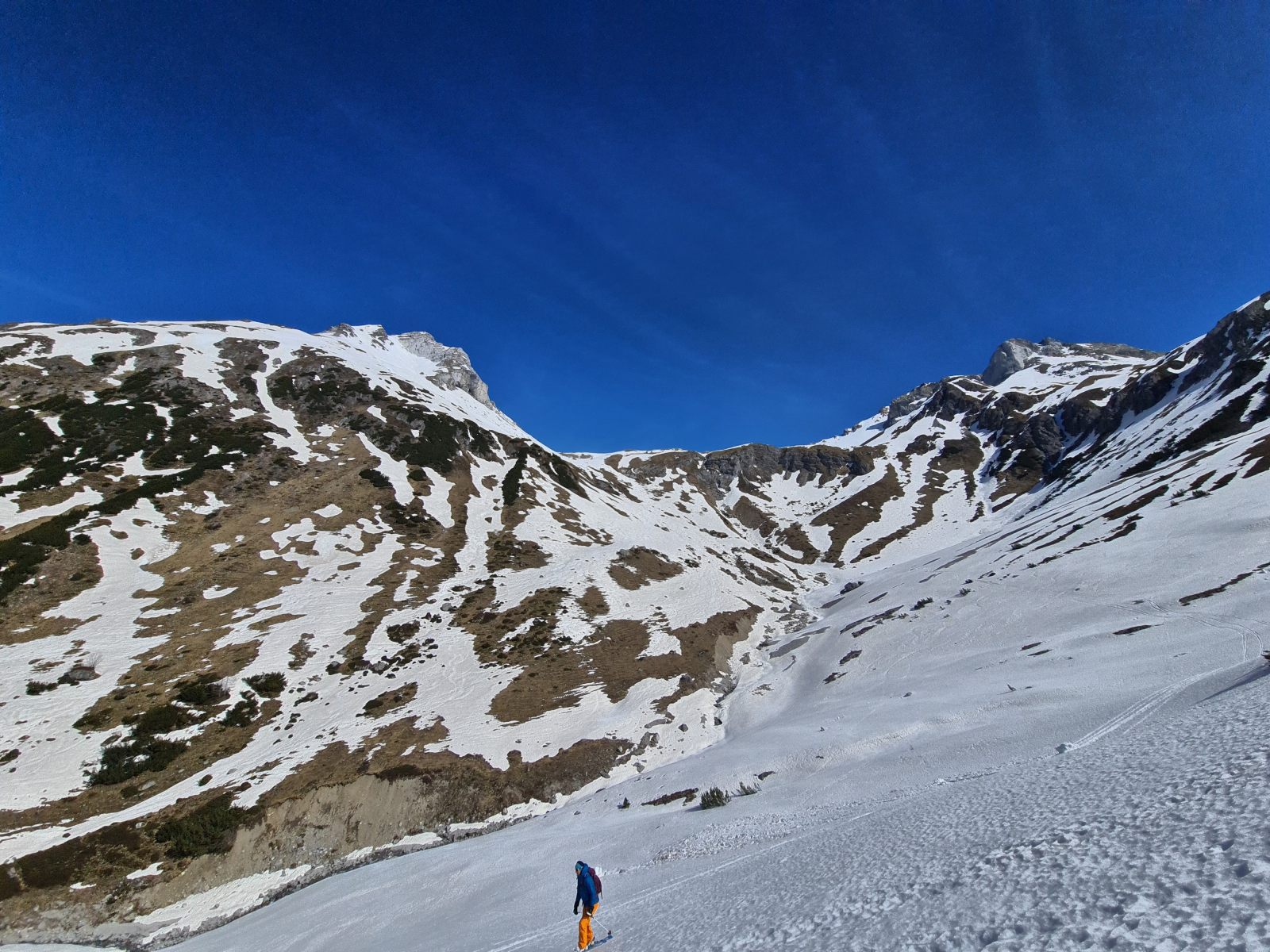 Tirol, Land der Berge! Nach Kletterwand und Trailrun machen wir uns unter kundiger Leitung von Ramona auf ins Lechtal, wo wir bis zu Kaisers auf gut 1500 müM mit dem Auto fahren können. Die Strasse war sogar bis auf 1700 müM geräumt, aber das wussten nur einige wenige und brachten das Fahrrad mit. Wir pilgerten rund eine Stunde zu Fuss ins Tal hinein und stiegen bei der Kaiseralpe in die Bindungen. Steiler wurde es erst nach einer weiteren halben Stunde, und prompt verabschiedete sich ein defektes Harscheisen im Aufstieg zum Seelein auf rund 2200 müM.