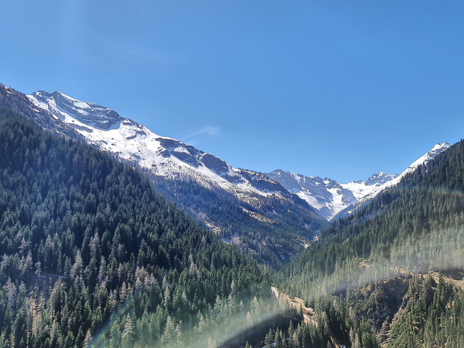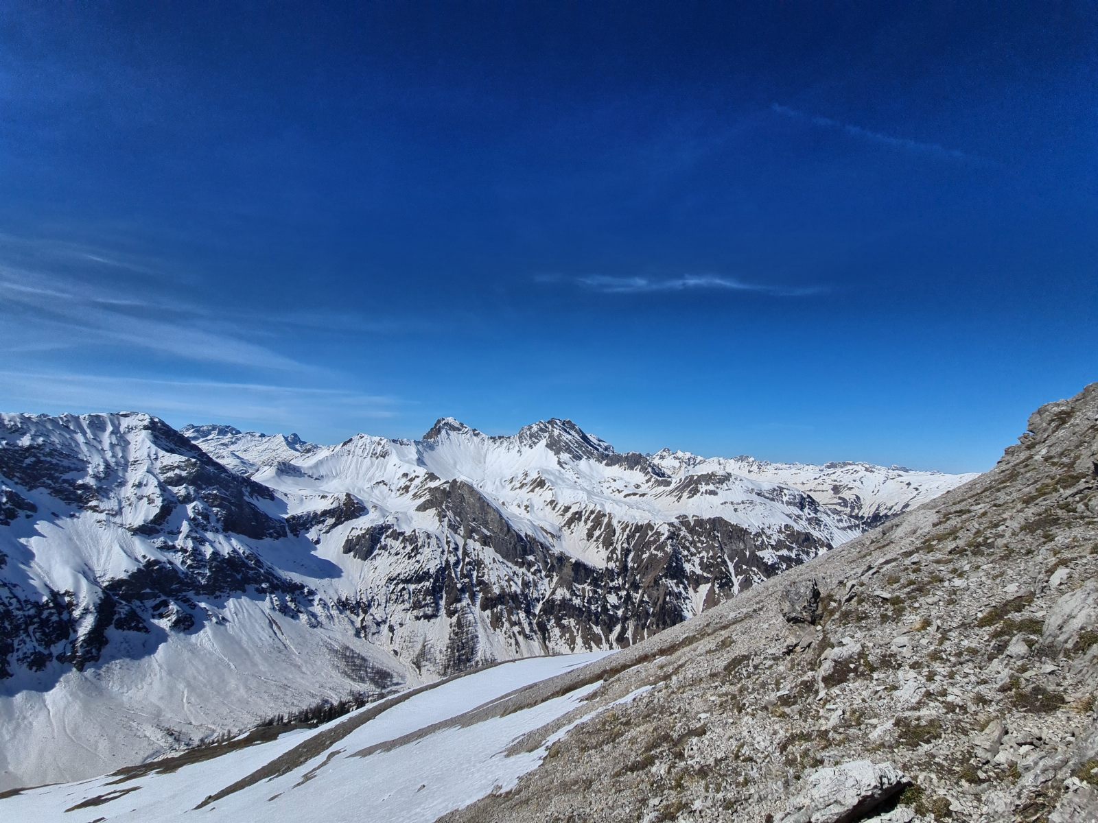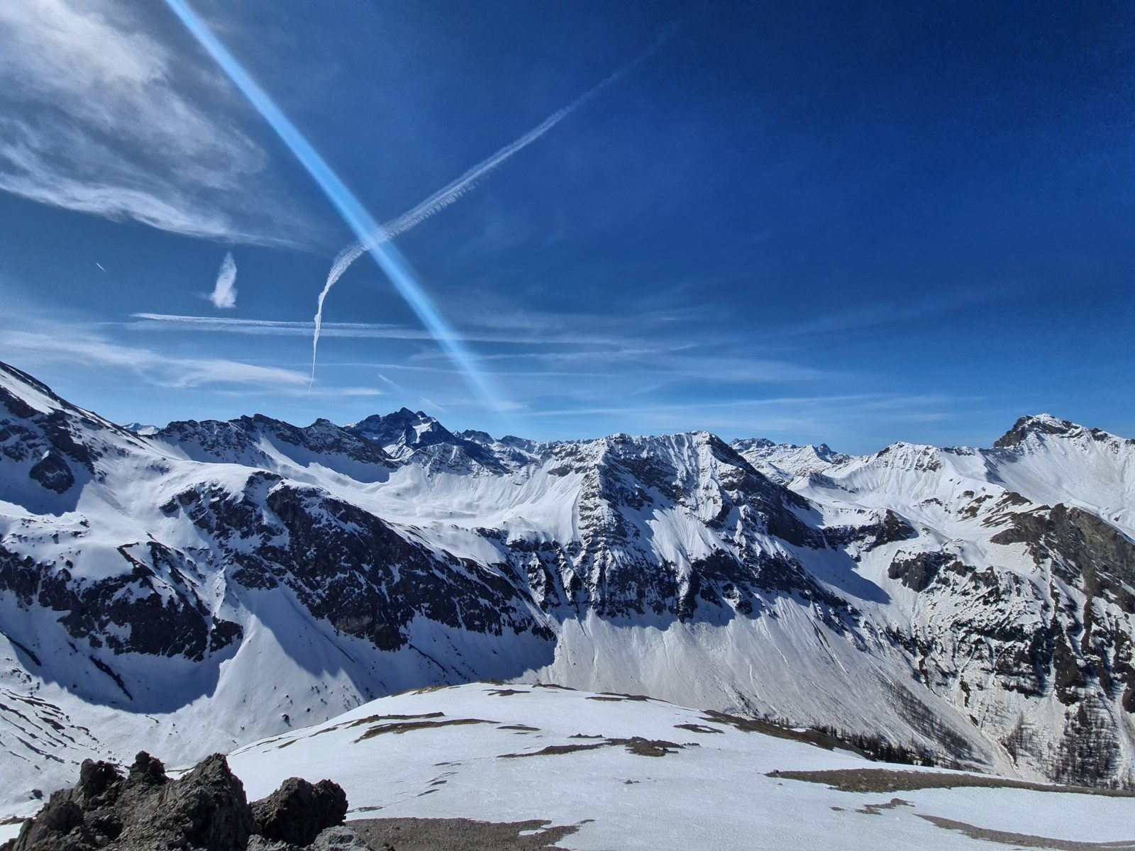 So wurde es nichts mit dem avisierten Ziel Feuerspitze, und wir bogen ab Richtung Aples-Pleisspitzen. Der Hang war von der Aprilsonne schon innert kürzester Zeit recht gut aufgesulzt, und zudem lockten mich die Lawinenknollen im steilen Schlussaufstieg gar nicht. So schwenkten wir links auf die Gratfelsen bei ca. 2500 müM. Von dort genossen wir eine Abfahrt mit tollen Verhältnissen und konnten es bis nach der Kaiseralpe laufen lassen — und den mussten wir laufen. Im Gasthof Vallugablick in Kaisers* genossen wir an deren letztem Öffnungstag vor der Zwischensaison Speis, Trank und Sonnenschein auf der Terrasse.