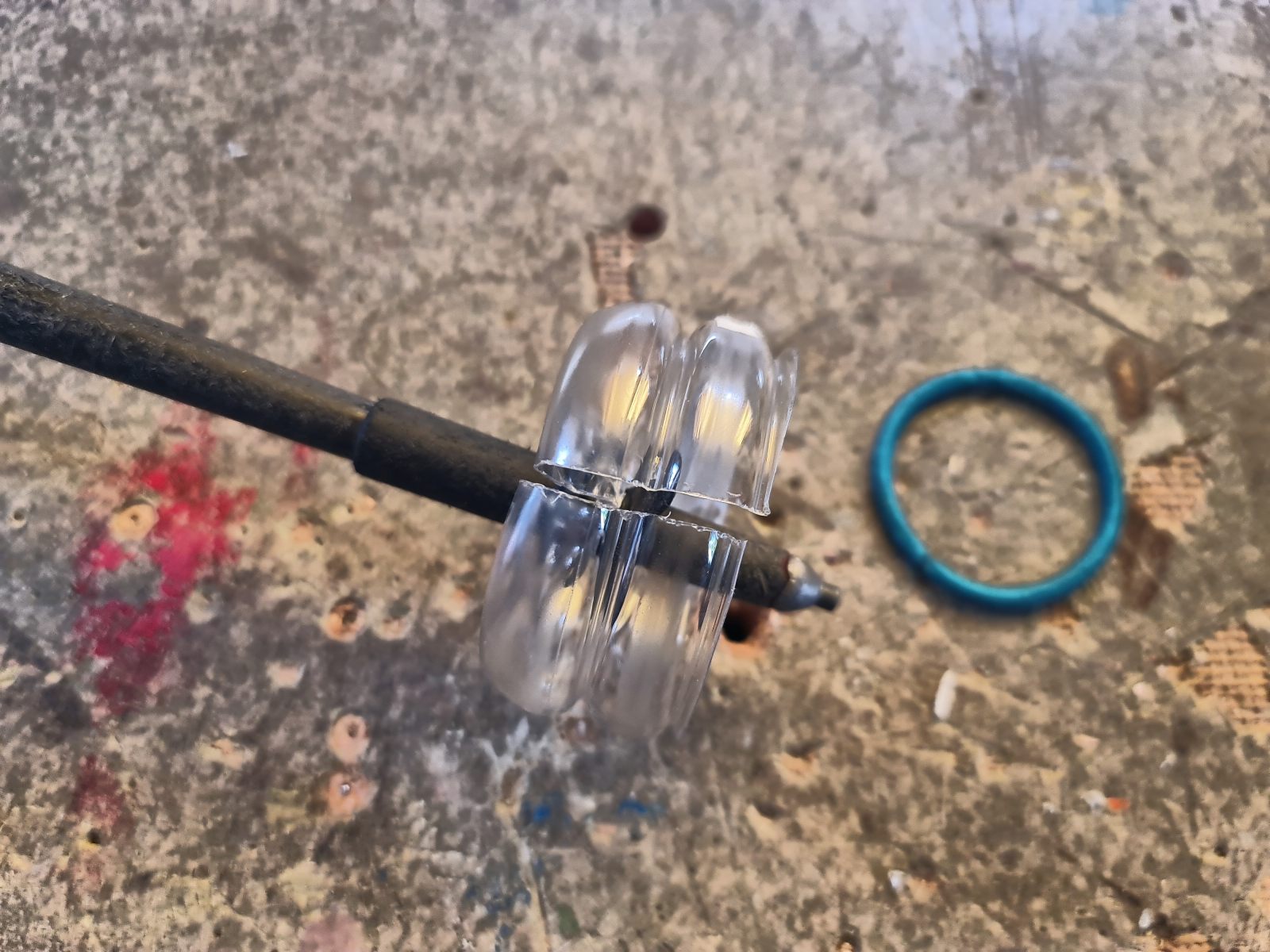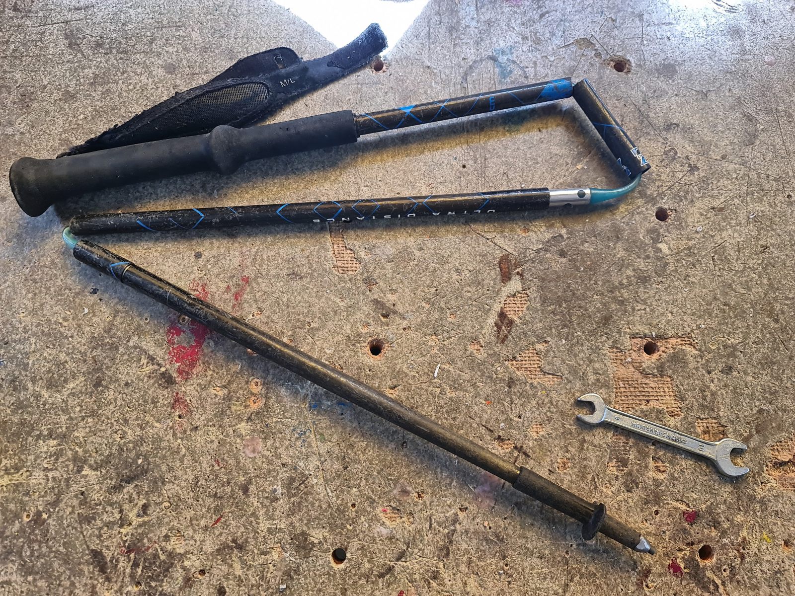 Schon seit längerer Zeit habe ich an einer Lösung herumstudiert. Eigentlich ist es ja ganz einfach; man muss nur einen grösseren Stockteller anbringen. Im Detail stellt sich die Frage, wie man diesen Teller befestigen soll; zumal das im Feld geschehen soll und zwar schnell und ohne grossen Aufwand. Unterhalb des bestehenden Tellerchens ist das Anbringen einfach, jedoch die sichere Befestigung unklar. Oberhalb wäre die Gefahr von Verlust wohl klein, dafür wäre es wohl schwierig, den Teller am glatten Karbonstängel zu fixieren, sodass sie nach oben rutschen könnte. Ein lottriges Gebastel wäre mehr ärgerlich als hilfreich. Schliesslich stellt sich die Frage nach dem Material. Stabil und leicht muss es sein, zudem muss noch flexibel und bruchfest.