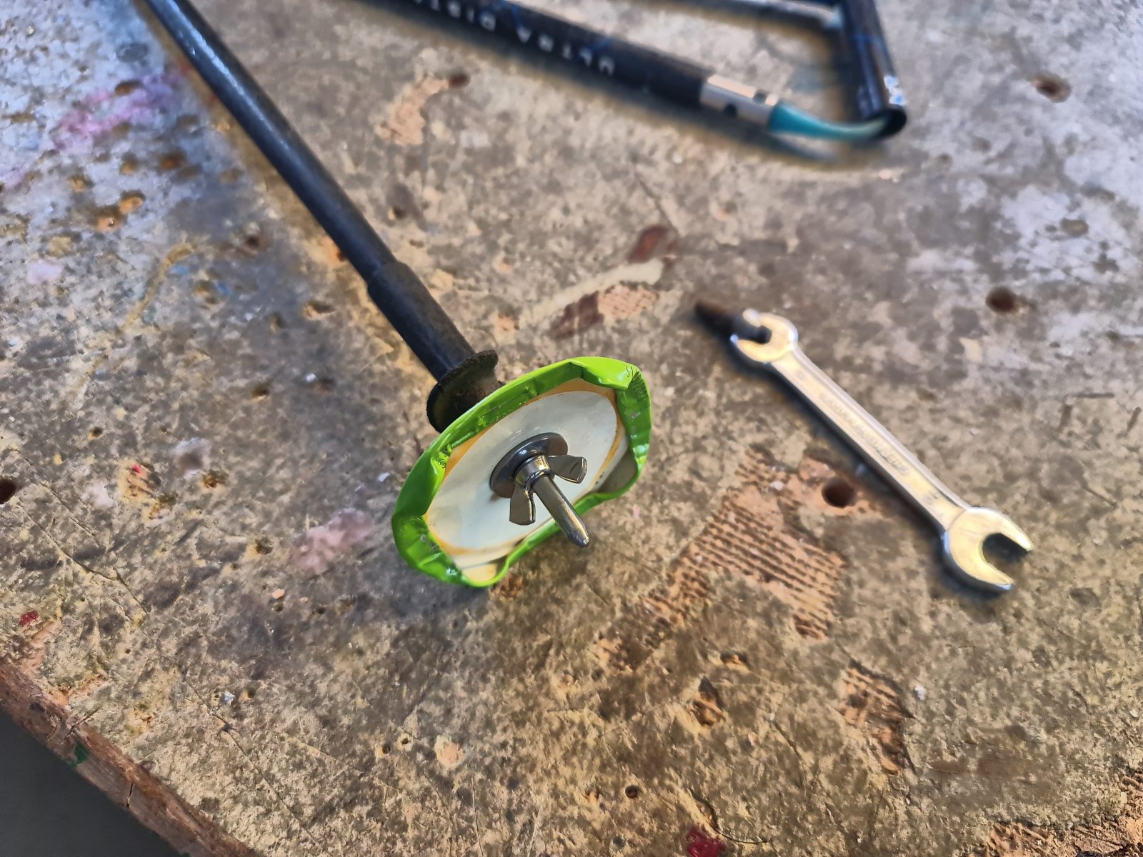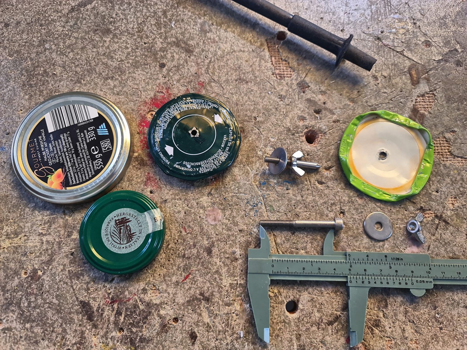 Eine erste Idee beruhte auf der Einsicht, dass das Gewinde der eingeschraubten Spitzen der “Distance Carbon Z” Stöcke von Black Diamond eine Befestigungsmöglichkeit ermöglicht. Mit einer Konterverschraubung lässt sich ein Blechdeckel an einem Ersatzdorn sicher befestigen. Als Dorn verwendete ich ein 40mm lange Inoxmetallschraube von 5mm Durchmesser, von der ich den Kopf abgetrennt hatte, sodass sie auf 40mm gekürzt war (22mm Gewinde). Die Gewindetiefe beträgt 25mm, und die Schraube muss nicht satt eingeschraubt sein, denn sie wird durch die Konterschraube fixiert. Als Teller verwendete ich den Schraubdeckel eines Aufbewahrungsglases. Das ganze sieht recht vielversprechend aus; nachteilig ist allerdings das nicht unerhebliche Gewicht (20g pro Teller) zusammen mit dem recht aufwändigen Wechselverfahren.