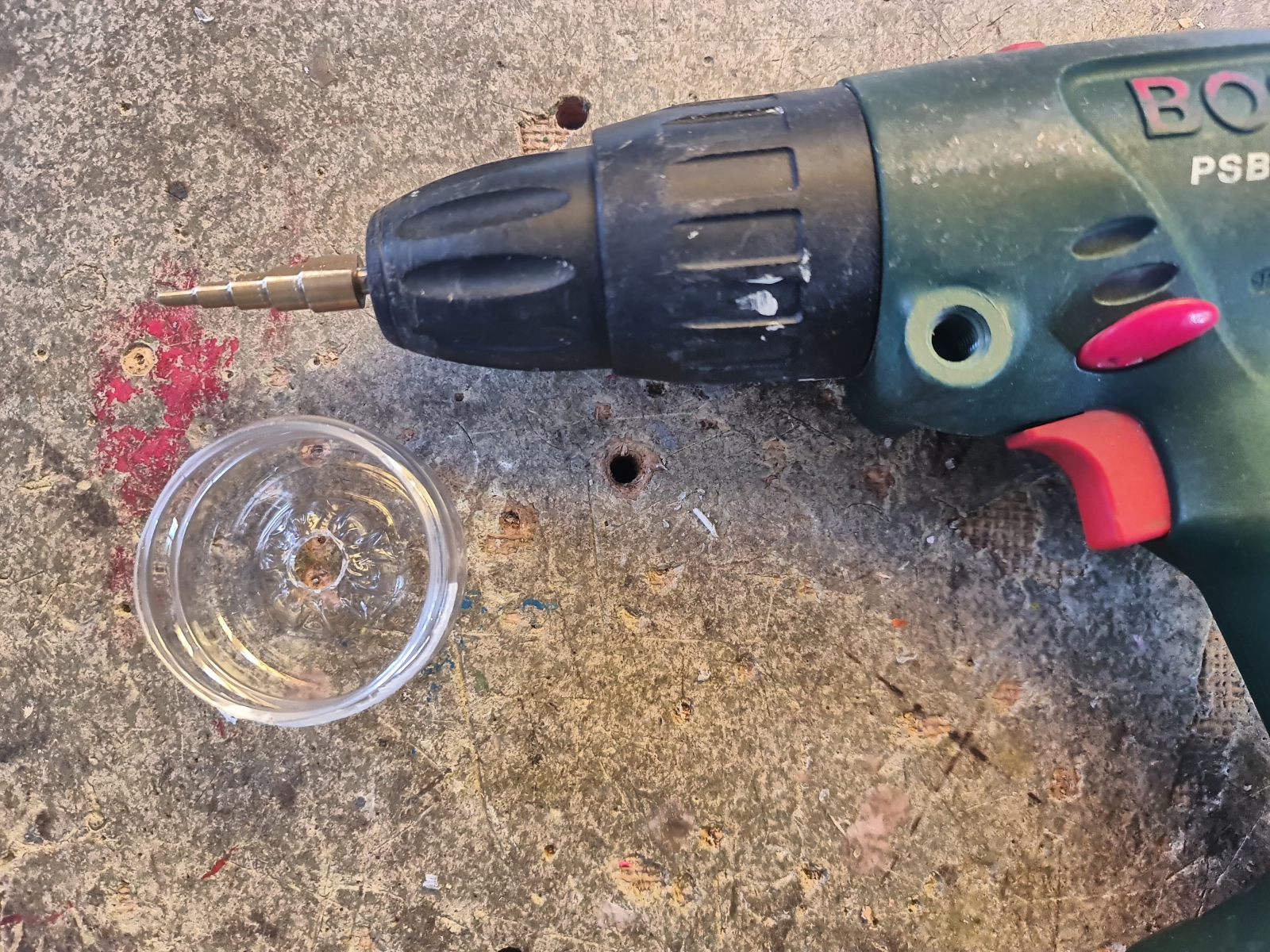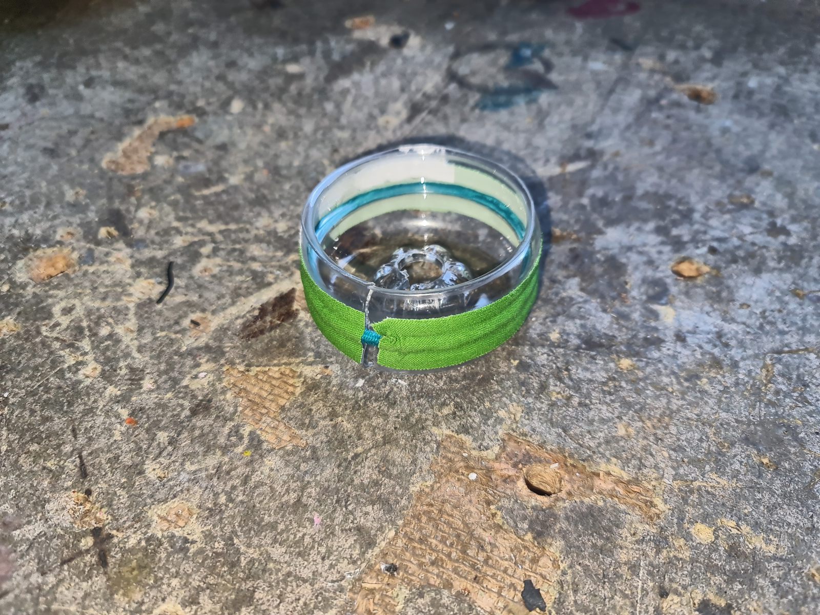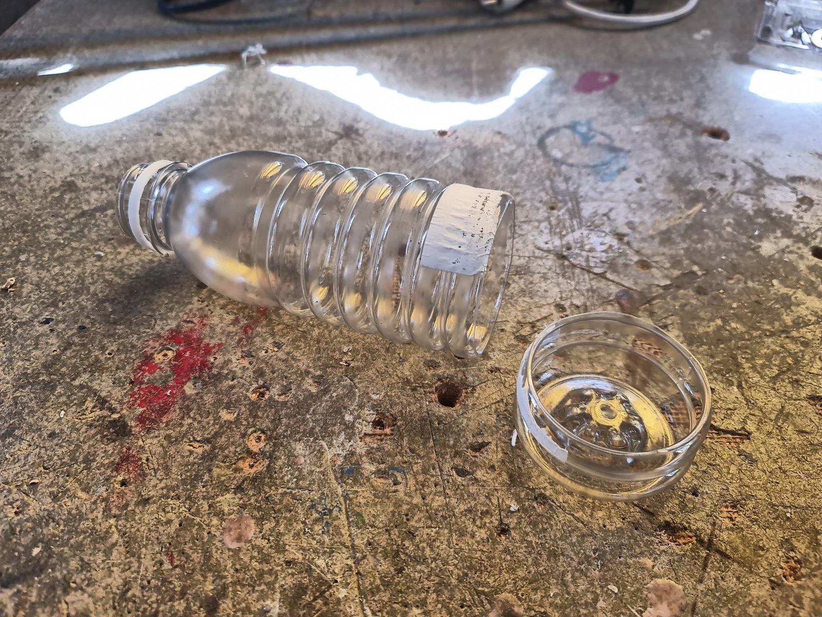 Damit hatte ich mich schon abgefunden, als ich eine ganz andere Idee hatte. Weshalb nicht irgendwie eine PET-Flasche verwenden? Genaue Vorstellung hatte ich keine, und ich konnte mir auch nicht ausmalen, wie das erstens halten sollte, und ob so etwas zweitens ausreichend stabil sein könnte. Eigentlich probierte ich diesen Ansatz mehr der Vollständigkeit halber aus, und das dünnwandige Getränkefläschchen lieferte nichts Brauchbares. Bemerkenswert jedoch, wie stabil der PET-Flaschenboden im Zentrum war. Mit einer dickwandigen PET-Flasche erfüllte das Resultat alle meine Erwartungen.