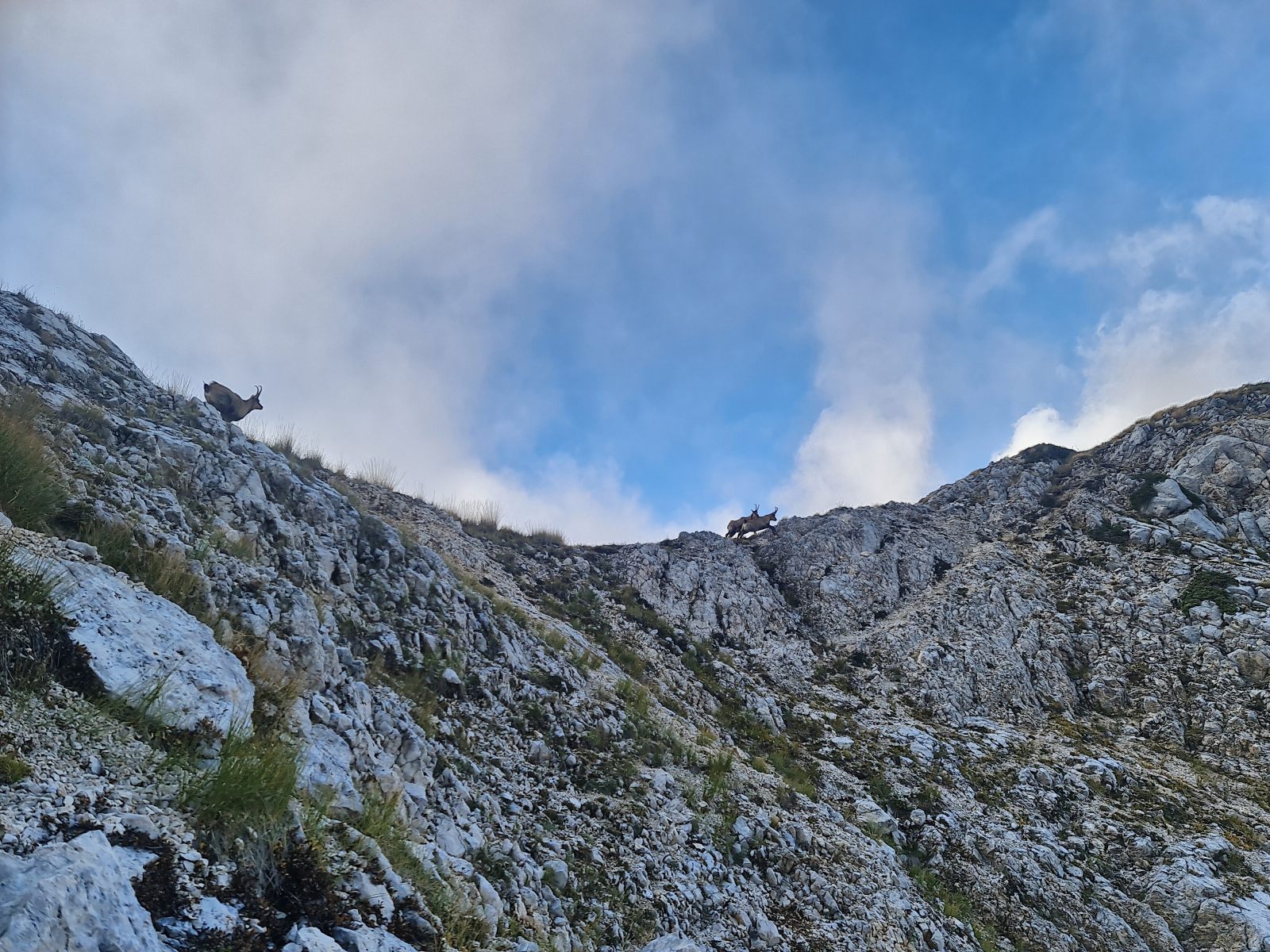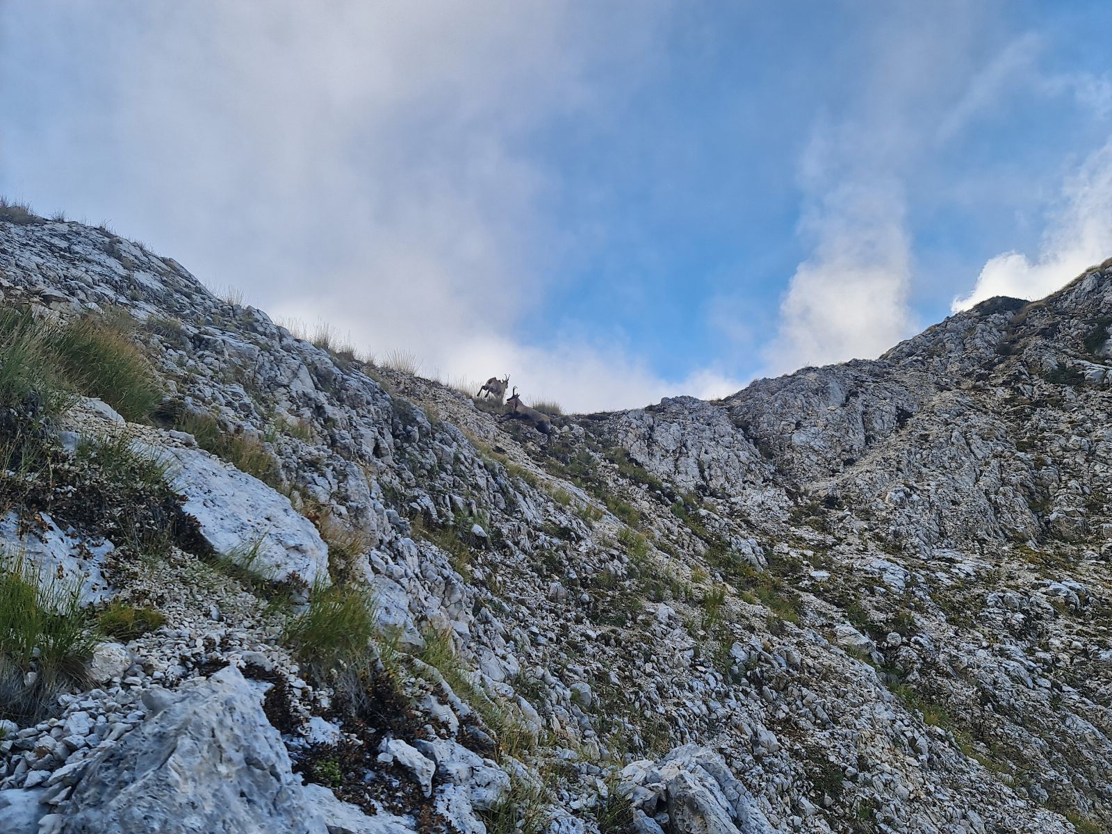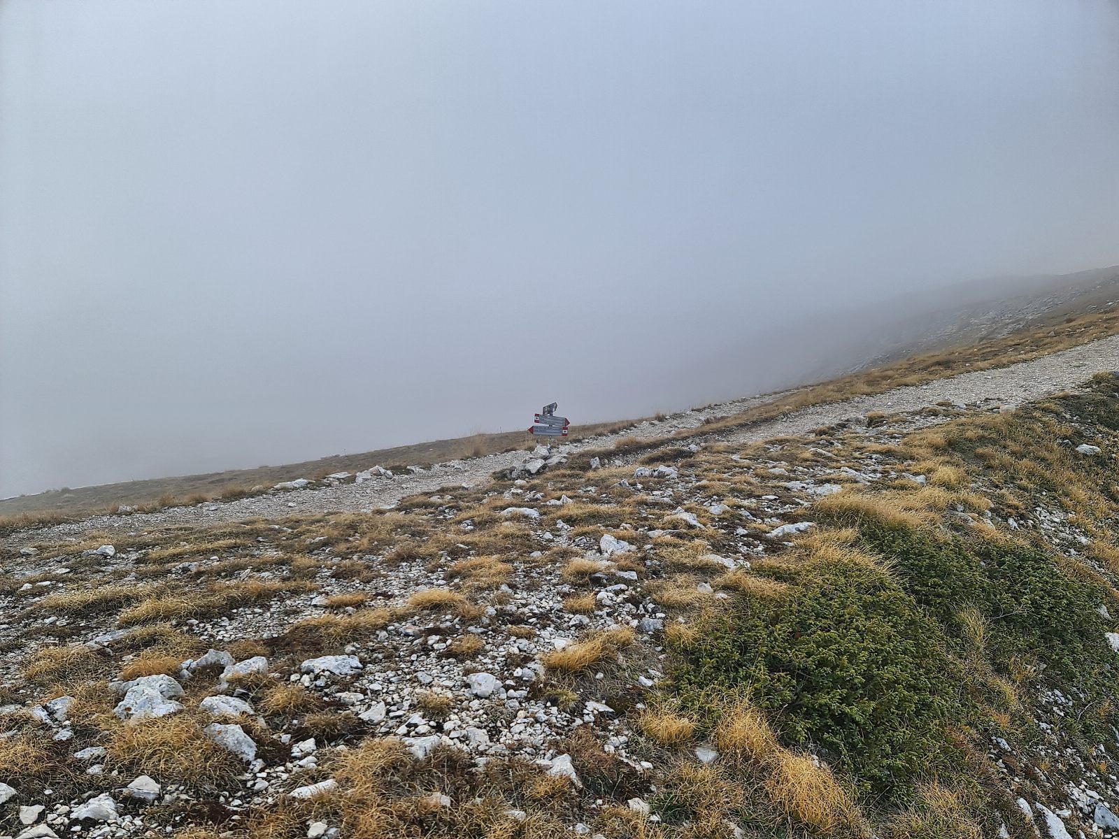 Die Wolken sind tiefer gesunken, als ich mich zum Rifugio Garibaldi aufmache. Es handelt sich um die älteste CAI-Hütte auf dem ganzen Appenin. Derzeit scheinen Umbauarbeiten im Gang zu sein. Nach einem kurzen Augenschein steige ich wieder zur Sella hoch, um auf direktem Weg zurückzukehren. So direkt wäre der Weg nicht gemeint gewesen, wie es dann ablief. Im steilen Abstieg erlebe ich eine Schrecksekunde, die mit Glück nicht zur finalen wird. Im Nachhinein ist man immer klüger, und ich hatte genügend Zeit, um die Situation zu überanalysiseren, sodass ich heute festhalten kann, dass Rock’n Roll und Schlaghosen eine sehr ungünstige Kombination darstellen.