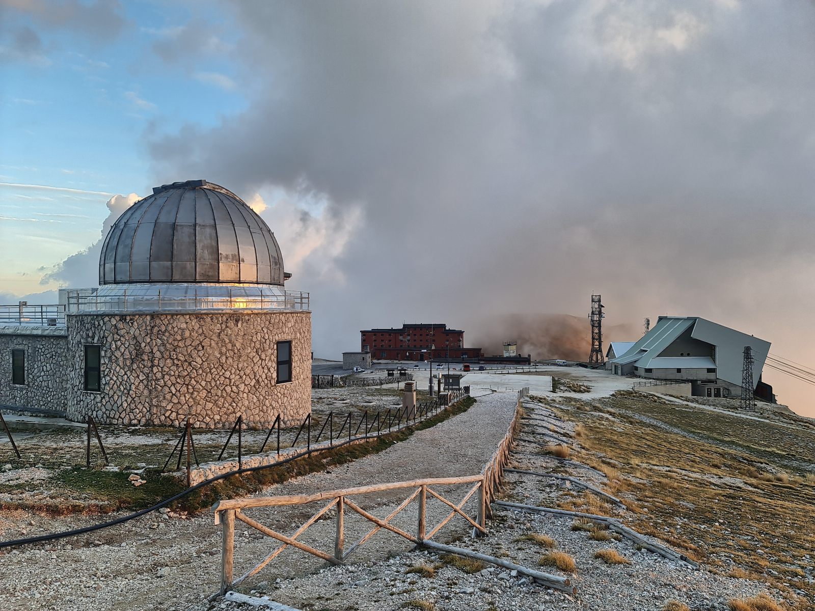 Campo Imperatore schlägt dann fast dem Fass den Boden heraus! Eine Hotelarchitektur sondergleichen krümmt sich im ockerroten Halbbogen gegen Süden, daneben ragen ein astronomisches Observatorium sowie eine futuristisch moderne Seilbahnstation neben der alten in traditioneller Steinbauweise empor. Überwältigt von Rom mit seinen antiken Baudenkmälern, bin ich nicht weniger beeindruckt von dieser Szenerie hier.