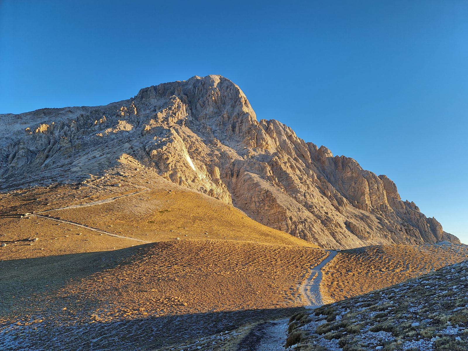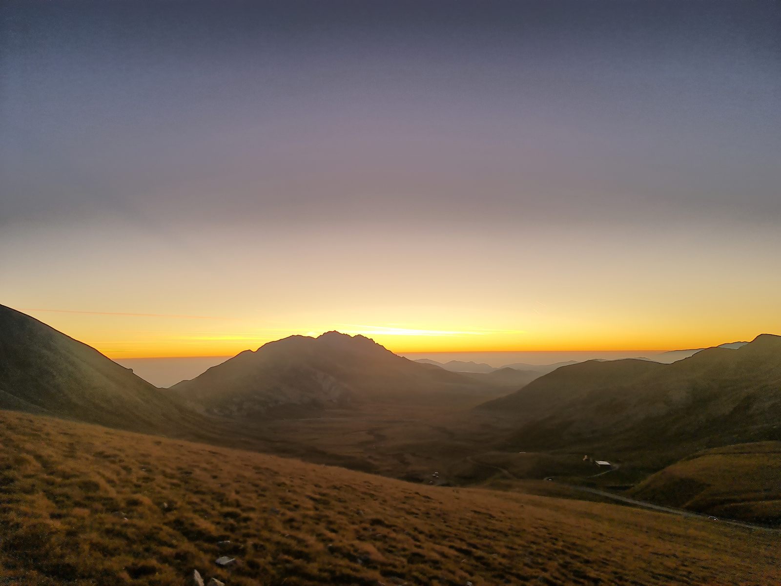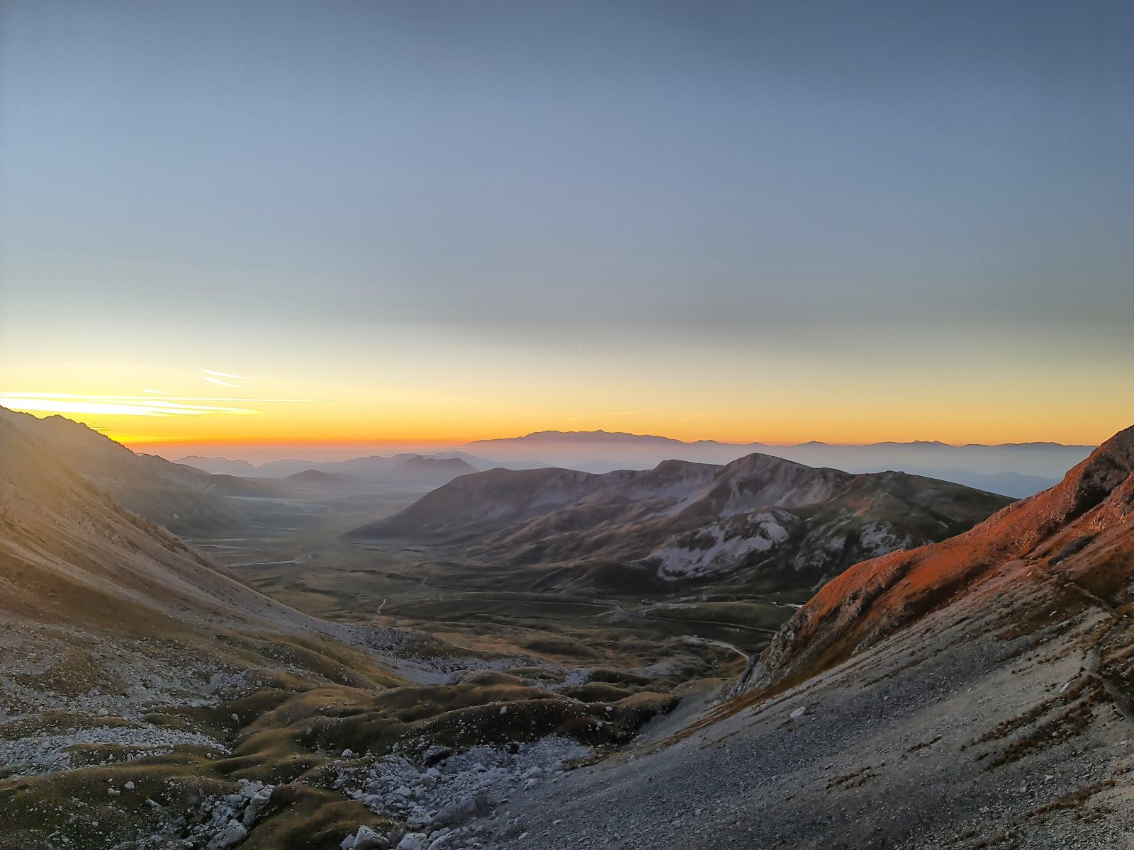 Mit Start bei Tagesanbruch lässt sich der Aufstieg zum Corno Grande in Ruhe geniessen. Die ersten Autolichter kriechen aus dem Tal über die Hochebene gegen Campo Imperatore hoch, als ich losziehe. Allerdings zieht der Rucksack heute aussergewöhnlich stark in Richtung Erdmittelpunkt. Keine Angst, beim gestrigen Überschreiten des Observatorium ist (vermutlich) nichts schiefgegangen! Es ist nur die vollständige Ausrüstung für Klettersteig, Abseilerei und Biwakübernachtung zusammen mit Wasser und Lebensmitteln für drei Tage, die sich schwerwiegend bemerkbar machen.