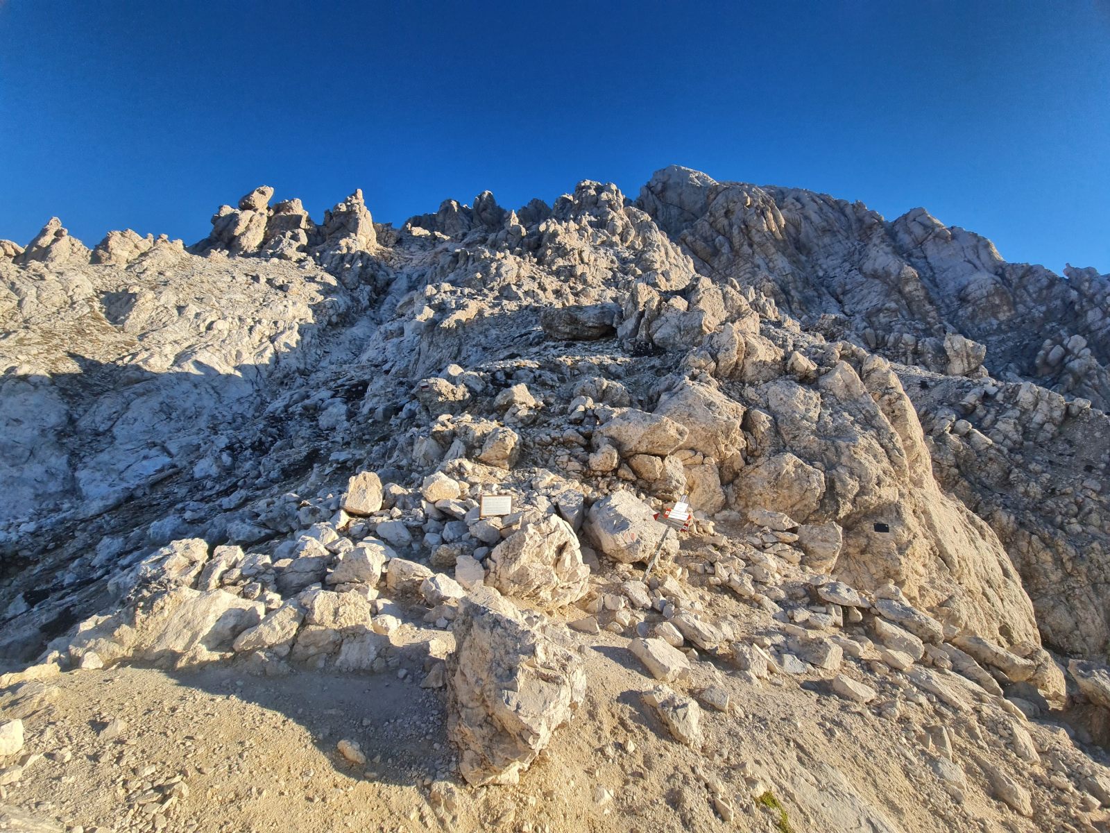 Im Aufstieg zum S-Grat werde ich von einem hageren Einzelgänger überholt, der bald schon aus meinem Blickfeld verschwindet. Ganz so langsam bin ich nun auch wieder nicht unterwegs, aber der da steigt behende wie eine Gämse zur Salzlecke! Ich hingegen stosse mich mehr wie eine Kuh auf einer steilen Alpweide hoch, langsam und laut schnaufend. Oberhalb des Sassone (dem “grossen Stoa”) erreiche ich bald die Abzweigung zur Via Ferrata Bafile, welche zum gleichnamigen Biwak führt. Unter einem Felsblock verstaue ich Übernachtungsmaterial und Lebensmittel, bevor ich mich für den Aufstieg über die Via Diretissima degli Alpini rüste.