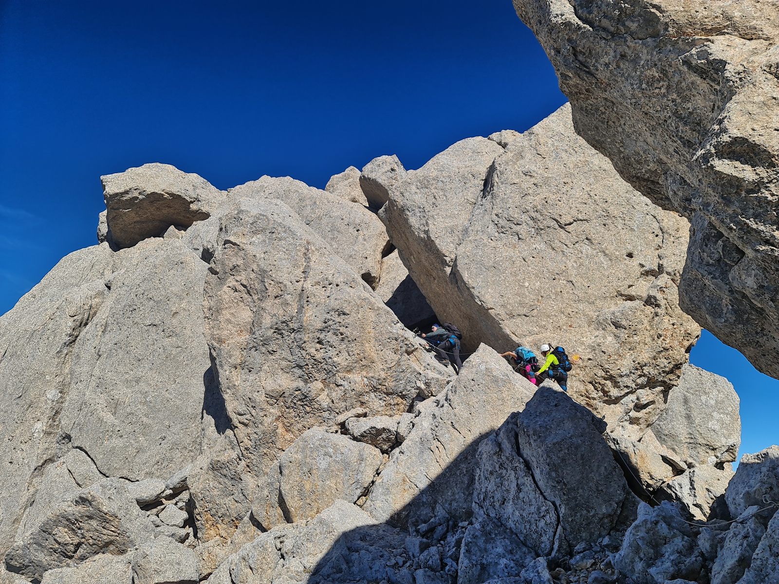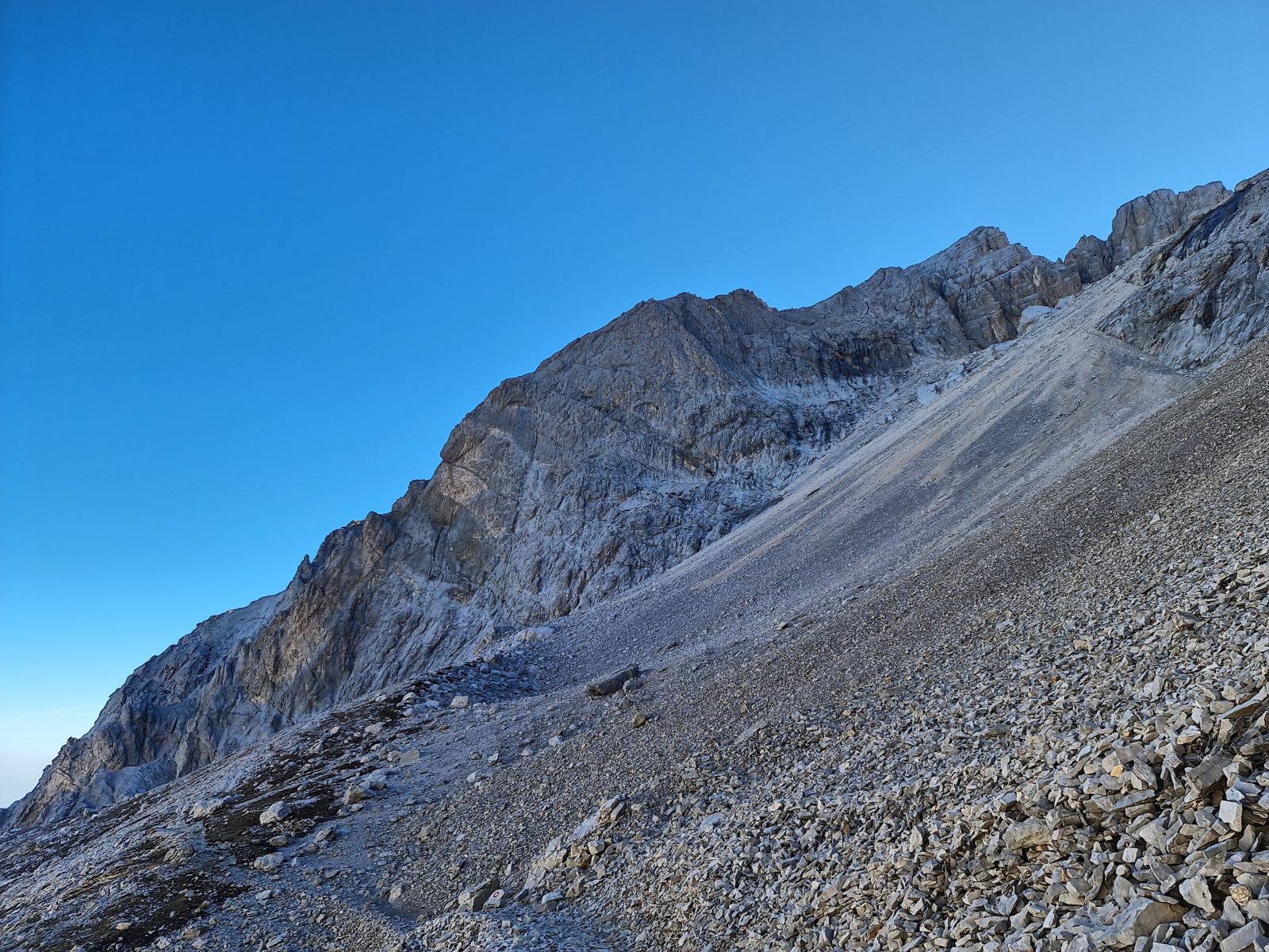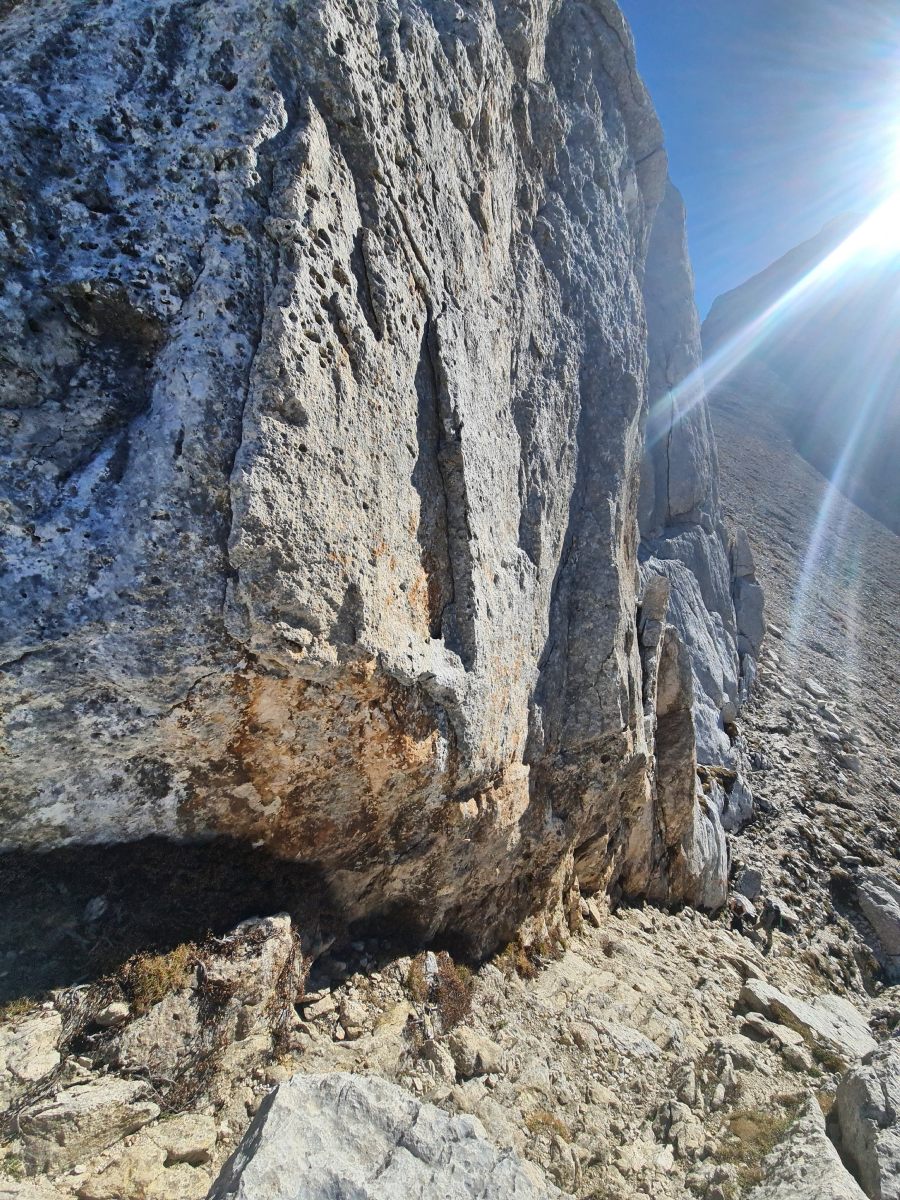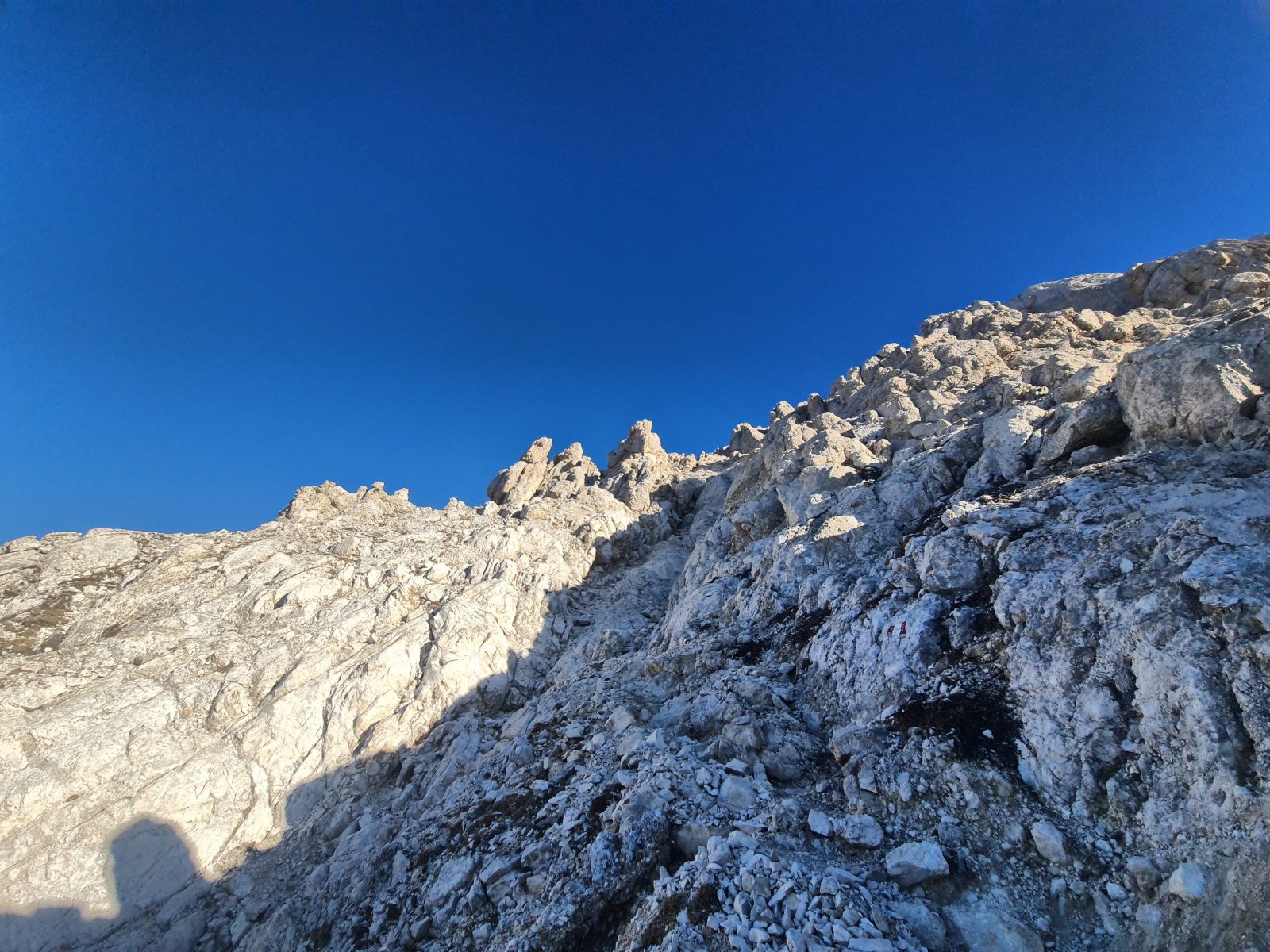 Der Abstieg verläuft über die Via Normale, deren Einstieg auf der NW-Schulter bei ca. 2950müM liegt. Sie führt mehrheitlich horizontal zum Ausgangspunkt zurück. Die Zweiteilung von Auf- und Abstieg ergibt eine wirklich lohnende Kombination, dennoch bleibt ein Helm wichtig. Zu Stosszeiten sollte man diese Routen meiden, was ich für heute bei der Theorie belasse. Dank der späten Jahres- und vor allem Tagsezeit hat es relativ wenig Leute unterwegs. An schönen Sommertagen müsse man für das Gipfelfoto jedoch Schlange stehen, wird mir gesagt.