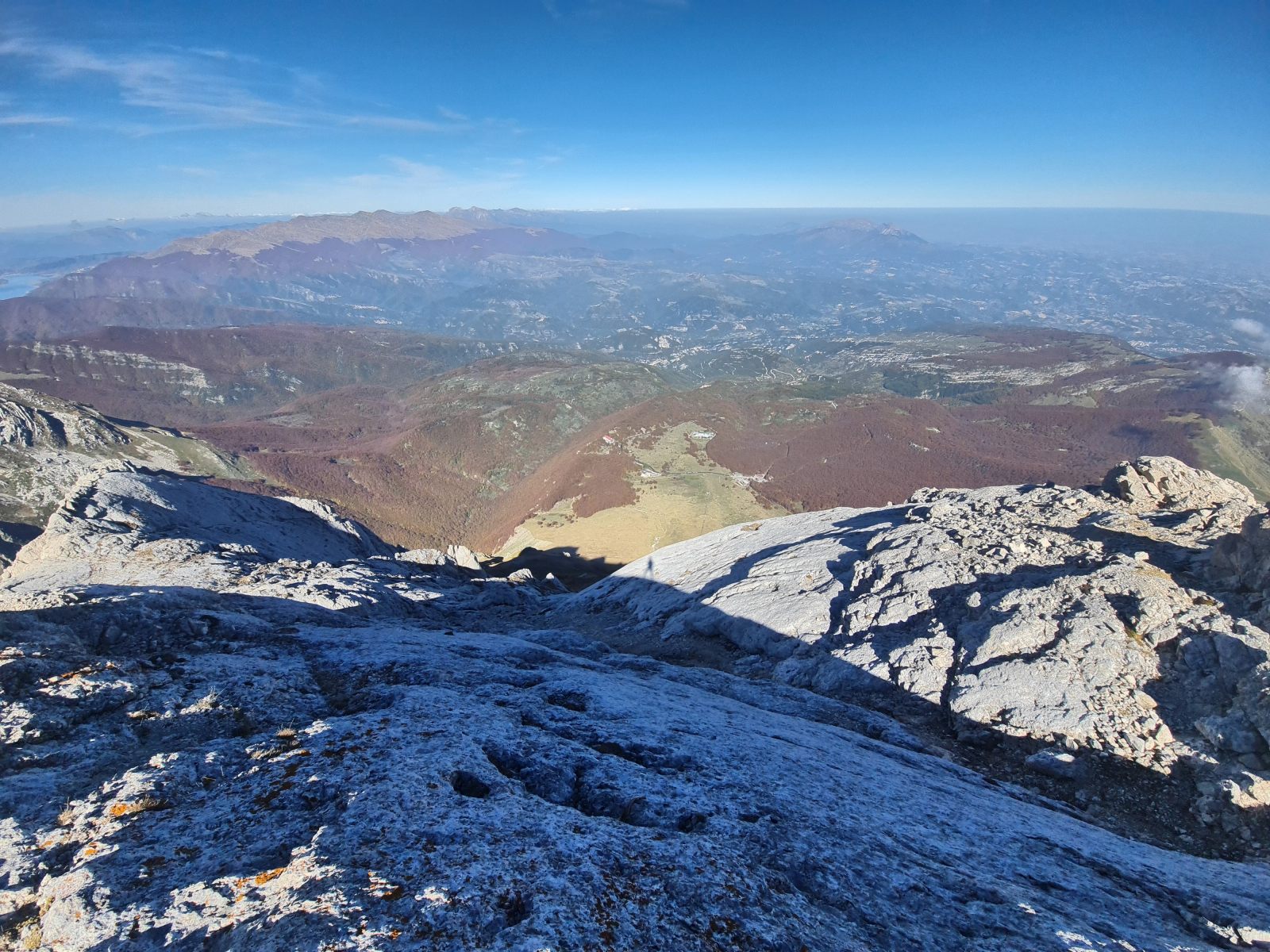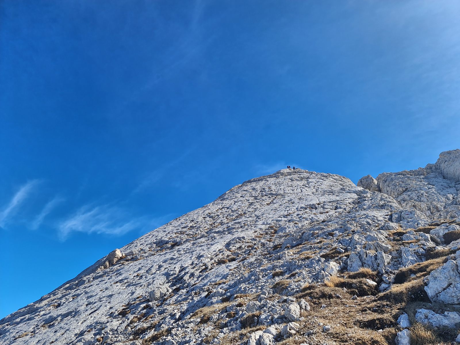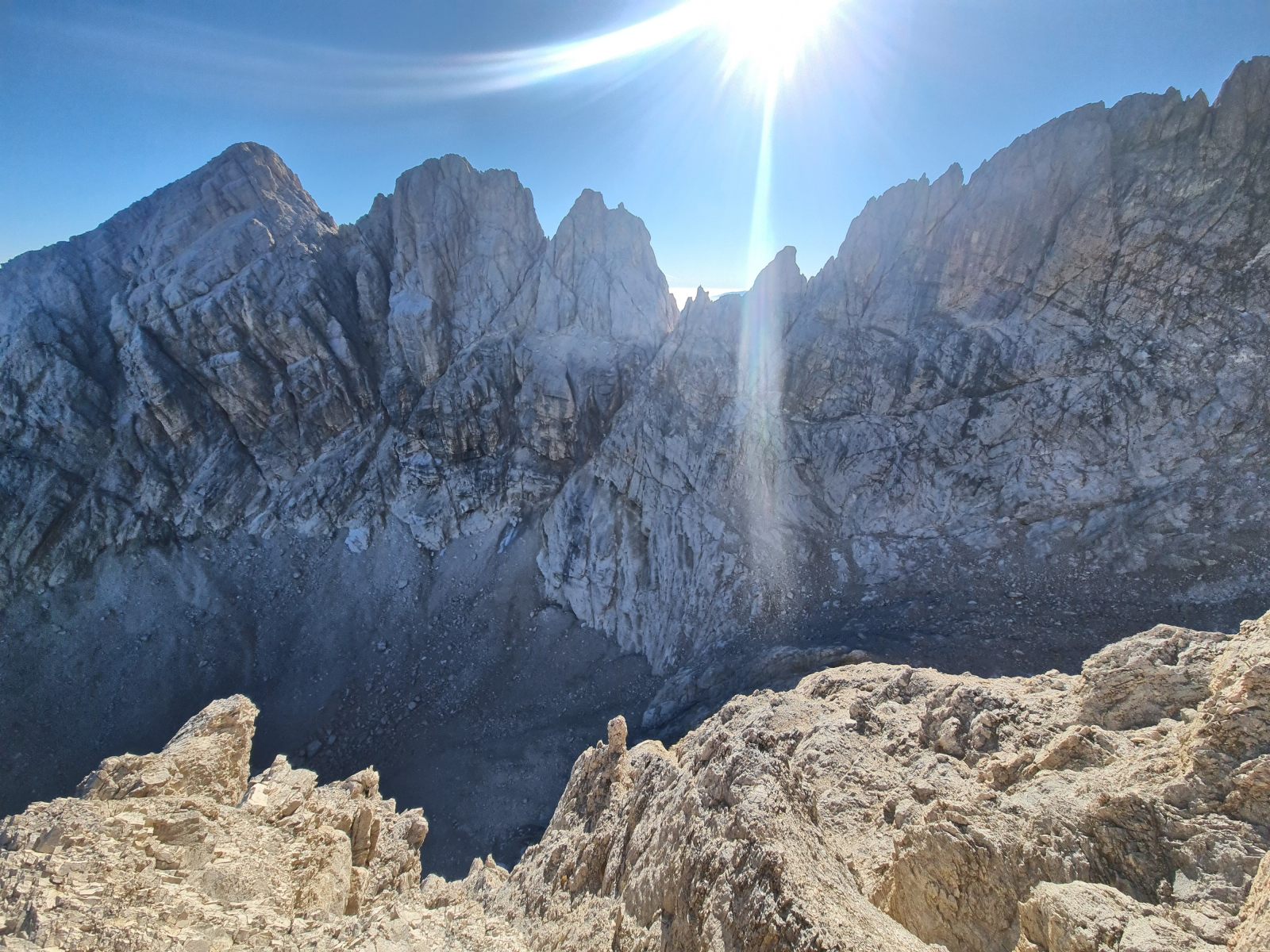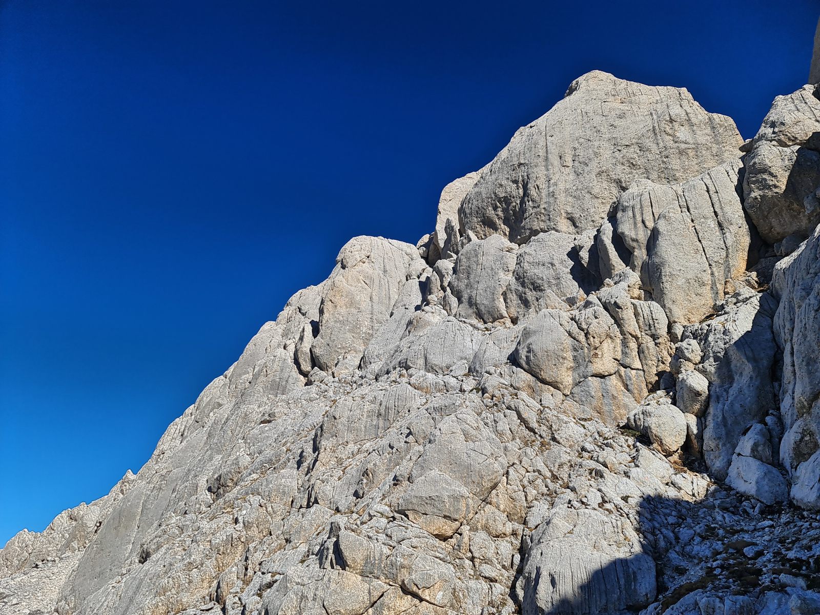 Der Abstieg verläuft über die Via Normale, deren Einstieg auf der NW-Schulter bei ca. 2950müM liegt. Sie führt mehrheitlich horizontal zum Ausgangspunkt zurück. Die Zweiteilung von Auf- und Abstieg ergibt eine wirklich lohnende Kombination, dennoch bleibt ein Helm wichtig. Zu Stosszeiten sollte man diese Routen meiden, was ich für heute bei der Theorie belasse. Dank der späten Jahres- und vor allem Tagsezeit hat es relativ wenig Leute unterwegs. An schönen Sommertagen müsse man für das Gipfelfoto jedoch Schlange stehen, wird mir gesagt.