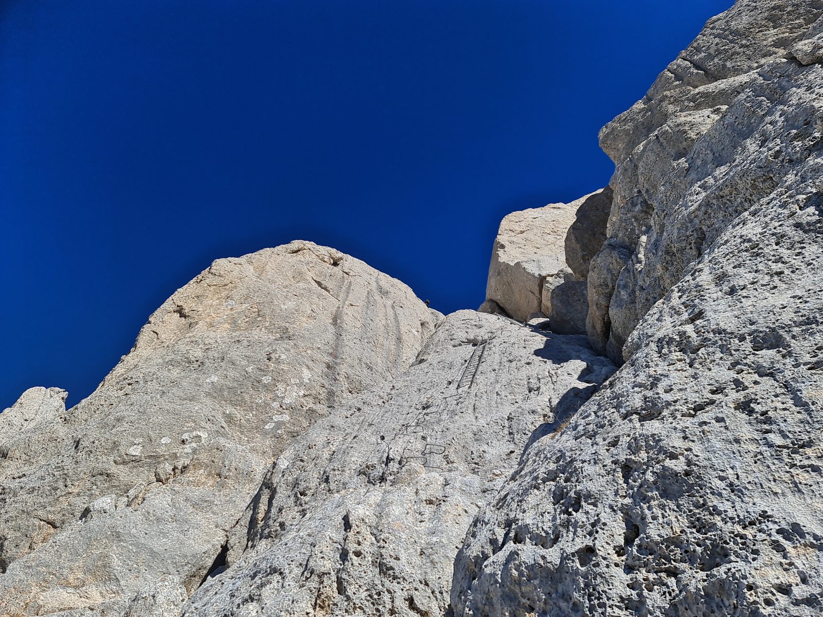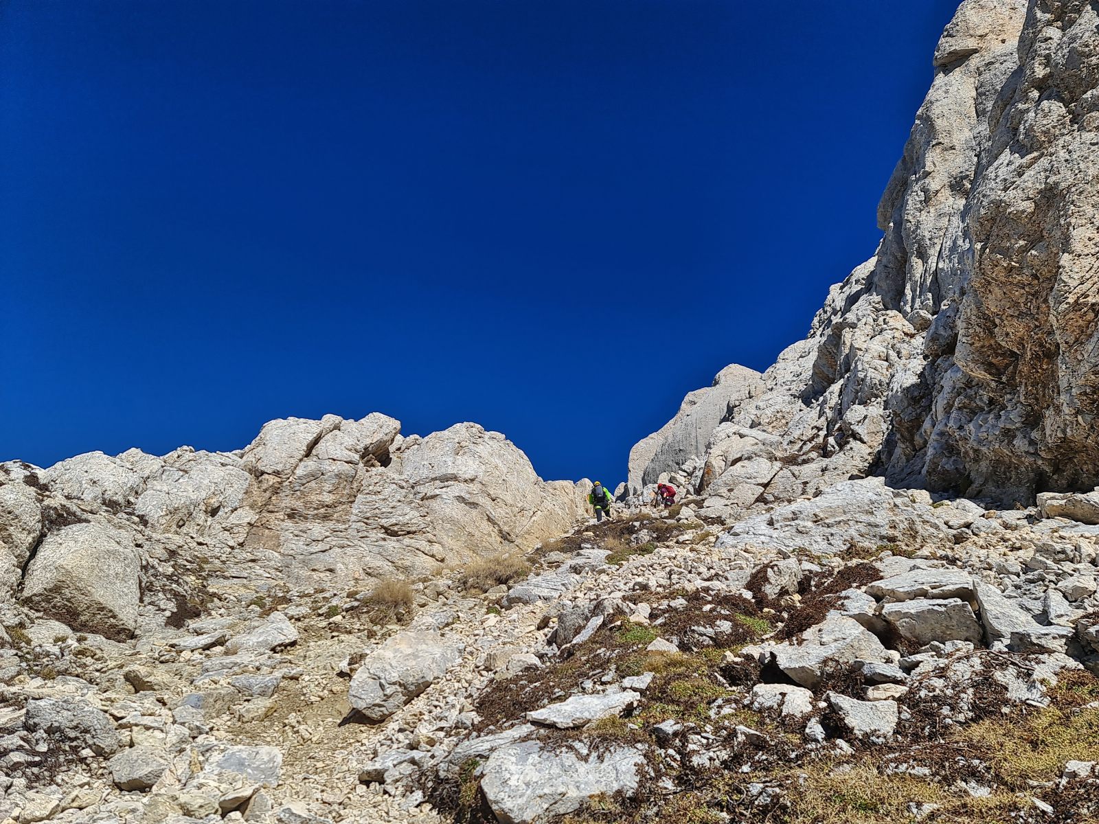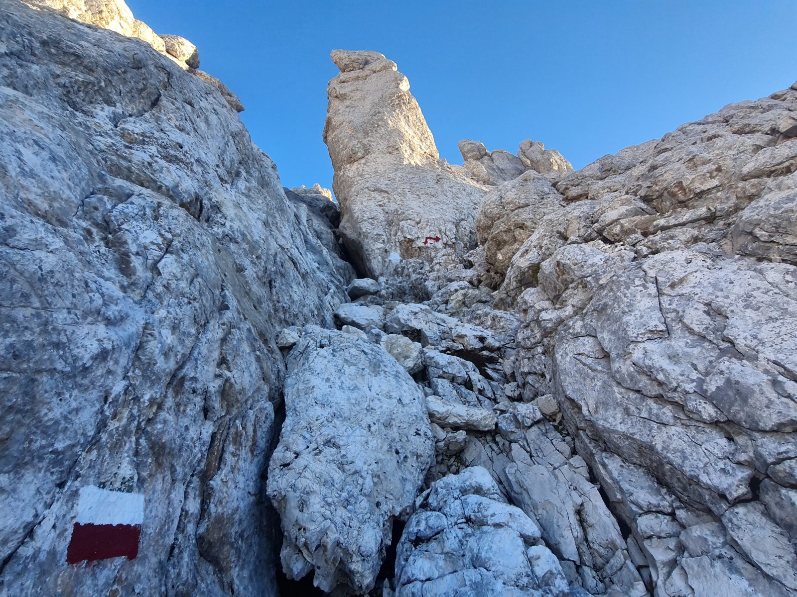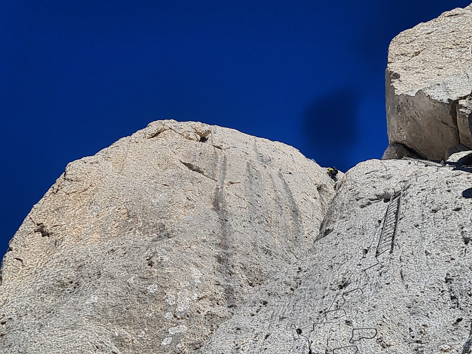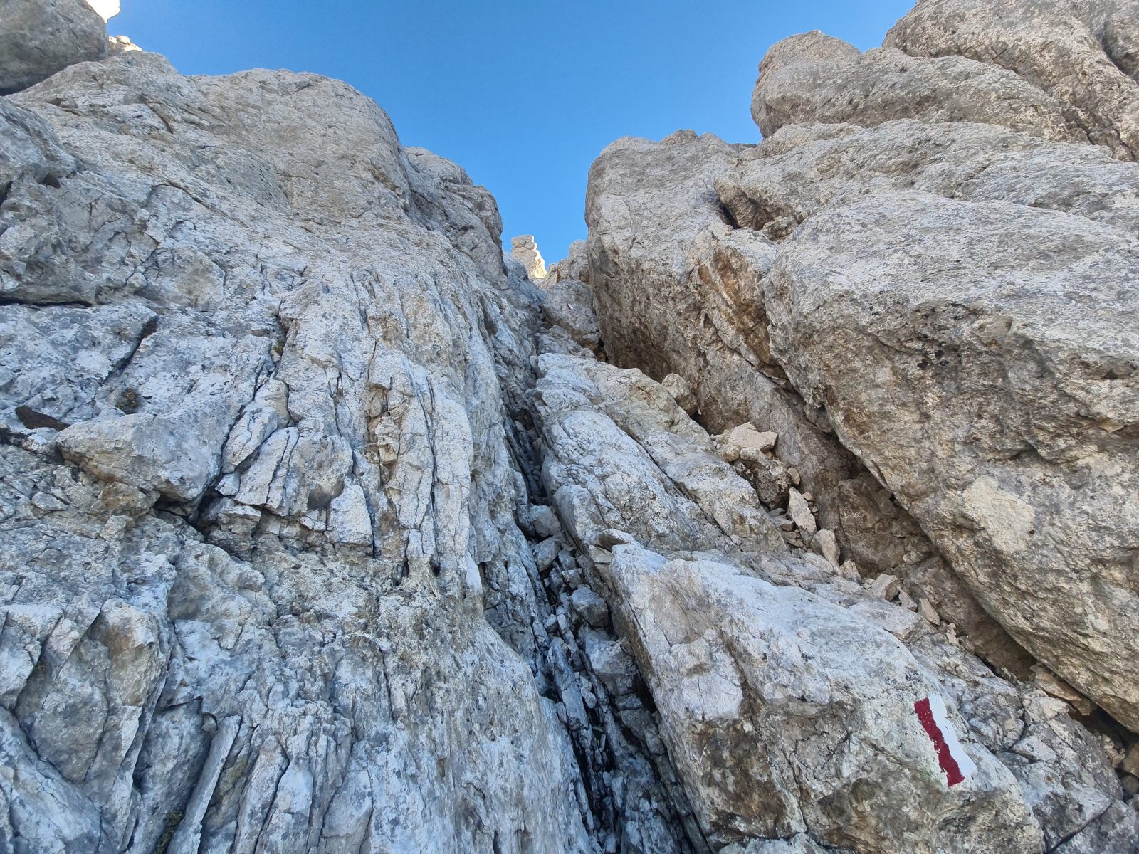 Mein Weg führt mich zur Sella dei Due Corni und auf deren W-Flanke wieder kurz hinunter an den Einstieg der Via Ferrata Danesi am Fuss des Corno Piccolo. Diese führt durch zwei breite Rinnen hoch, welche jeweils nach links verlassen werden. So gelangt man zu einem glatten Elefantenbauch hoch, welcher dank zwei steilen Leitern einfach überwunden wird. Oben schlängelt sich der Weg in vergnüglicher Weise zwischen Blöcken durch bis zum höchsten Punkt. Insgesamt ca. 200Hm auf einem unschwierigen Klettersteig.