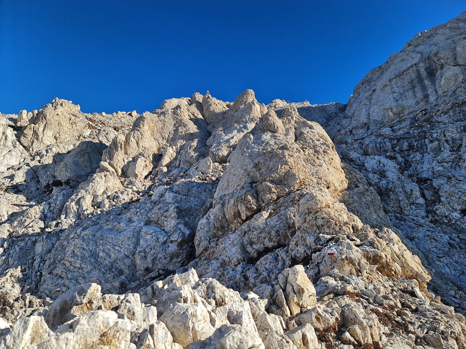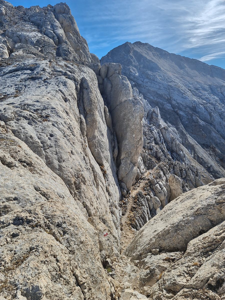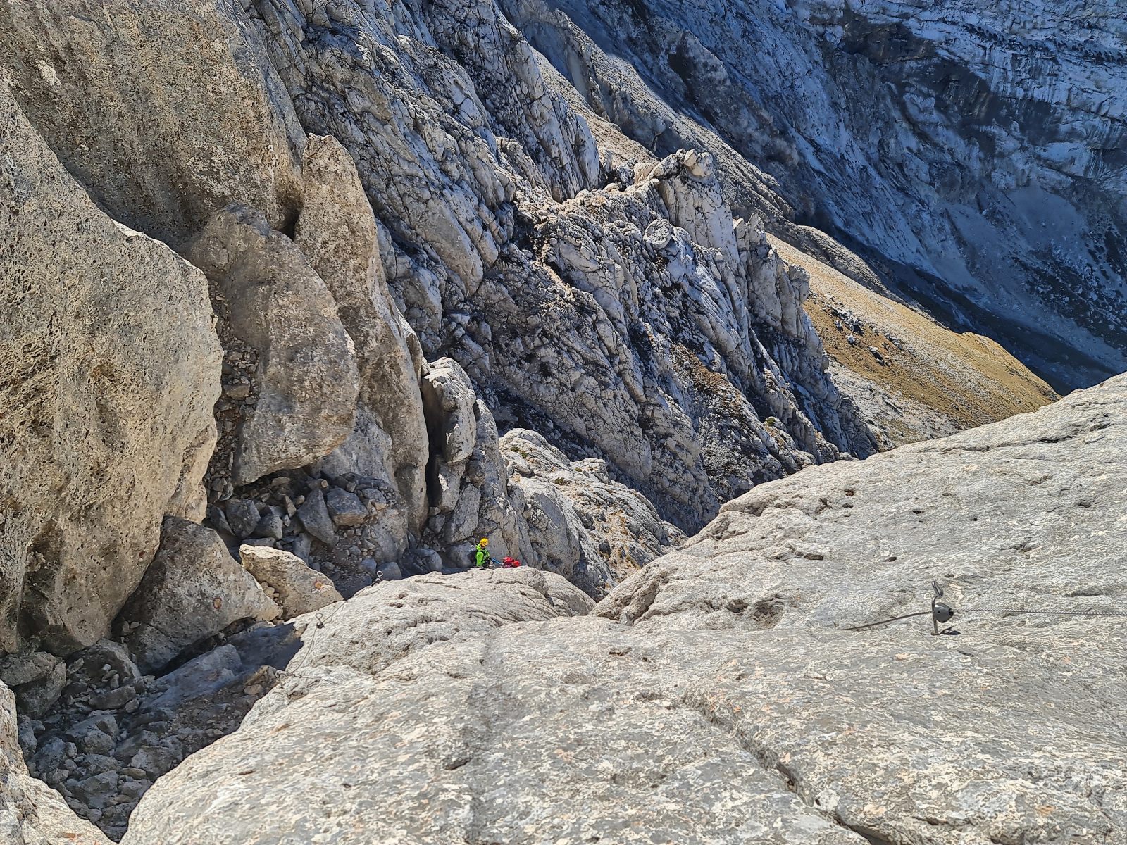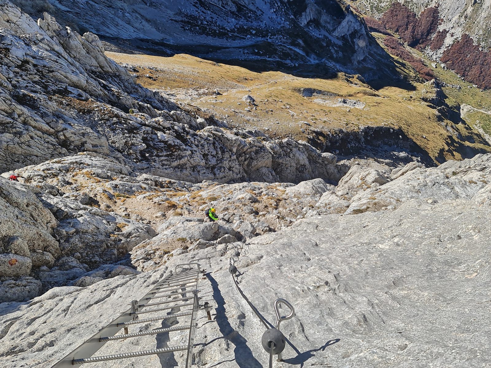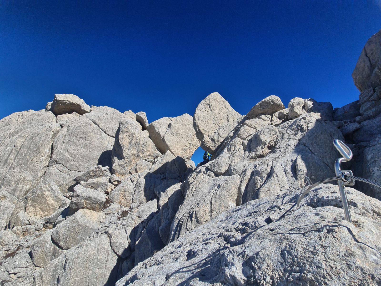 Keine Ahnung, was sich hinter diesem Namen versteckt! Aus den mehr oder weniger vagen Beschreibungen, die ich übers Internet gefunden habe, geht hervor, dass es sich nicht eigentlich um einen Klettersteig handle. Was aber sonst? — Der Aufstieg verläuft vom Einstieg weg in abenteuerlichem Gelände und weist keine Sicherungen auf. Es ist etwa eine WS-Tour im Fels mit zwei “Aber hallo!?”-Stellen, die dafür sorgen, dass man sicher wach wird. Über rund 300hm darf munter gekraxelt werden, bis man direkt den Westgipfel erreicht.
