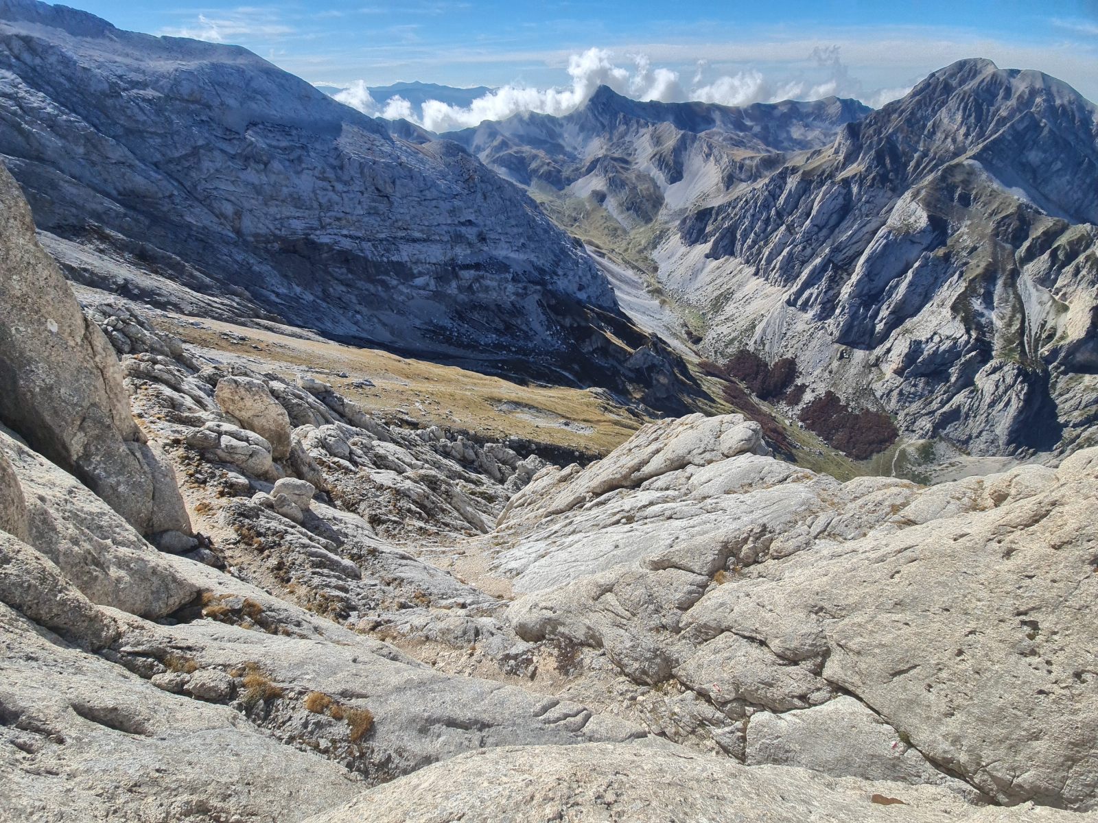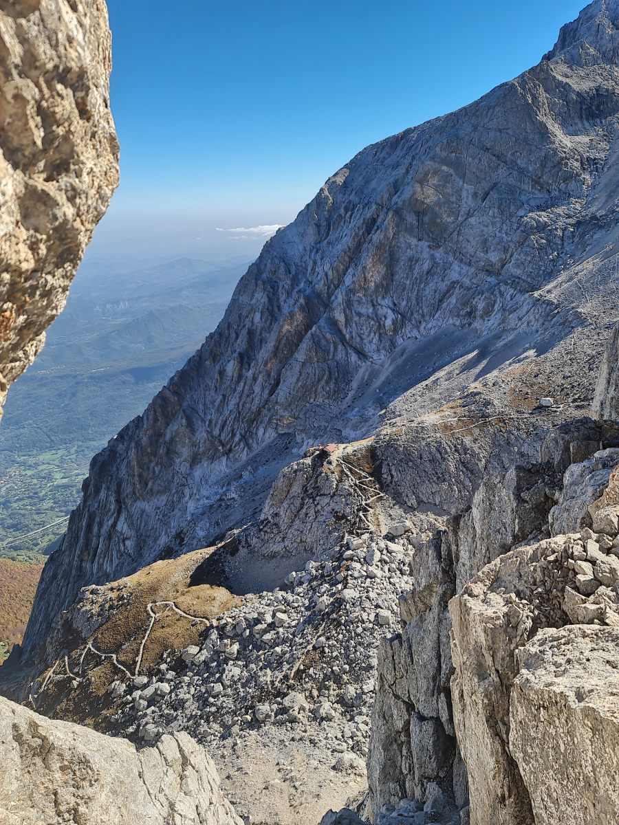 Nach Überquerung einer Flanke traversiert man über teilweise ausgesetzte Felspartien, wo ich mich gerne ins Kabel einklinke. Von der Felsschulter, dem “Belvedere”, führt ein steiler Abstieg über Leitern hinunter zur Grande Comba, einem eindrücklichen Geröllfeld, das meine Charakterisierung des Corno Grande erneut bestätigt. Inmitten von Nebelschwaden im sinkenden Licht fühle ich mich sehr klein in dieser riesigen Einöde. Zudem frage ich mich, wo um alles in der Welt wohl der erwartete, einfache Weg in Richtung Gipfel hochziehen soll.