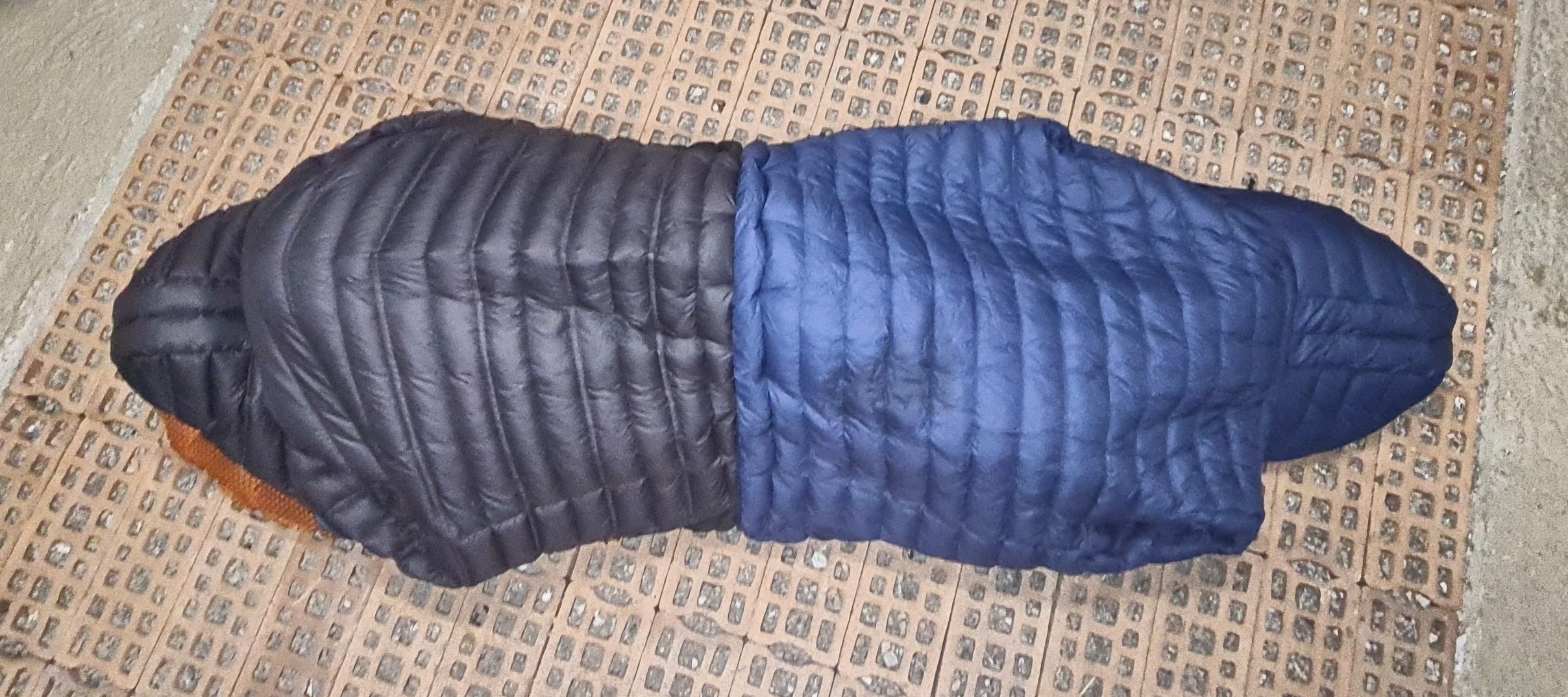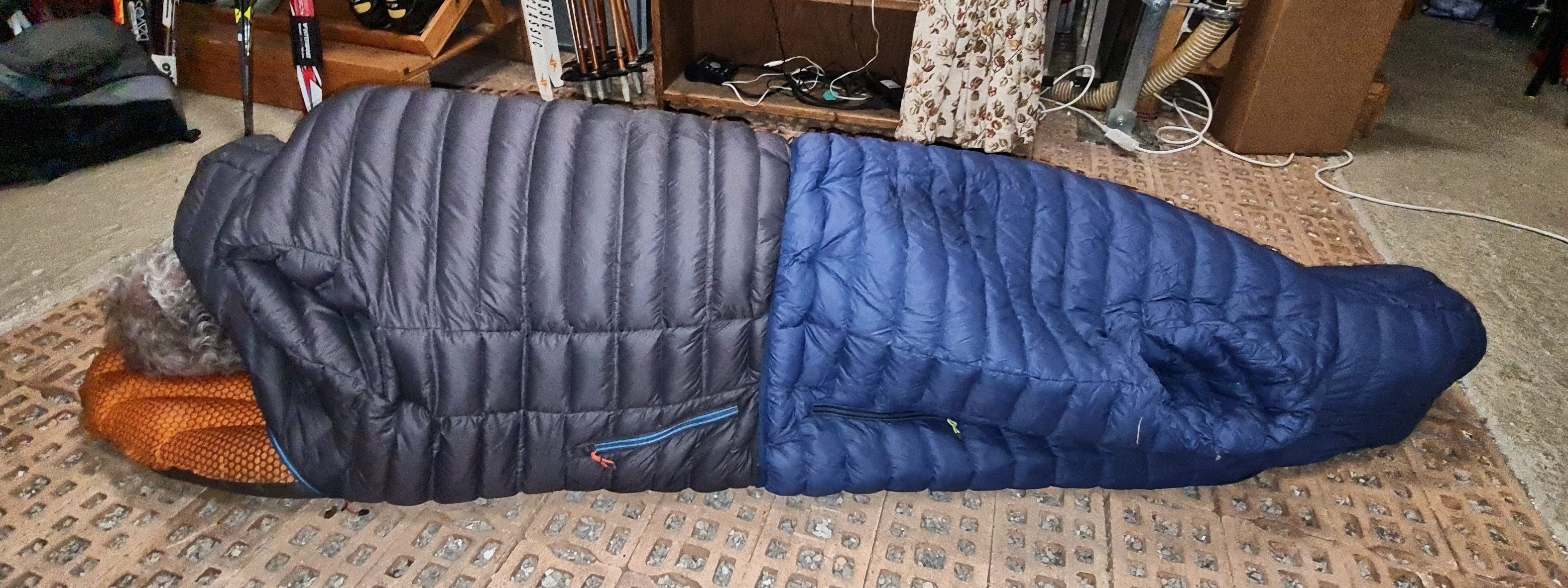 Üblicherweise kriecht man in einen Schlafsack und legt sich auf ein Matte. Meine Grundidee besteht darin, die Matte sozusagen als Unterteil des Schlafsacks zu verwenden, und das Oberteil als Decke aus zwei Daunenjacken zusammenzubasteln.
