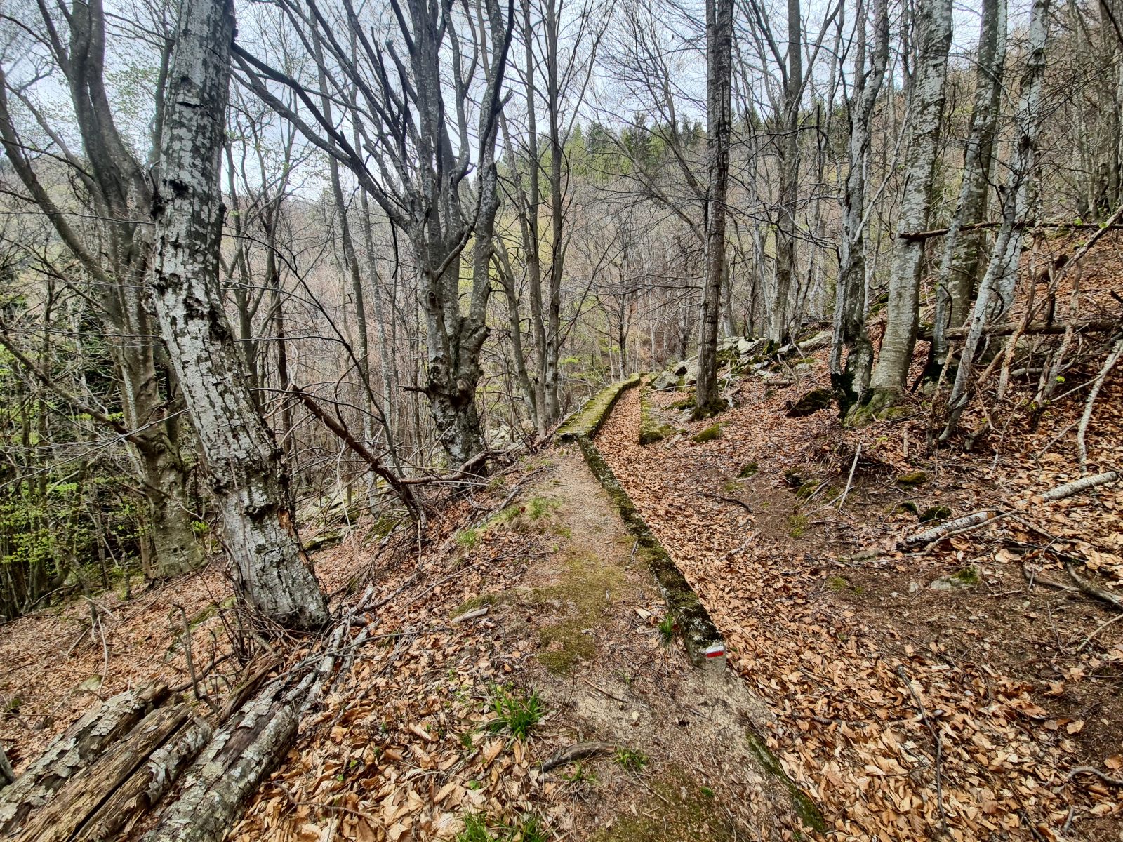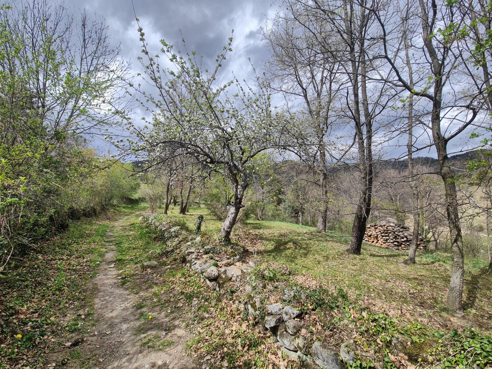 Ganz so bedrohlich wird der Tag natürlich nicht, auch wenn jeder Schritt ins Unbekannt führt. Schliesslich ist das mein allererster Besuch der Pyrenäen. Ein alter Pfad steigt über frühlingshafte Wiesen und an blustbestandenen Sträuchern und Bäumen vorbei, während zuhause der Winter erneut Einzug gehalten hat. Bald verschwindet der Talboden aus dem Blickfeld, und eine lange Querung führt ins Tal der Pacrigoule. Zuhinterst verläuft in der Flanke ein Pfad direkt zum Refuge hoch. Anfänglich folgt er eine alten Wasserleitung. In der Schweiz würde man von Suone oder auch Bisse sprechen. Hier trägt sie den Namen Canal du Miracle, und ich balanciere fröhlich über seine Mäuerchen, bis ich sein Ende erreicht habe. Dort wird aus dem Wunder blanke Verwunderung, denn der beabsichtigte Weg wäre viel früher schon abgezweigt.