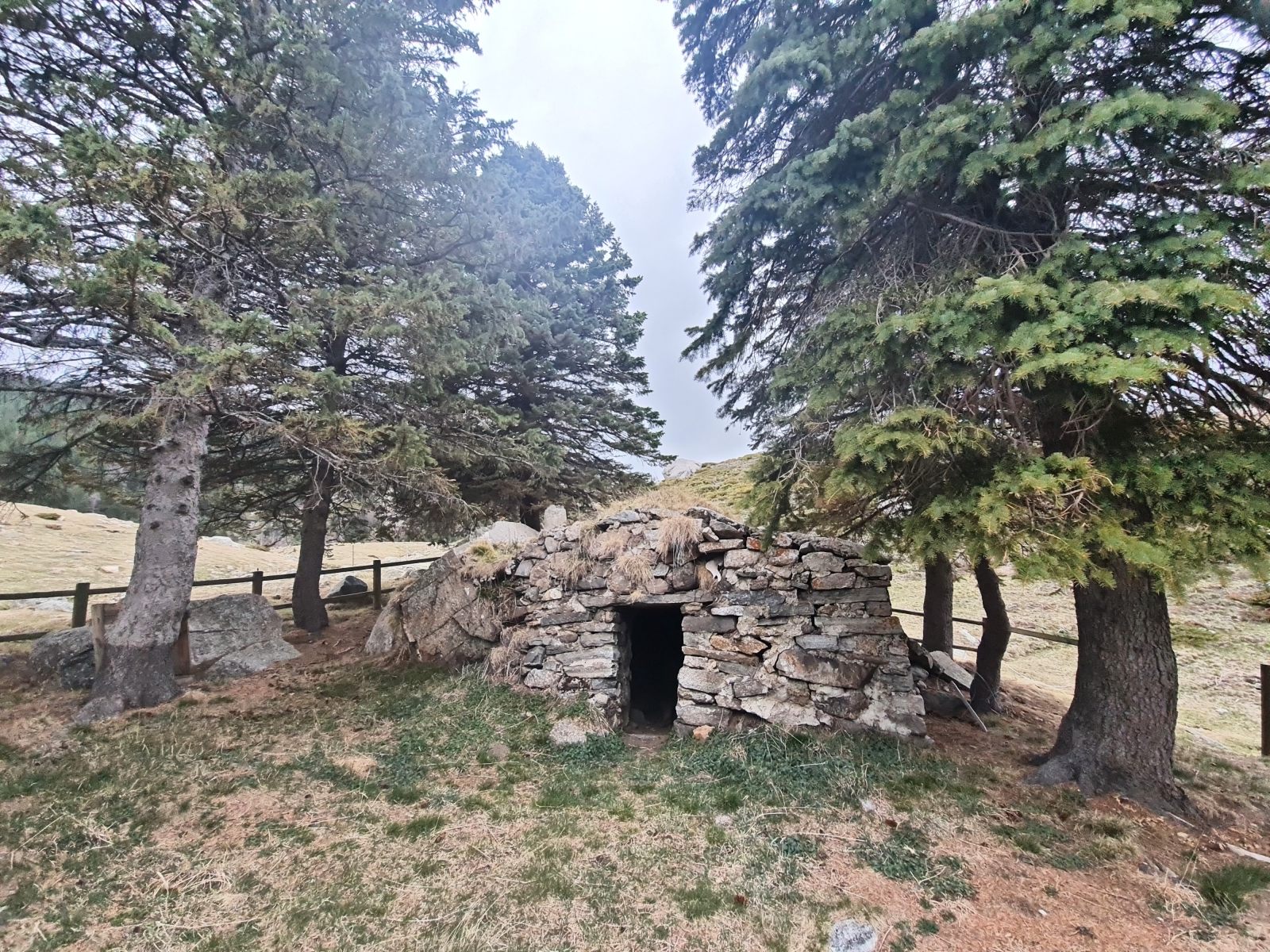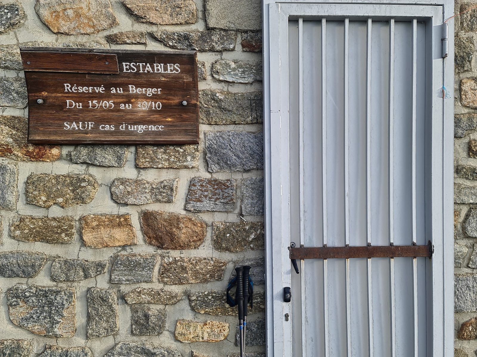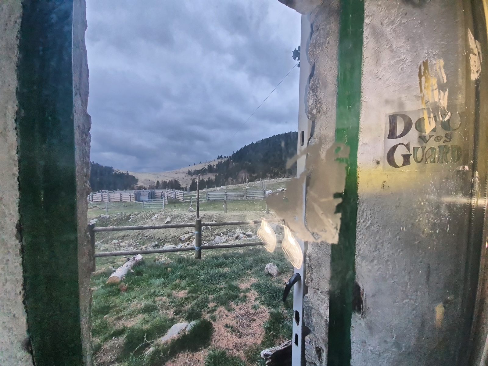Kurz vor der Hütte lassen die tief liegenden Wolken erste Tropfen fallen, was jedoch das einzige Zeichen von Feuchtigkeit ist. Denn die Bächlein in der Nähe des Refuge sind alle ausgetrocknet. Die Dürre zeigt sich schon im Frühling mit aller Deutlichkeit. — Das ist jedoch beileibe nicht das einzige Problem. Viel gravierender noch ist die Tatsache, dass die Hüttentüre verschlossen ist. Nutzlos ist alles Rütteln am Eisentor; es bewegt sich keinen Milimeter, und sogar die Türfalle ist abmontiert. — Langsam beginne ich, meine Planung zu hinterfragen. Auf den Web-Sites refuges.info und pyrenees-refuges.com hiess es, die Hütte sei zugänglich. Die wenigen Berichte verteilen sich jedoch über mehrere Jahre, was Raum für Spekulation lässt. Mein Reserveplan sieht vor, zur nächsten Hütte ennet des Kamms weiterzugehen. Angesichts der fortgeschrittenen Zeit und des ungemütlichen Wetters ist das jedoch eine sehr unattraktive Alternative.