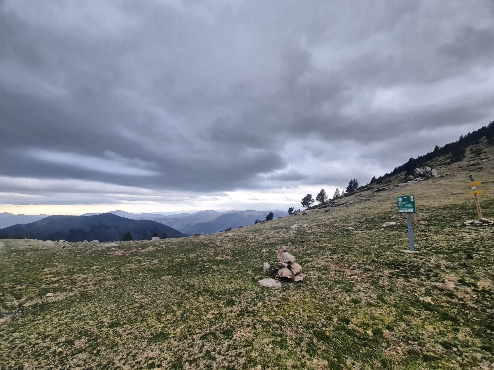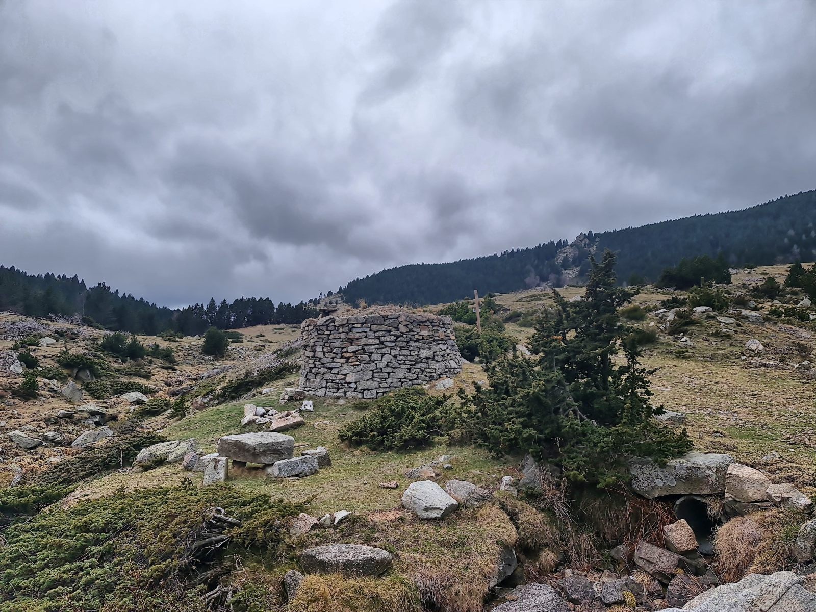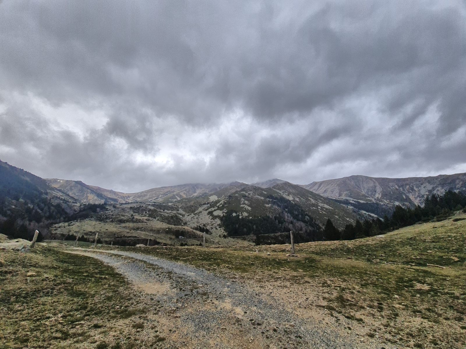 Kurz vor der Hütte lassen die tief liegenden Wolken erste Tropfen fallen, was jedoch das einzige Zeichen von Feuchtigkeit ist. Denn die Bächlein in der Nähe des Refuge sind alle ausgetrocknet. Die Dürre zeigt sich schon im Frühling mit aller Deutlichkeit. — Das ist jedoch beileibe nicht das einzige Problem. Viel gravierender noch ist die Tatsache, dass die Hüttentüre verschlossen ist. Nutzlos ist alles Rütteln am Eisentor; es bewegt sich keinen Milimeter, und sogar die Türfalle ist abmontiert. — Langsam beginne ich, meine Planung zu hinterfragen. Auf den Web-Sites refuges.info und pyrenees-refuges.com hiess es, die Hütte sei zugänglich. Die wenigen Berichte verteilen sich jedoch über mehrere Jahre, was Raum für Spekulation lässt. Mein Reserveplan sieht vor, zur nächsten Hütte ennet des Kamms weiterzugehen. Angesichts der fortgeschrittenen Zeit und des ungemütlichen Wetters ist das jedoch eine sehr unattraktive Alternative.