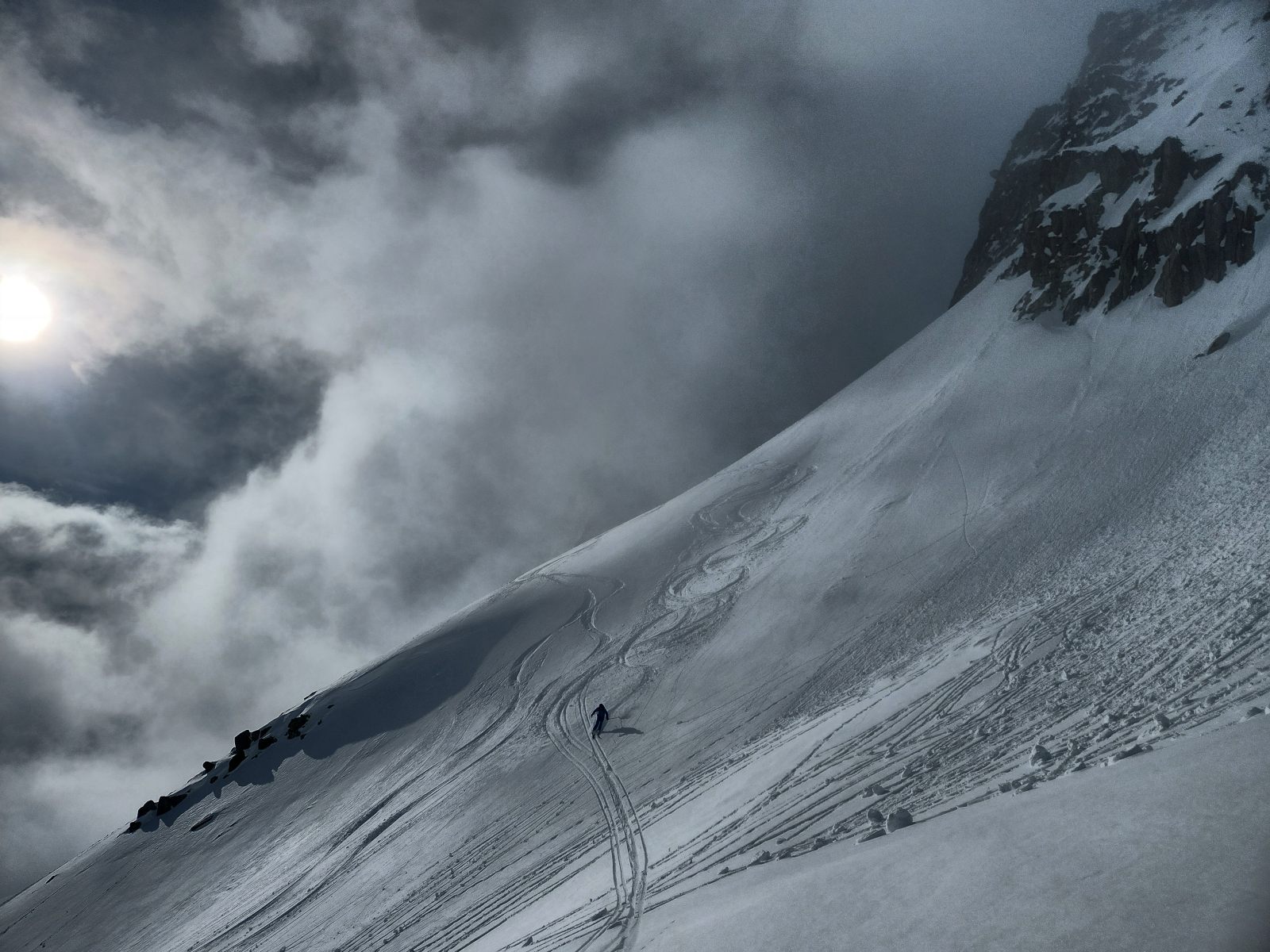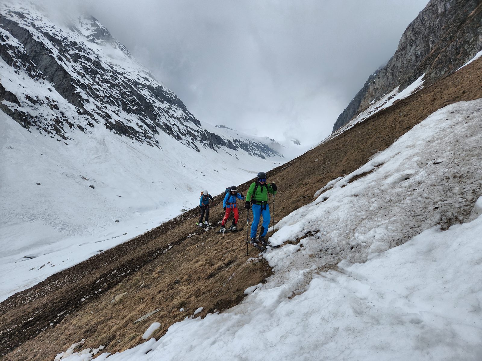 Eine trübe Suppe erwartet uns am Samstagmorgen, sowohl über den Köpfen wie auch unter den Füssen. Der Schnee ist sogar auf der Skipiste weich, und die erste Aktion besteht im Wachsen der Felle. Je weiter oben, desto weisser wird — nein, nicht der Schnee, sondern — die Gesamtsicht. In die Wyssenlücke hoch navigiere ich mit dem Kompass und bin nur froh, dass gerade dann und dort sich eine Lücke in der Wolkendecke über dem Val Val öffnet. In den ersten Hängen liegt recht viel Neuschnee, und auch die Geröllhänge zum Talboden hinunter sind gut fahrbar.