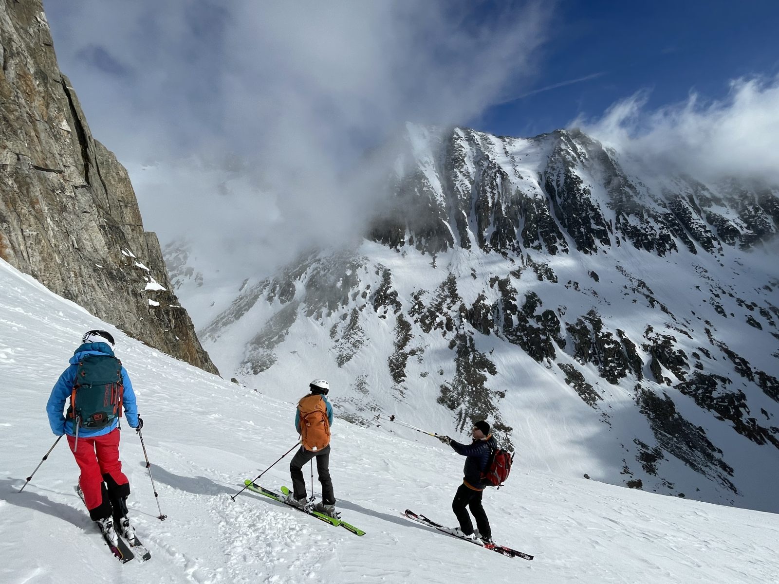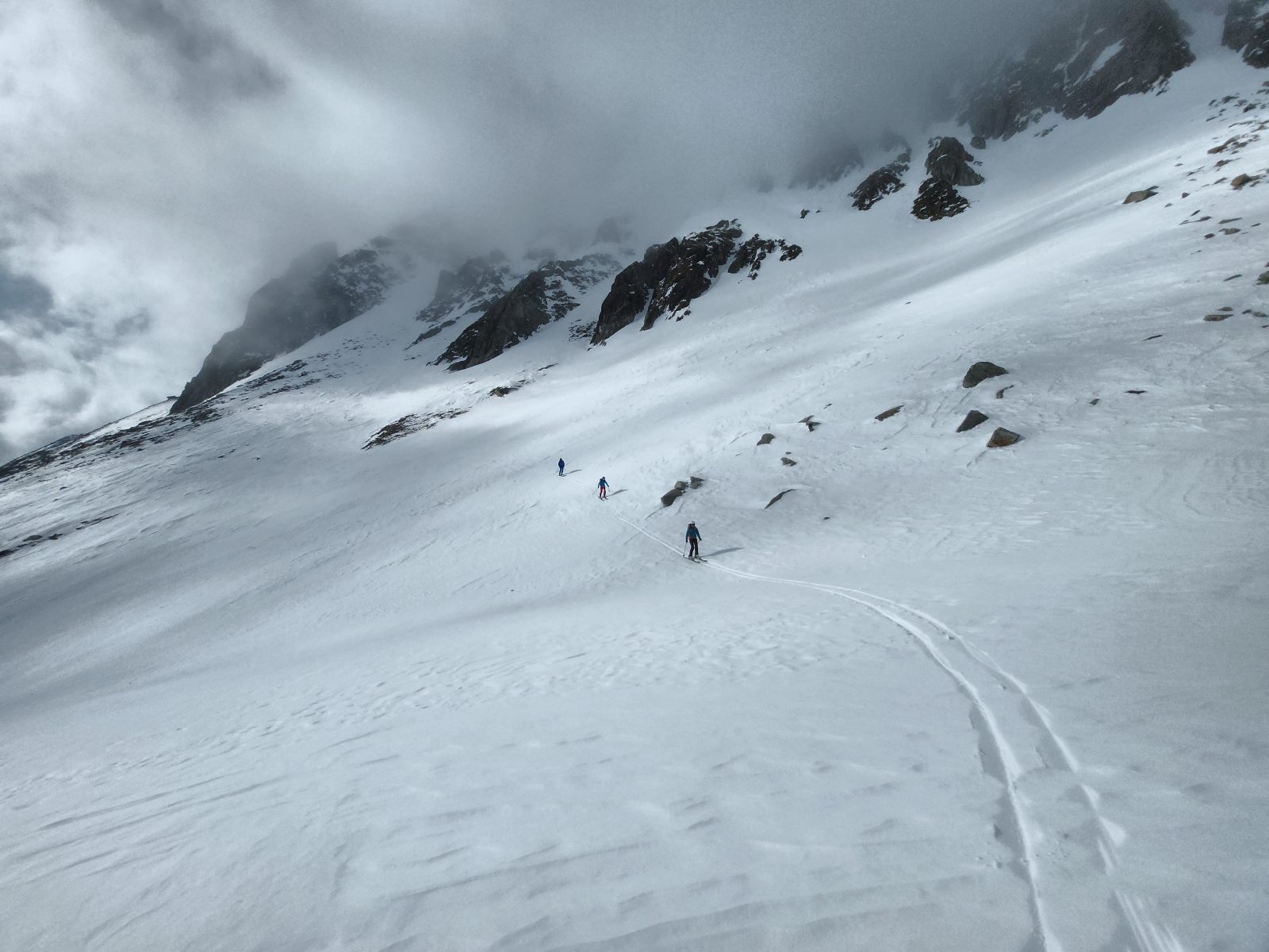 Unten stehen wir im Sonnenschein und nehmen den Gegenaufstieg leicht bekleidet in Angriff. Bis oben hin ist die Schneedecke weich, und Harscheisen sind nirgends notwendig. Standesgemäss bläst uns auf 3000m aus der Nebelwand ein kalter Wind um die Ohren, und die Ambiance wechselt schlagartig wieder auf Expedition. Auf der Nordseite liegt sehr wenig Schnee, und so “stägeren” wir mit aufgebunden Skis durchs Blockgelände. Drüben rutschen wir sorgfältig im Nebel um die Steine herum in die Lücke hinunter.
