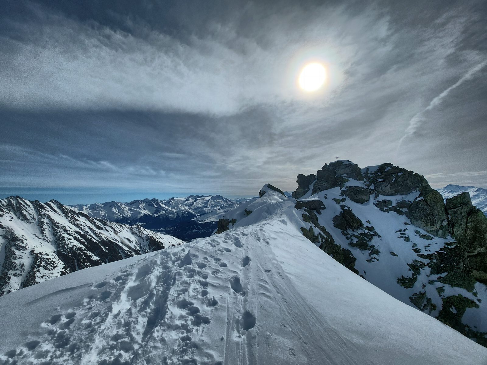 Der Aufstieg durchs Val Mila ist von einer seltenen Gleichförmigkeit, die — fern von jeder Eintönigkeit — ein meditatives Hochsteigen erlaubt. Bis zur Steilstufe unter den Mittelplatten sind es gegen vier Kilometer Länge, und auch darüber lässt sich eine recht gleichmässige Spur unter den Gipfelhang legen. Dort geht es dann gleichmässig steiler ins Sättelchen, von wo man zu Fuss auf den Gipfel steigt. Die Sicht ist eine Wohltat für unsere vom frühen Frühlingsgrün “geschädigten” Augen: Rundherum weiss verschneite Gipfel, und vom Nordgipfel ein schöner Tiefblick aufs Hinter Etzli.