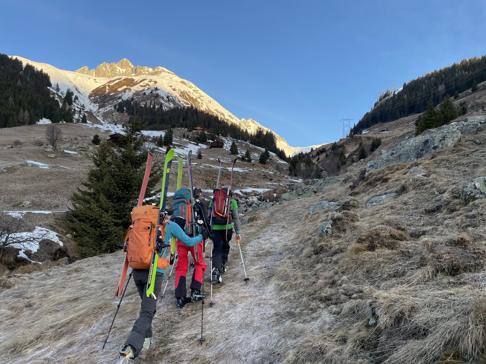 Neuer Tag, neue Verhältnisse! Strahlend blau der Himmel, und die ersten Sonnenstrahlen tauchen den Culmatsch in Goldfarbe. Die Schneedecke hat in der klaren Nacht gut durchfrieren können, und so gleiten wir über die (noch) verschneiten Weiden gegens Val Mila. Rund zwanzig Minuten müssen wir die Ski zur Strasse hochbuckeln, bis wir wieder sie wieder an die Füsse nehmen.