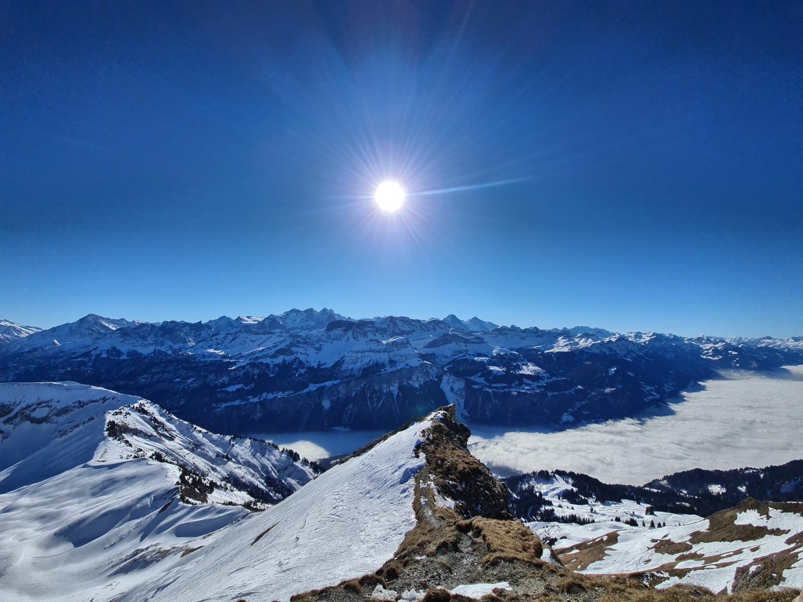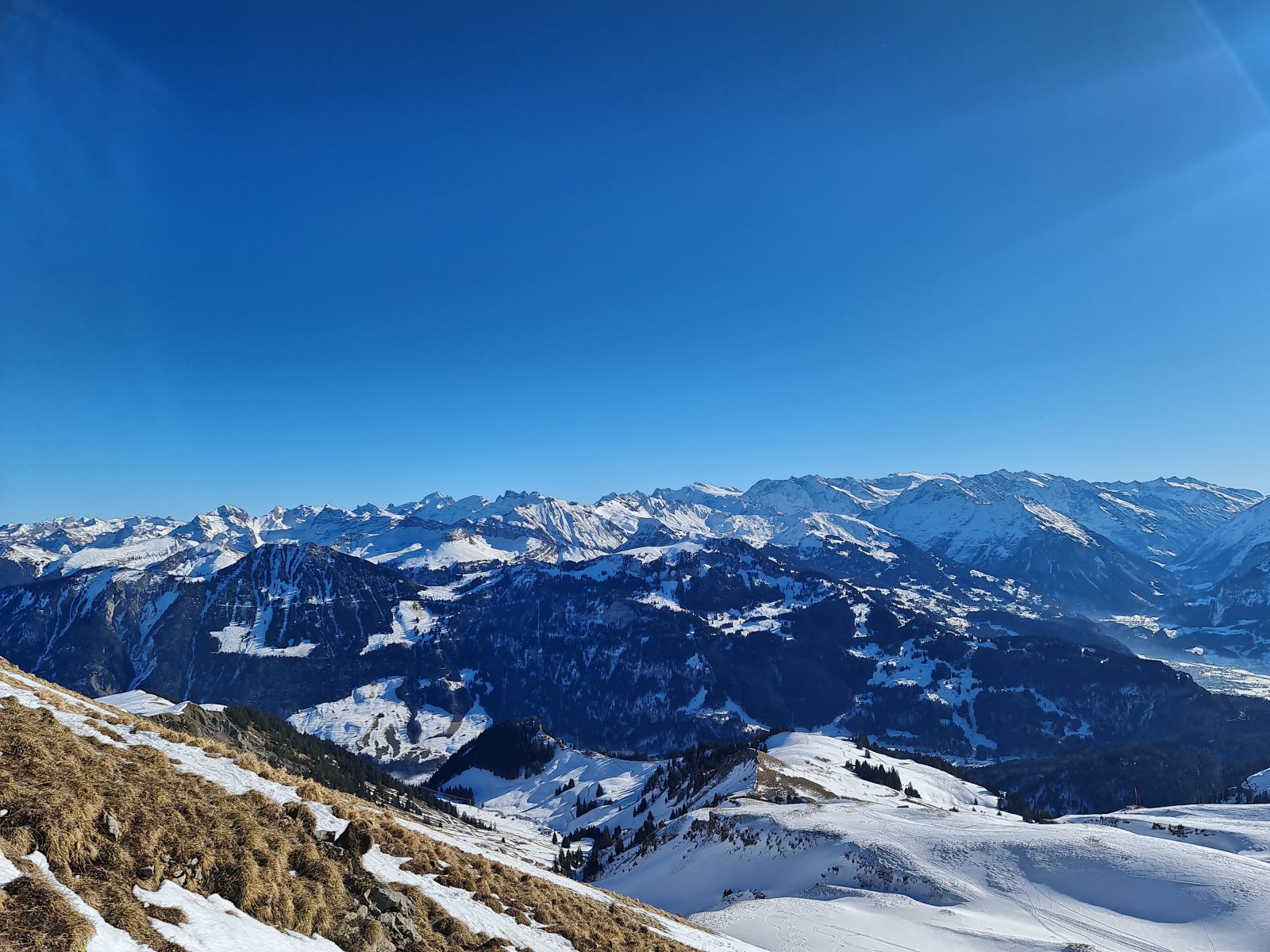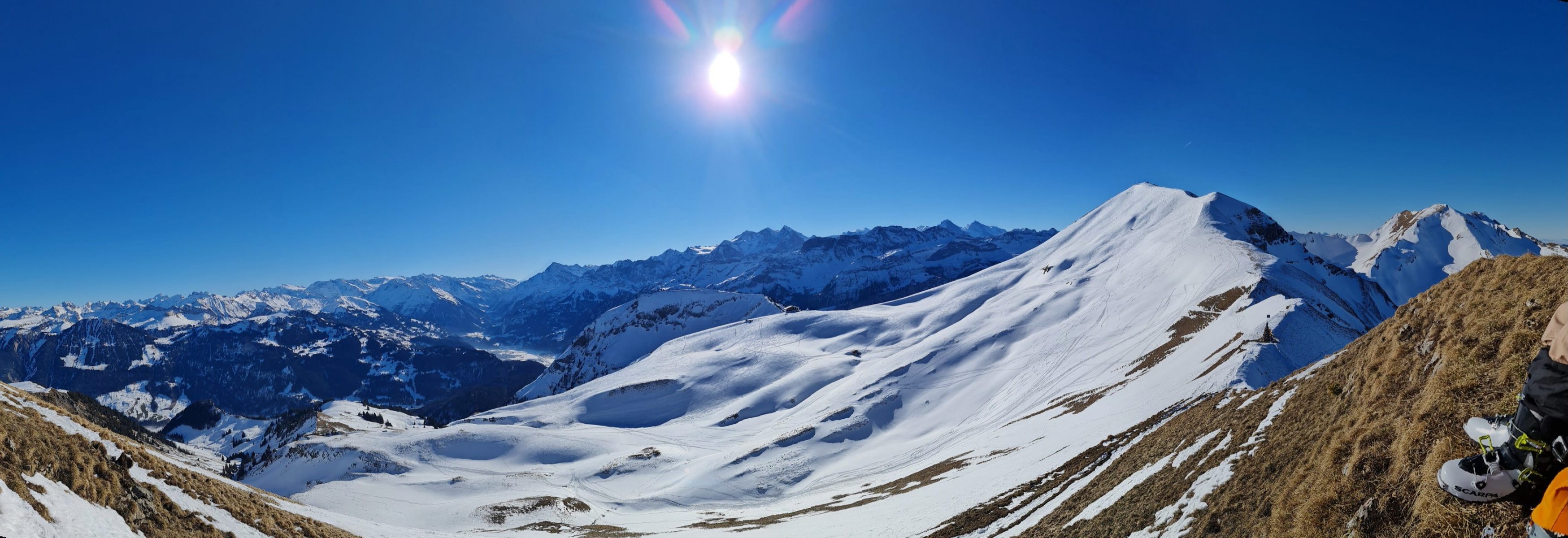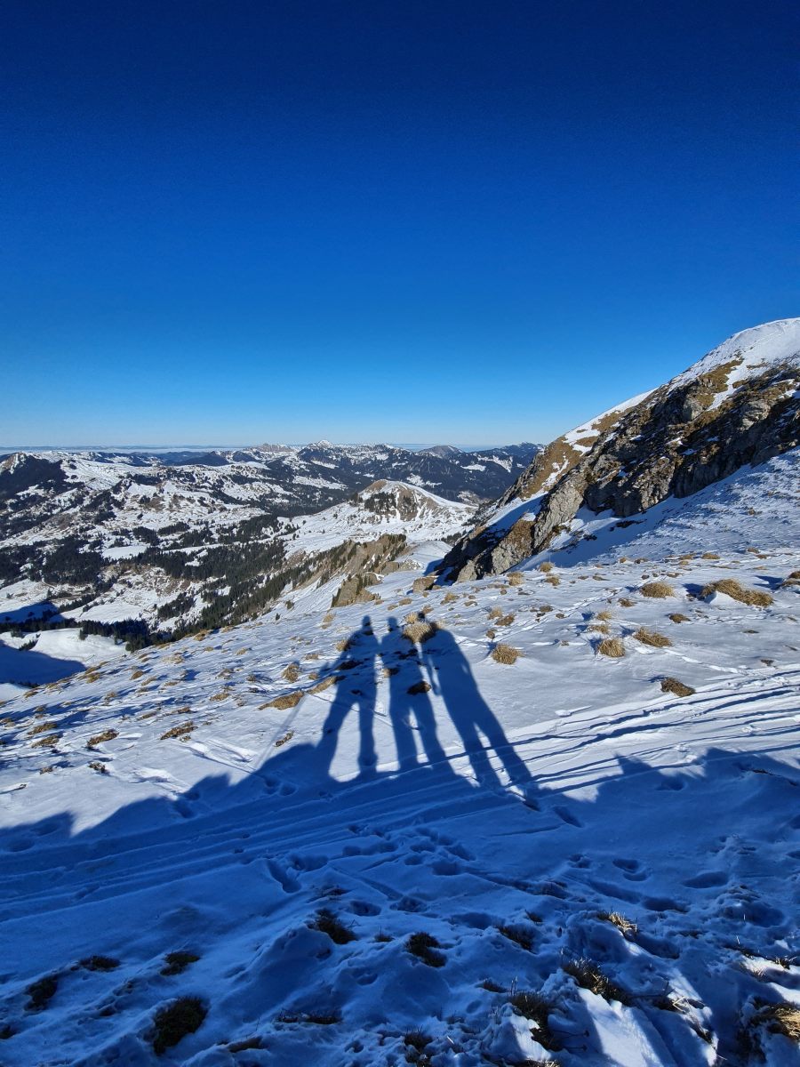 Sonne, blauer Himmel, Pulverschnee, “was wott mè méh”? Anstatt der Abfahrt über die Wandelen blieben wir an der Sonne und fanden Pulverschnee bis auf wenige, kurze Abschnitte, und dort war der Schnee schon von der Sonne aufgeweicht. Ein Prachtstag! Erwähnenswert auch die friedliche Stimmung auf der Sonnenterrasse des Berggasthauses Schönbüel.