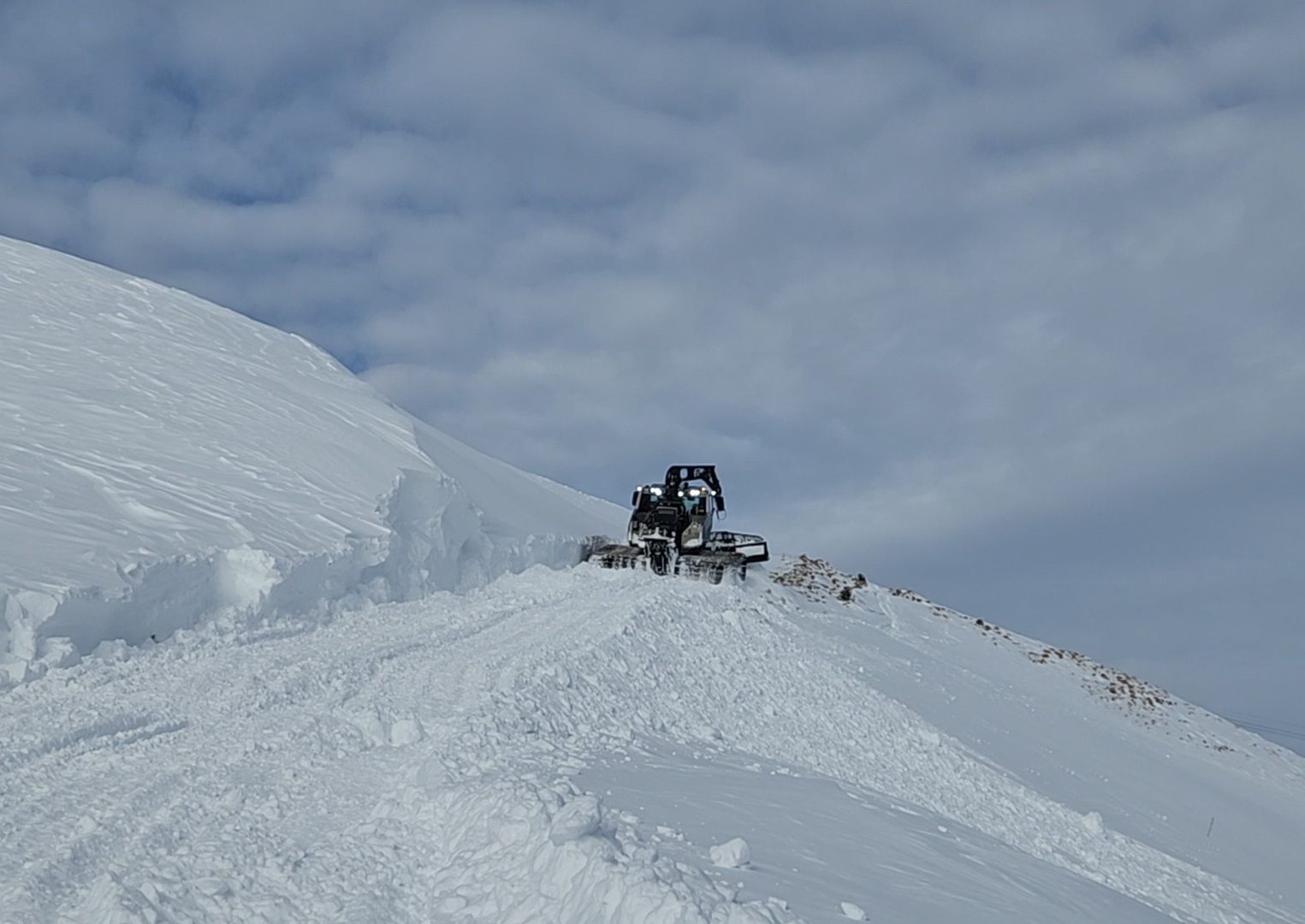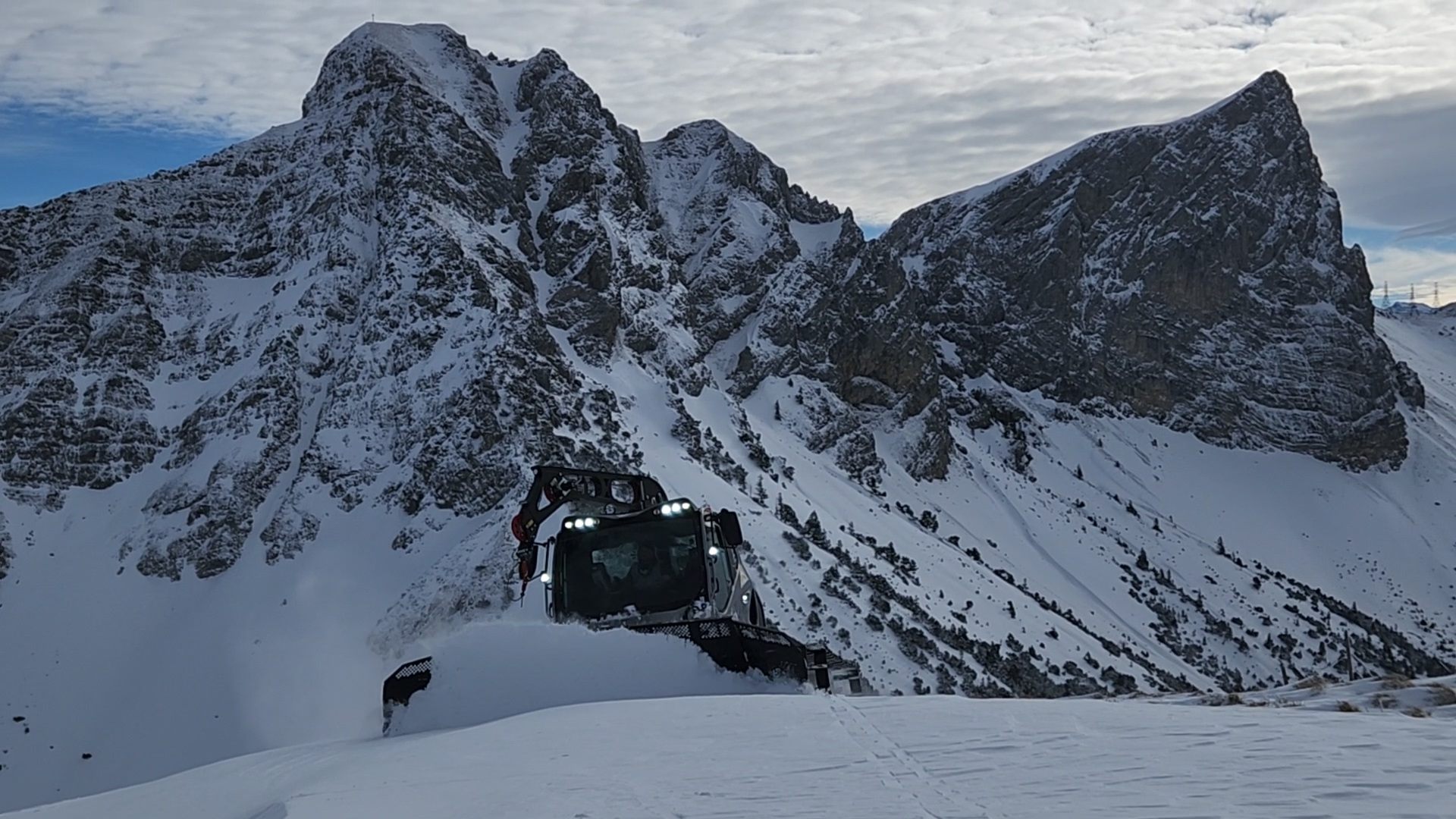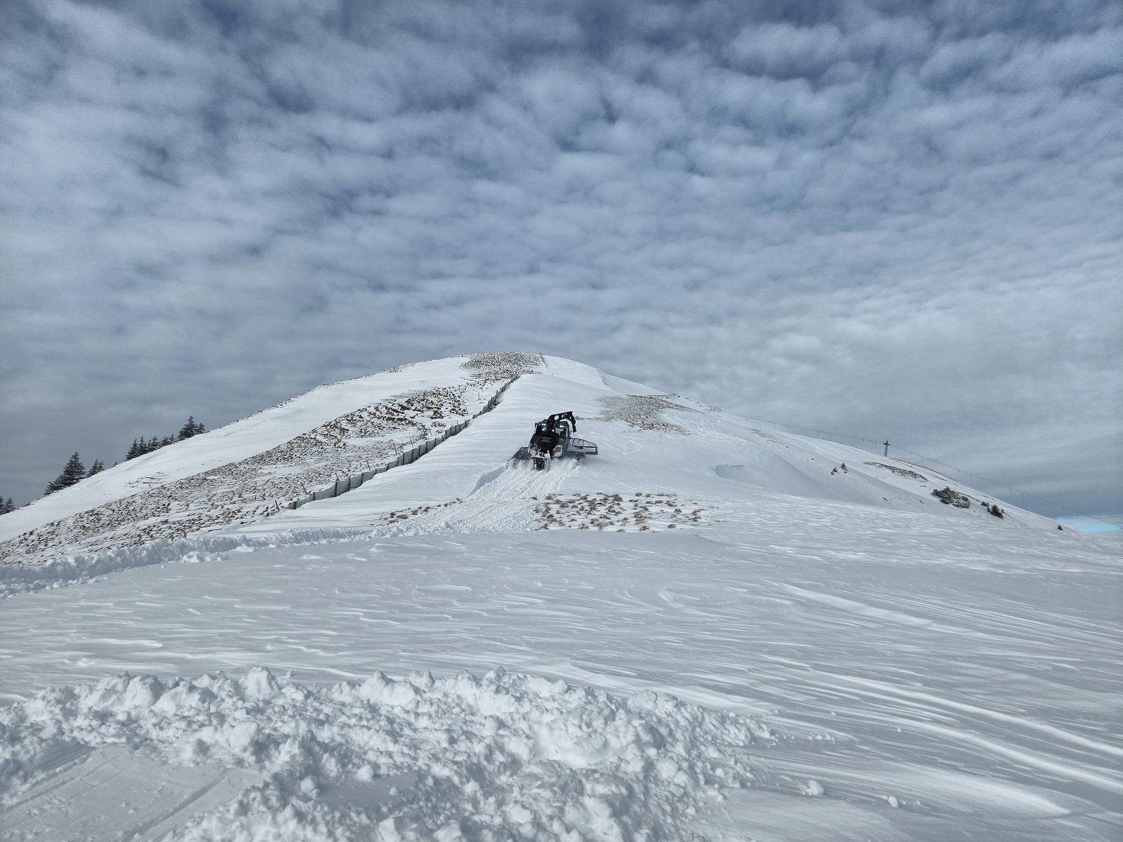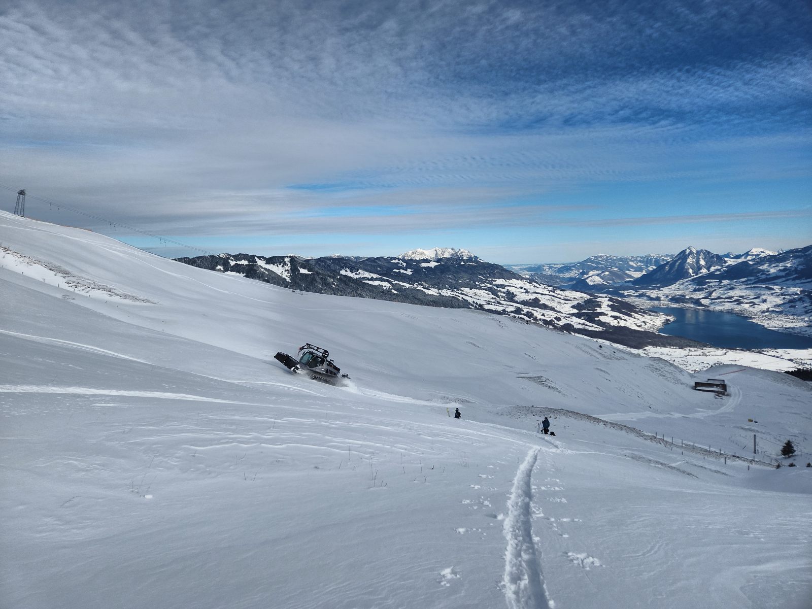 Einen stärkeren Vorspurer hätte ich mir nicht wünschen können. Die Spur ist meistens recht angenehm in der Steilheit und auch genügend breit. Ausserdem werden gleich meine latenten Fragen zur Auslösewahrscheinlichkeit geklärt. Der Panzertraktor ackert sich gegen den Gipfel hin durch anderthalb Meter tiefe Schneeverwehungen, ohne dass sich auch nur das geringste Anzeichen von Lawinengefahr zeigt. Amüsanterweise stehe ich schlussendlich als Erster auf dem Gipfel.