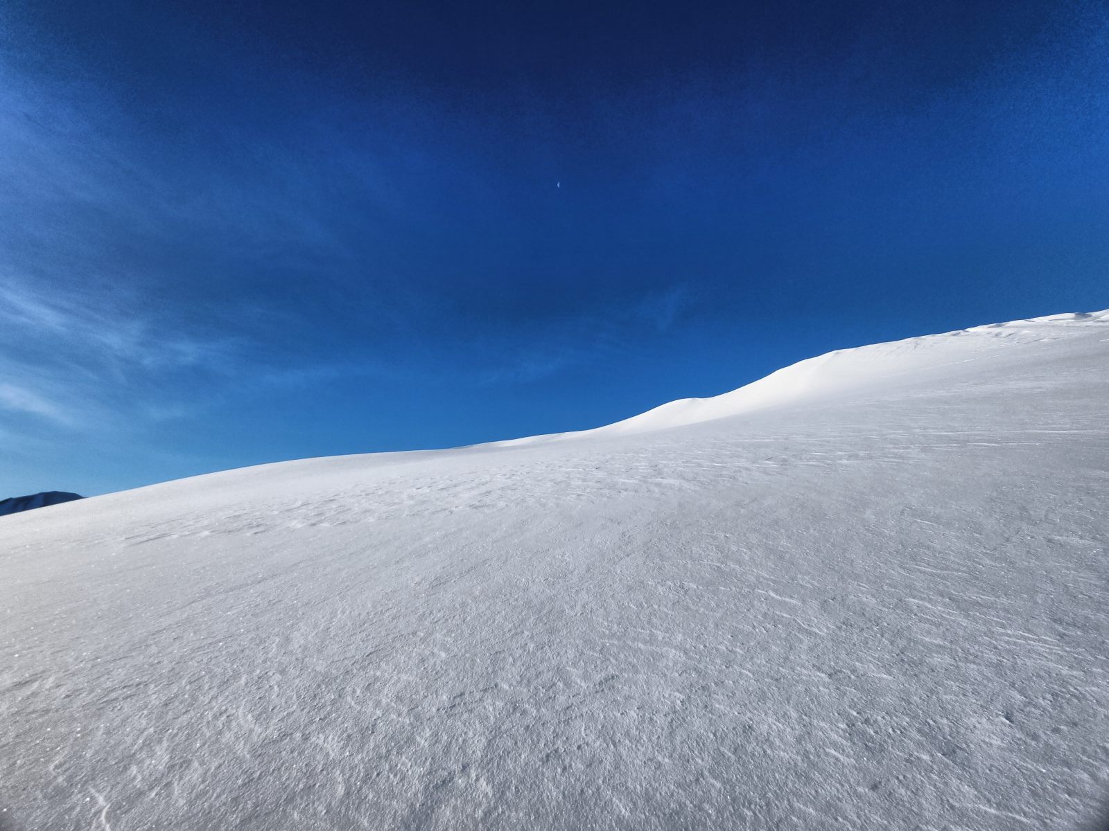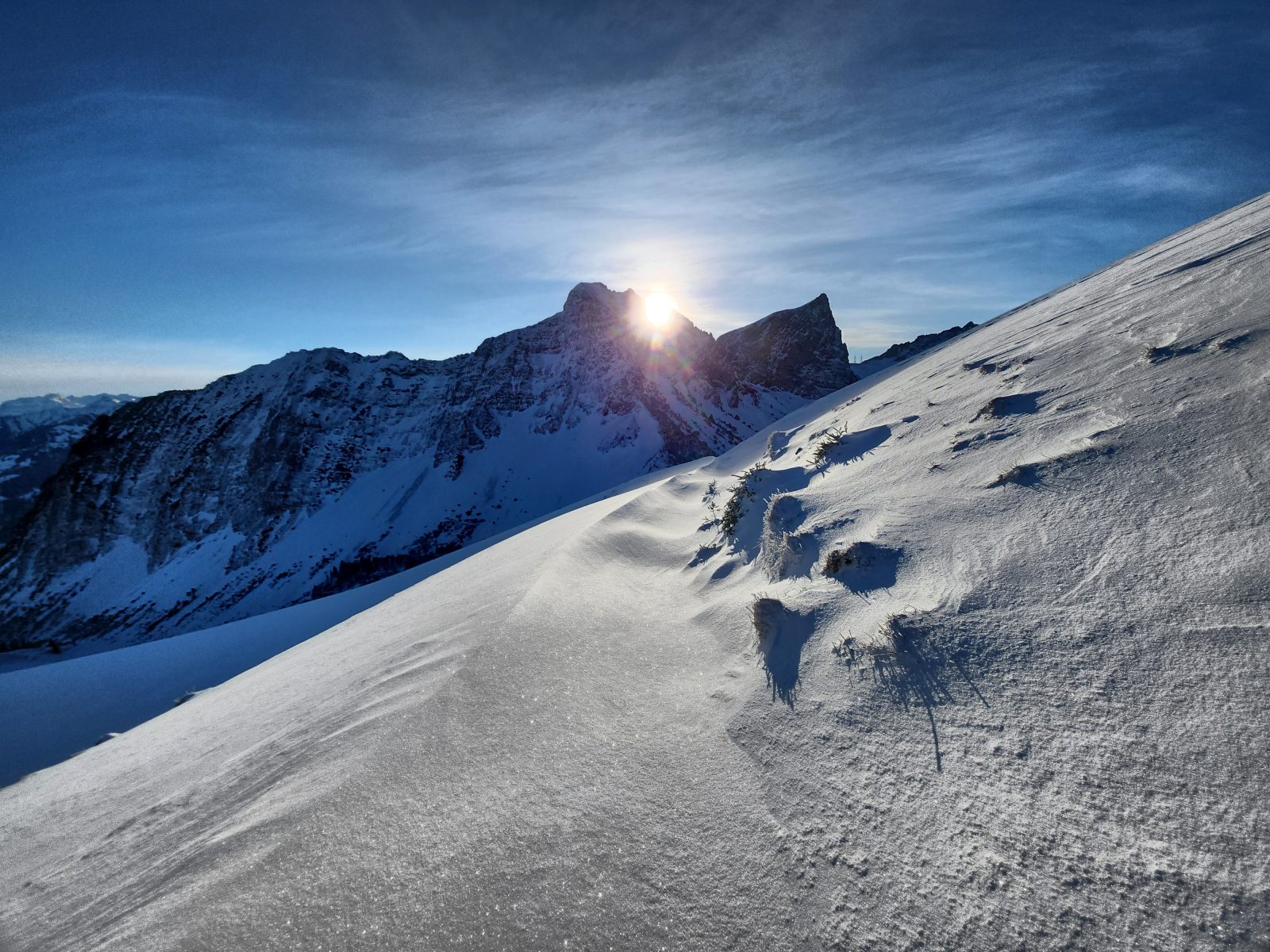 Ganz zuoberst komme ich endlich in die Sonne. Eigentlich war mein Plan gewesen, weiter Richtung Höch Gumme zu gehen, aber ein einziger Blick auf die vom Wind gefegten Hänge genügt, um nach Alternativen Ausschau zu halten. Wieso nicht den Triebschneepulver in dieser Ostflanke geniessen? Gesagt, getan! Alsbald schwinge ich zum ersten Mal die 150 Hm hinunter und geniesse die ersten Schwünge im neuen Winter. Auf der angelegten Aufstiegsspur bin ich natürlich schneller wieder oben als beim ersten Mal, und auch der Sonnenschein erstreckt sich zunehmend weiter hinunter.