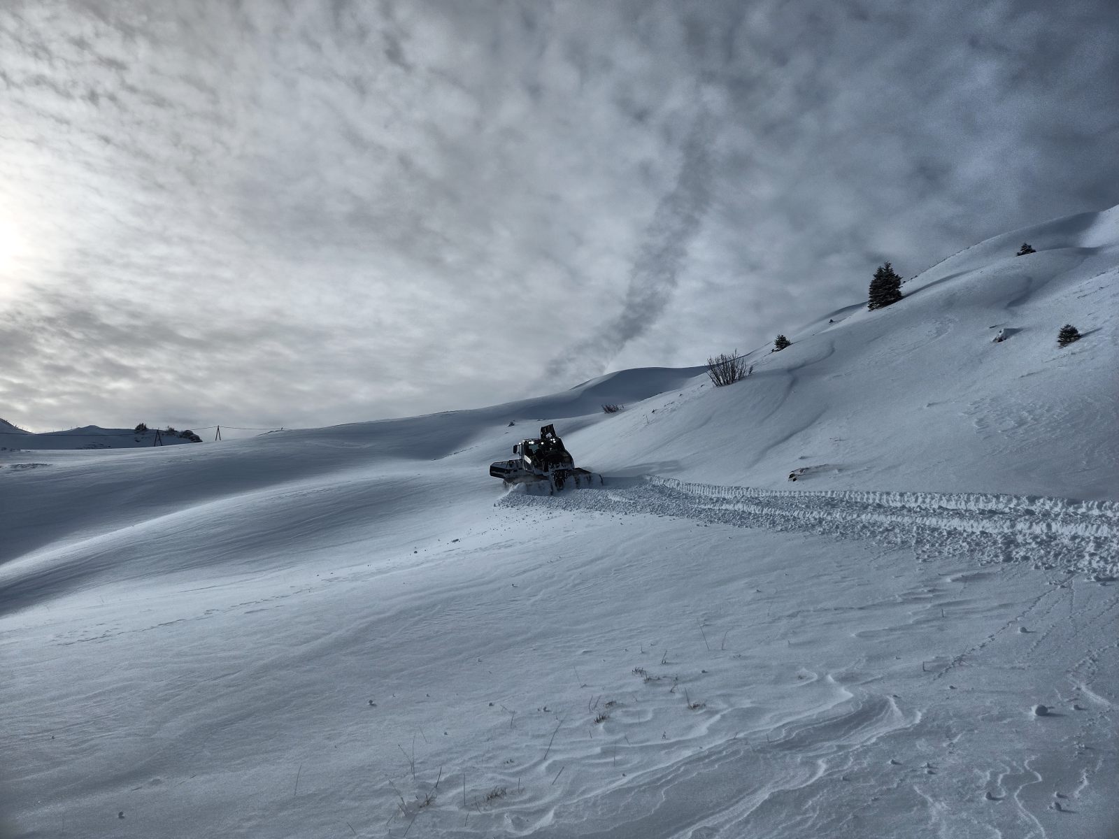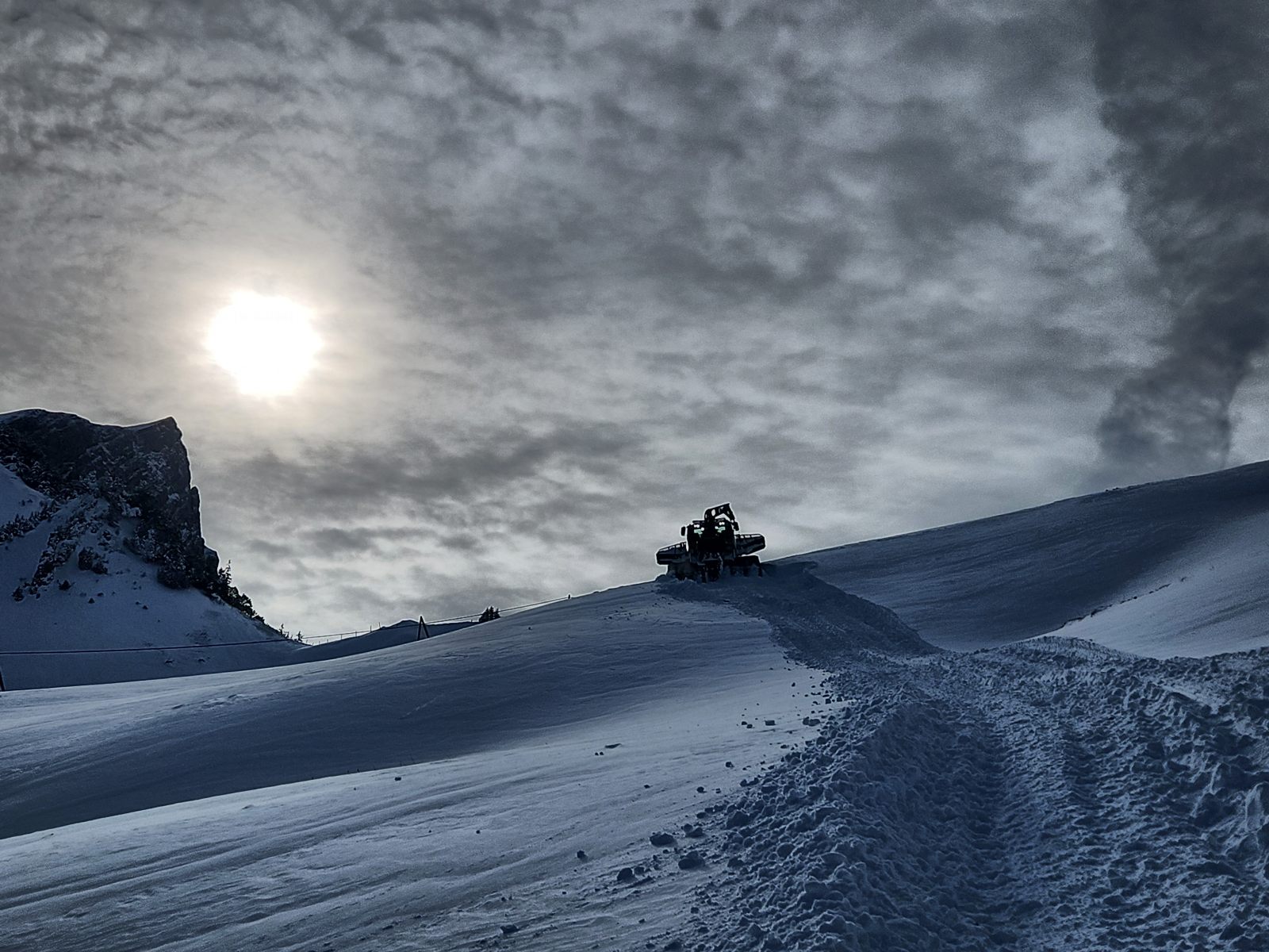 Mal für Mal ziehe ich meine Abfahrtslinie weiter rechts hinab, zumal mit der Zeit auch eine Handvoll anderer Skitüreler nachgekommen ist, deren Spuren auch Platz beanspruchen. Die vierte Abfahrt ziehe ich dann weit nach Südosten in den Kessel hinunter, von wo ich zum Sattel im Südgrat hochspuren will und über diesen wieder auf den Gipfel. Ich bin gerade erst losgegangen, als ein Pistenbully angedonnert kommt und sich über meine geplante Aufstiegsroute hochwühlt. So etwas nenne ich Service! Wenn in Adelboden die Pisten gemäss Werbung von Heinzelmännlein für jeden Gast frisch bereitgemacht werden, scheut die Mörlialp tatsächlich keinen Einsatz für Tourenfahrer.