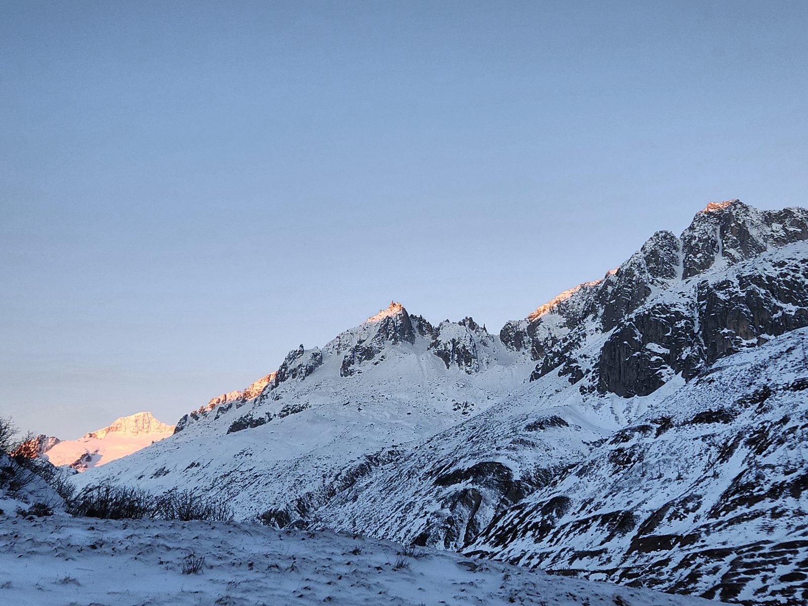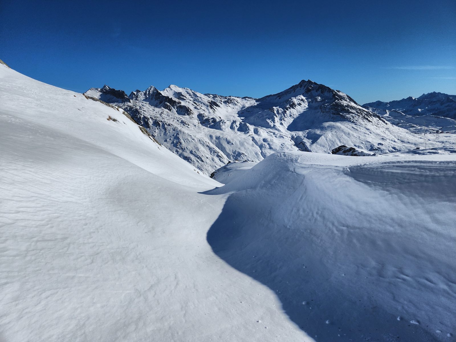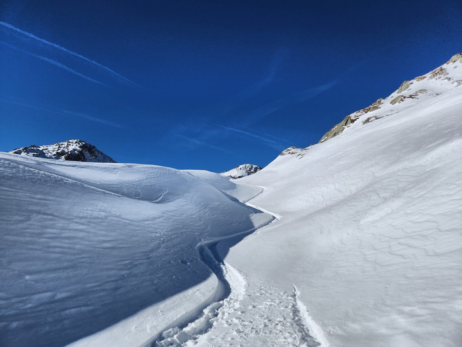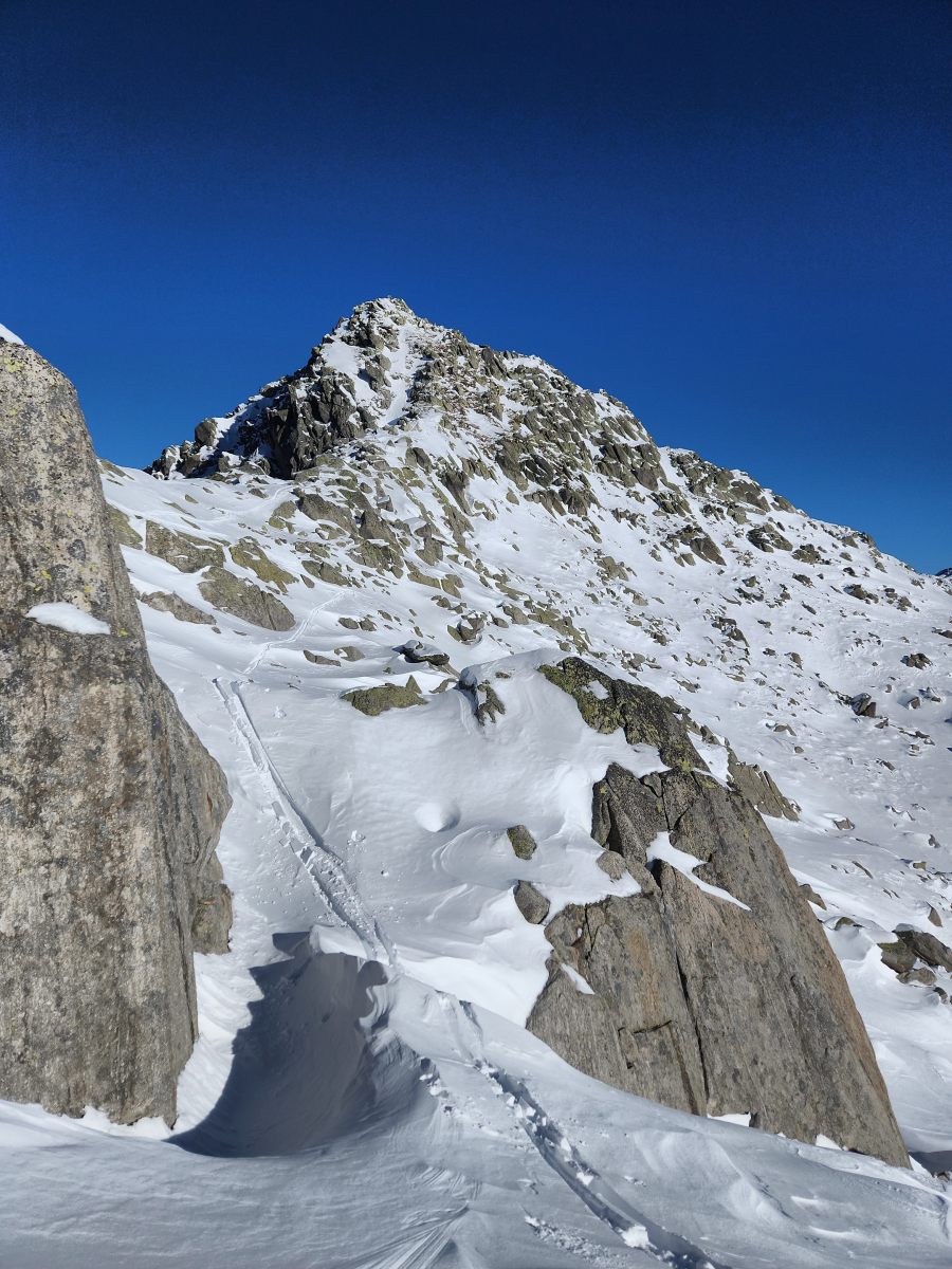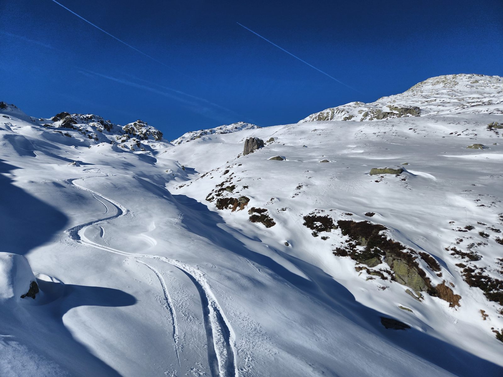 Herbstende nach dem Wintereinbruch, und zwischen diesen beiden Extremen ist die Tour auch angesiedelt: Nicht mehr besonders viel Schnee und schmelzharsch bis ca. 1800, danach recht gut eingeschneit, oben aber ein Hindernislauf im grobblockigen Geröll, und im Gipfelhang weiss man nicht recht, was weniger geeignet ist, Fussaufstieg oder mit Skiern. Trotzdem wird es dank einer sehr schönen Abfahrt ein Prachtstag. Der Winter ist eingeläutet, nun soll er auch bleiben!