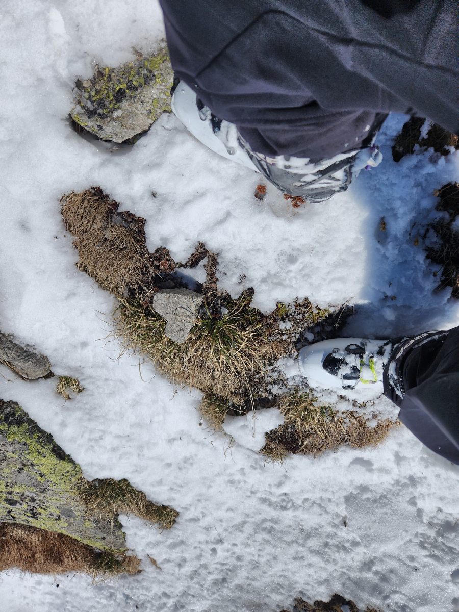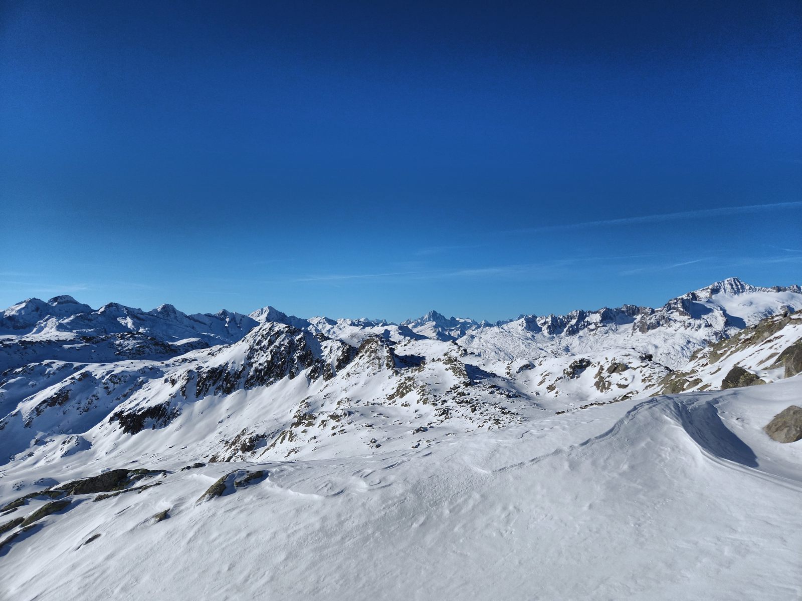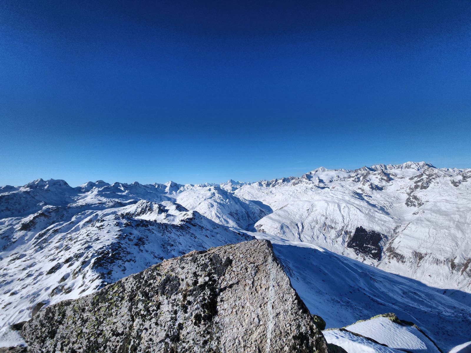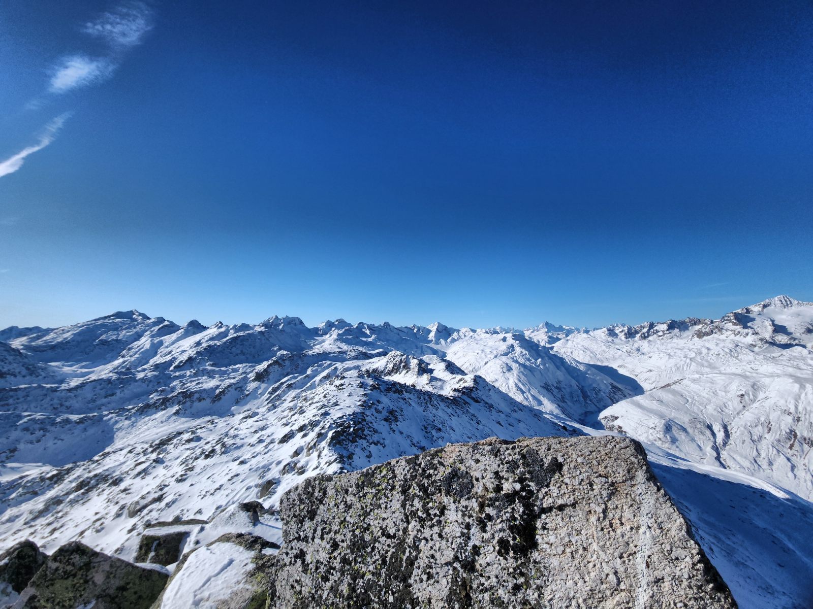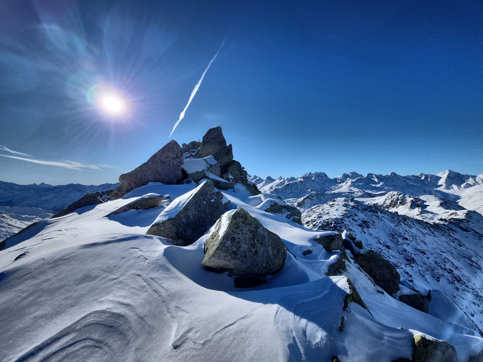 Am besten wäre es vielleicht gewesen, den Gipfel zu umgehen, anstatt ihn zu überschreiten, aber wie die Schneeverhältnisse auf der Südseite sind, lässt sich, im Gegensatz zum Direktaufstieg, nicht abschätzen. Auf dem Gipfel erwartet eine überwältigende Rundumsicht und fies verschneites Blockgelände. Mehrmals breche ich beim Abstieg unvermittelt bis zur Hüfte ein, und ich kann nur froh sein, dass niemals das Knie an einem verborgenen Haifischzahn aufschlägt. Die sonnenbeschienene Südflanke ist weiter unten recht aper, und bald habe ich den Fuss des SW-Grats erreicht.