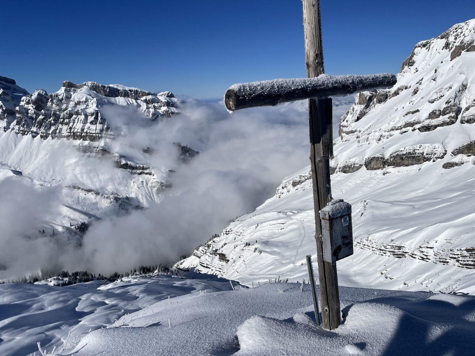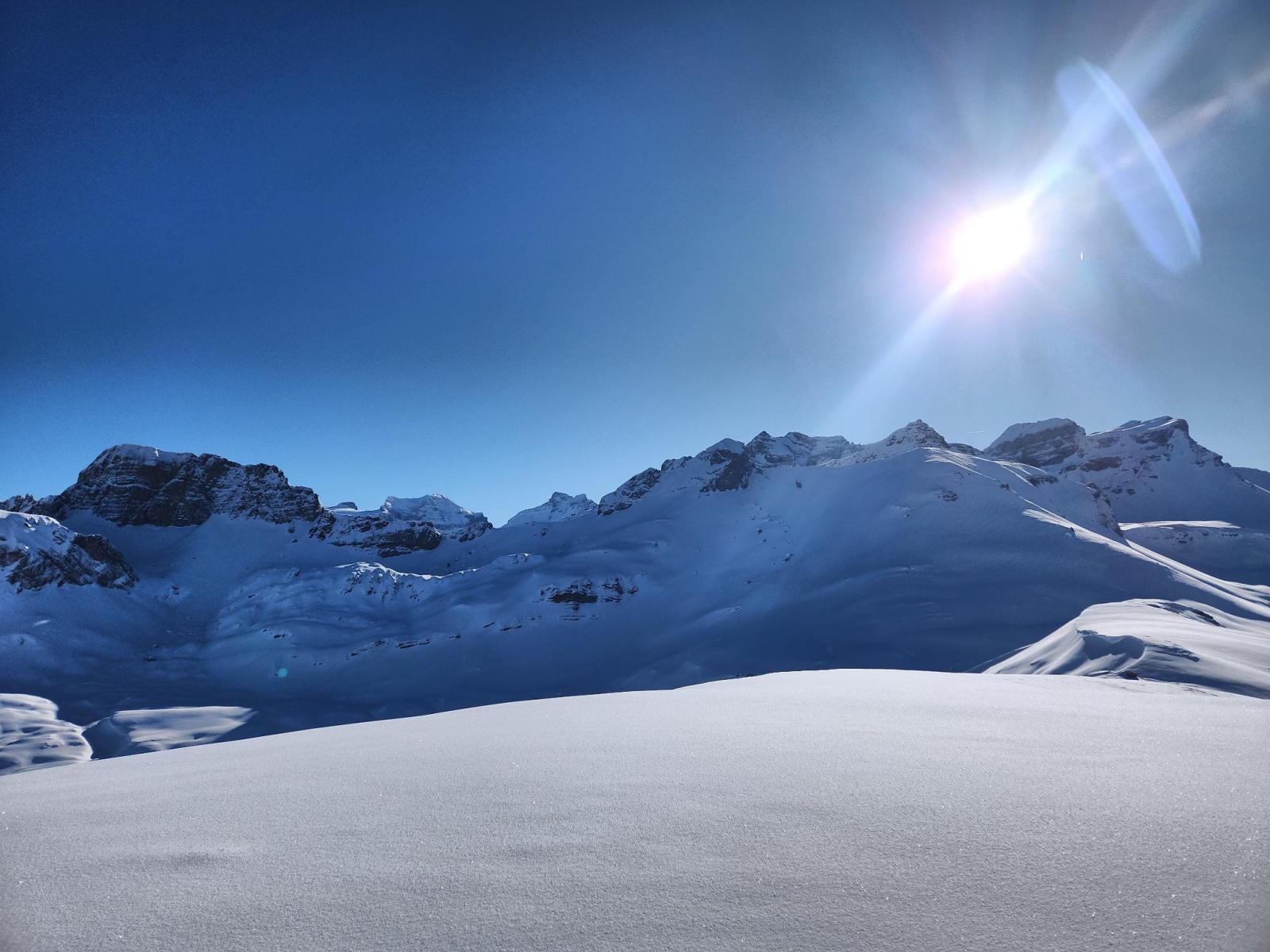 Der Aufstieg verläuft bis zum Gross Boden im Nebel, und so tappe ich mehrmals ziemlich blind durch die Landschaft. Umso schöner der Moment, als sich die Sonne hinter den Nebelschwaden zeigt. Für den Rest des Tages strahlt sie dann vom makellos blauen Himmel über uns. Es sind sehr wenig Leute unterwegs, und der Schnee macht einen einladenden Eindruck. Auf dem Firsthöreli ist schon eine kleine Gruppe versammelt, und es wird über die Spuren in der direkten Abfahrt vom Gipfel nach Osten diskutiert.