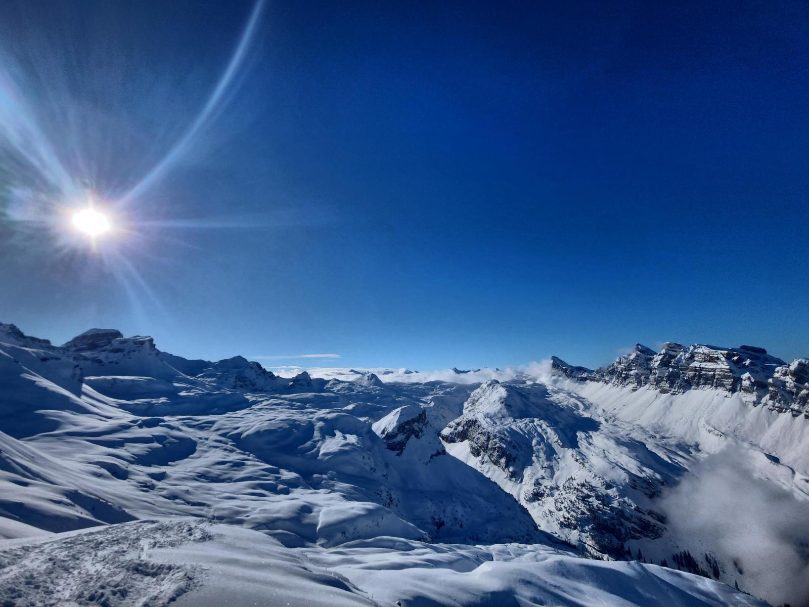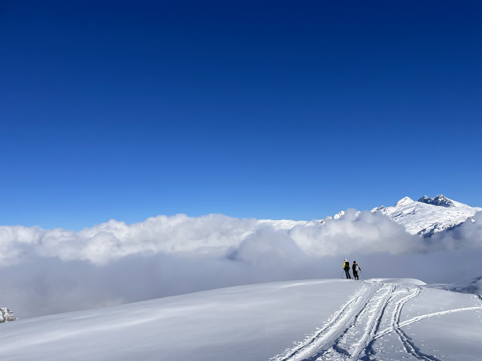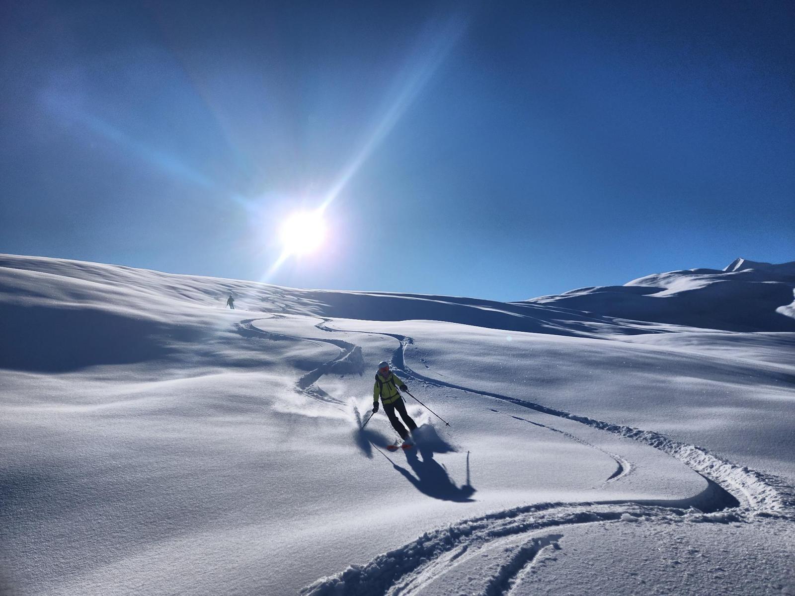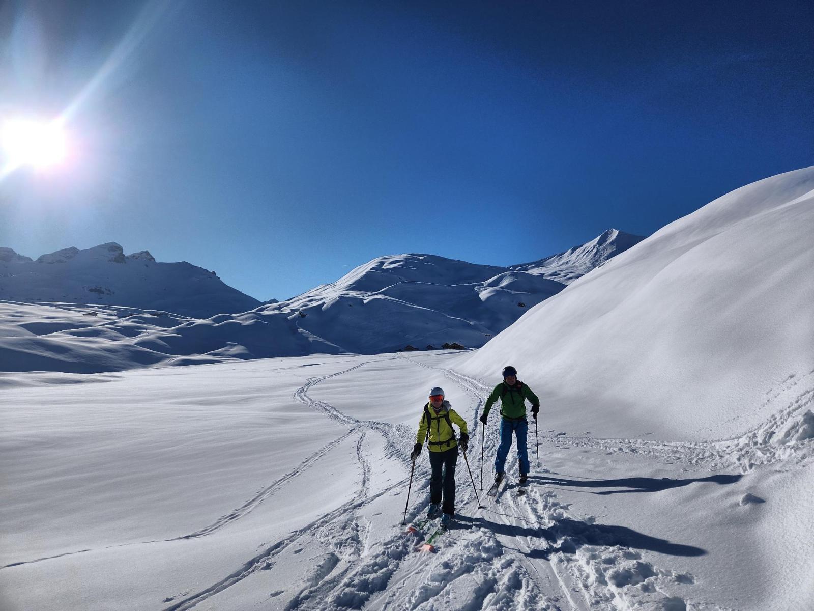 Nichts für uns, denn wird haben die Skis unten gelassen und und gleiten danach recht mühselig mit den Fellen zurück ins Pässlein hinunter. Mitleidige Blicke begleiten uns von allen Seiten. Skifahren sollte man halt schon können. Wartet’s ab, Leute! Als erste legen wir ein Spürchen auf den Mattner First, und cruisen nach einer kurzen Rast über die noch unverfahrenen Hänge hinunter. Offenbar hat der Wind Feuchtigkeit aus tieferen Lagen mit hochtransportiert, sodass eine feine Kruste spürbar ist, aber angesichts der schwierigen Wetterverhältnisse der vorangegangenen Woche geniessen wir eine prächtige Abfahrt.