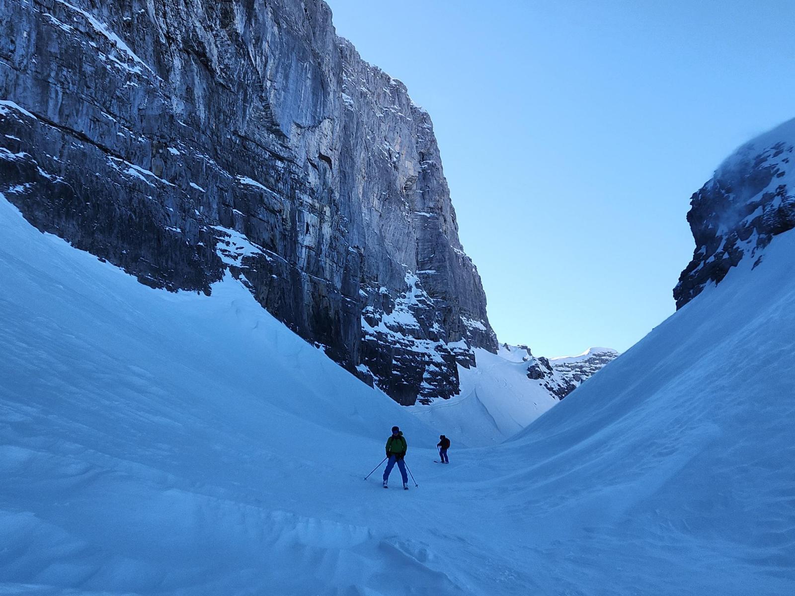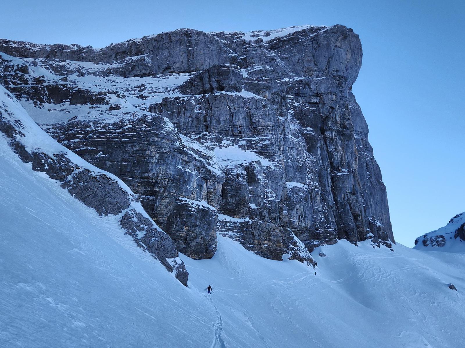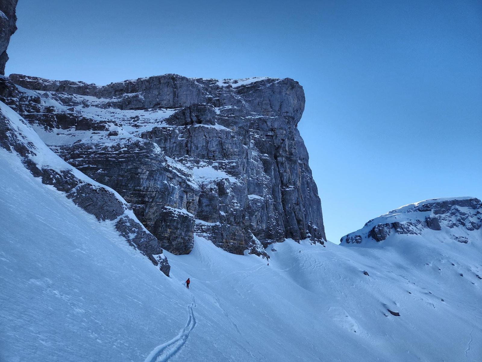 Der Vorgipfel des Märcher Stöcklis sieht einladend aus, sodass wir diesen Gipfel als Tourenziel definieren. Windstille und milde Temperatur laden zum Verweilen ein, besonders nach unserem kalten Aufstieg. Mit Vorfreude auf die Abfahrt brechen wir jedoch schon bald auf. Der Schnee im ersten Hang ist erstaunlich locker und prächtig zu fahren. Hinunter zum Chli Glatten wird es zunehmend härter. Als erste spuren wir die Traverse durch den eindrücklichen Glatten Canyon an. Der Schnee ist gut fahrbar, jedoch nicht einwandfrei. Wie wird das noch werden? Eine lange Traverse der Hoffnung bringt uns schliesslich direkt unter die March Chälen, wo der Hang unter uns tatsächlich mit sehr schön zu fahrendem Lockerschnee aufwartet. Die nächsten 500Hm sind traumhaft zu fahren, wenn man etwas vorausschauend die kleinen Zonen mit Windharsch vermeidet.