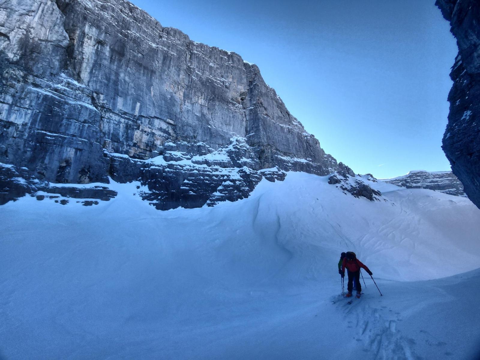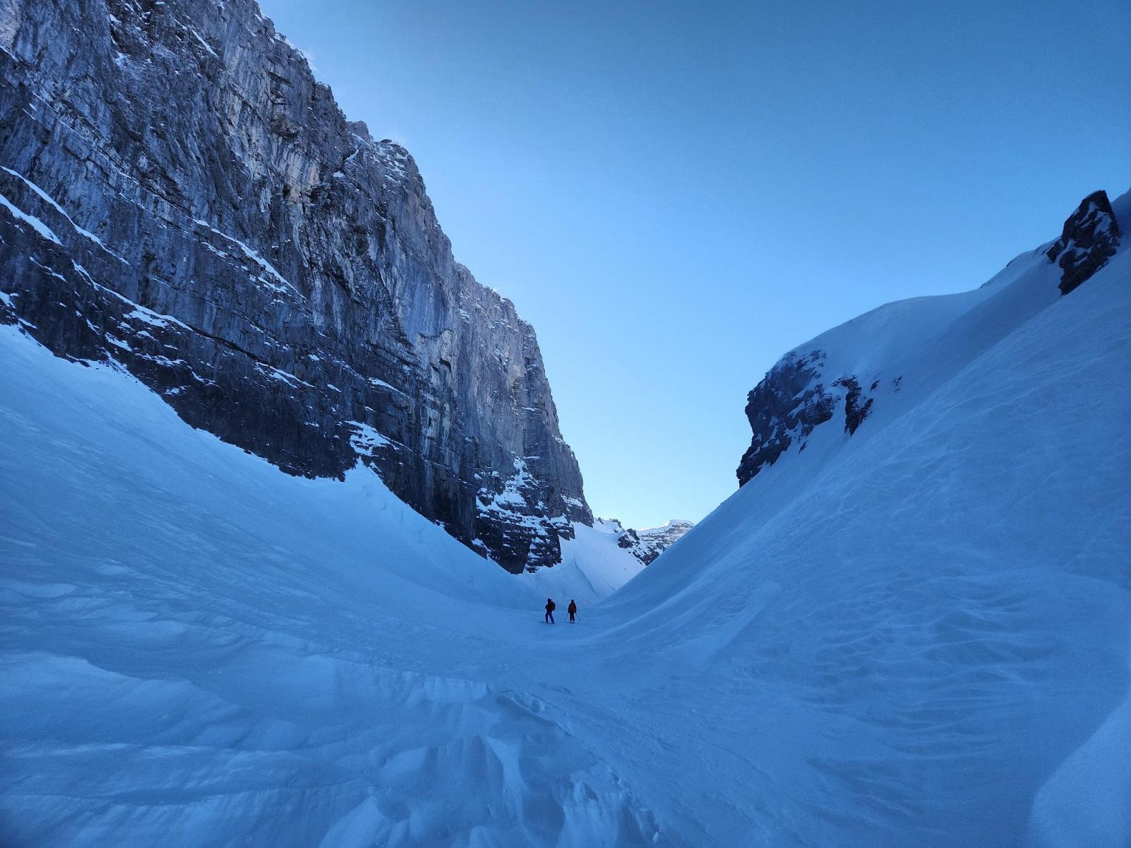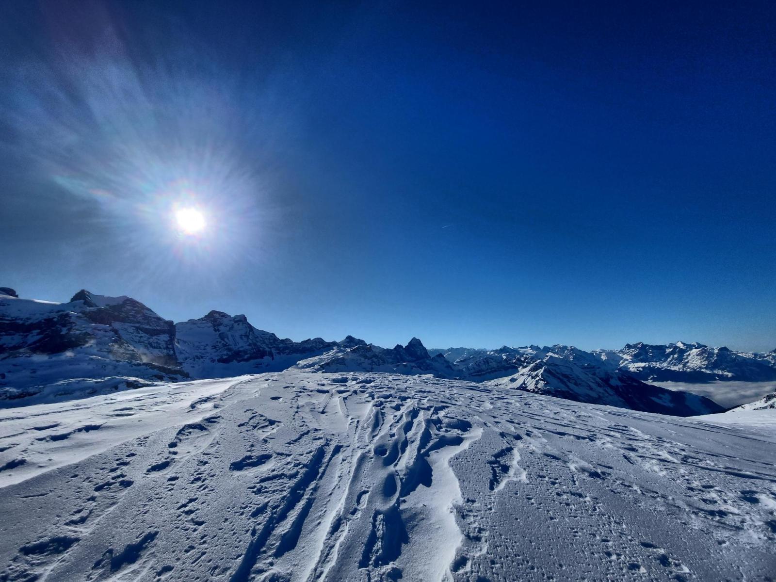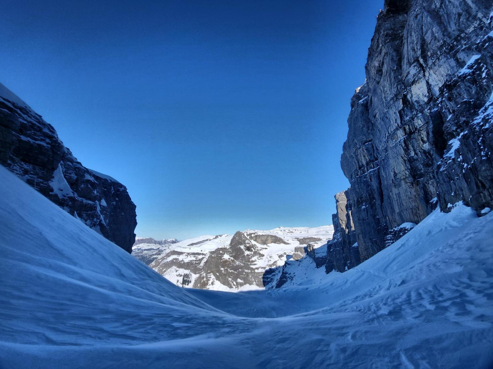 Der Vorgipfel des Märcher Stöcklis sieht einladend aus, sodass wir diesen Gipfel als Tourenziel definieren. Windstille und milde Temperatur laden zum Verweilen ein, besonders nach unserem kalten Aufstieg. Mit Vorfreude auf die Abfahrt brechen wir jedoch schon bald auf. Der Schnee im ersten Hang ist erstaunlich locker und prächtig zu fahren. Hinunter zum Chli Glatten wird es zunehmend härter. Als erste spuren wir die Traverse durch den eindrücklichen Glatten Canyon an. Der Schnee ist gut fahrbar, jedoch nicht einwandfrei. Wie wird das noch werden? Eine lange Traverse der Hoffnung bringt uns schliesslich direkt unter die March Chälen, wo der Hang unter uns tatsächlich mit sehr schön zu fahrendem Lockerschnee aufwartet. Die nächsten 500Hm sind traumhaft zu fahren, wenn man etwas vorausschauend die kleinen Zonen mit Windharsch vermeidet.