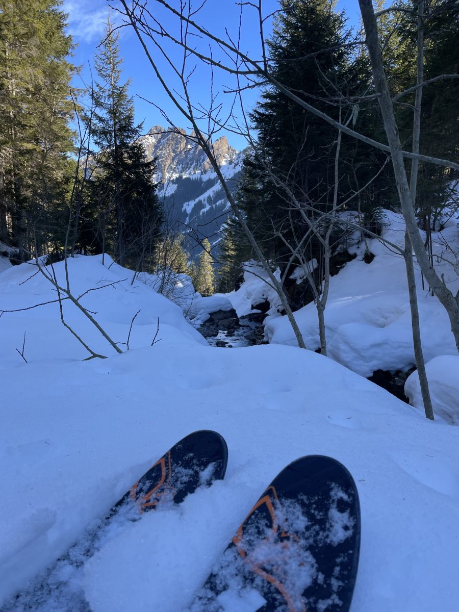 Unsere Abfahrt via Ober- und Gossalp ins Grosstal bietet verschiedene Schneesorten, insgesamt sind sie jedoch überraschend gut fahrbar. Die Landschaft bei Hüttenboden lädt zum Verweilen ein, und da wir praktisch alleine unterwegs sind, ist das Tal in erhabene Stille gehüllt. Die ersten Sonnenstrahlen begleiten unsere Abfahrt bis zur Talstation in St. Jakob, von wo uns die Luftseilbahn zum Berggasthaus Gitschenen hochbringt. Dort setzen wir uns zum Zmittag nieder und erholen uns von den Strapazen.