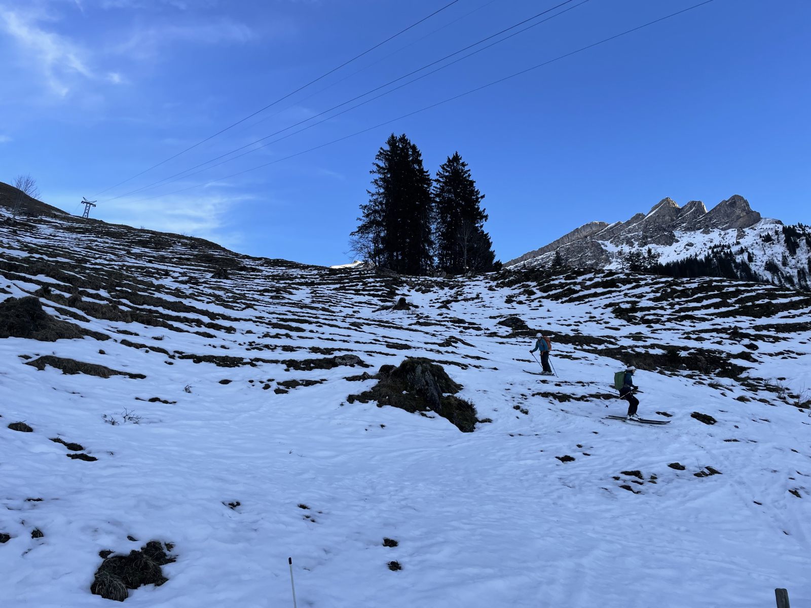 Wohl genährt und gut gestärkt machen wir uns bei Sonnenschein auf den Weg ins Sulztal. Zur Sinsgäuer Schonegg hoch wird es nochmals steil, und oben begrüsst und ein zugiger Wind. Die landschaftlich schöne Fahrt durchs Sinsgäu wird durch einen REGA-Einsatz in der Nordflanke des Chaisertuels gestört. Später erfahren wir, dass es sich beim Unfall um eine verhältnismässig wenig schwierige Verletzung handelte. Wir schauen indes umso mehr, dass wir auf unserem Weg nach Ober Spis möglichst sicher auf den Schneebändern zwischen grasigen und felsigen Stellen durchmanövrieren. Ein letztes Mal wird unser Sicherheitsempfinden am kleinen Luftseilbähnlein auf die Probe gestellt, als uns der Bauer erklärt, dass das Zugseil neu gespleisst worden sei und seither das Kabinchen nicht mehr ganz bis in die Station hoch reiche. Nichtsdestotrotz erreichen wir wohlbhalten die Talstation in Rickenbach und fahren mit viel Sonne im Herzen zurück ins Tal.