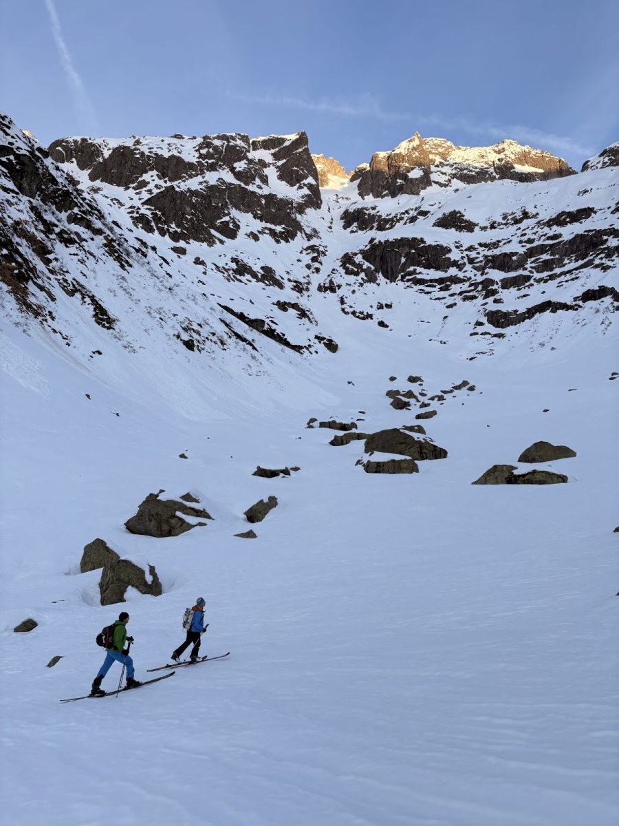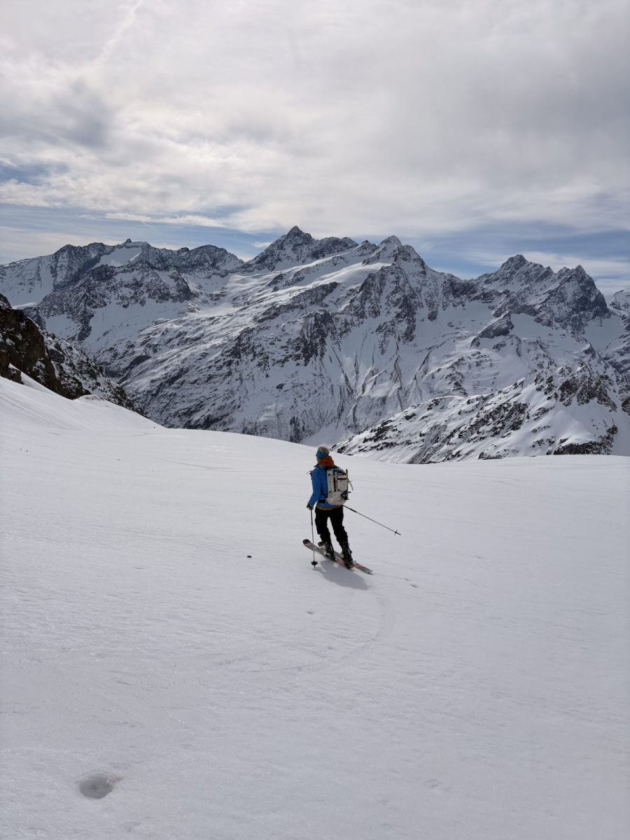 Die Abfahrt ist oben noch recht hart, denn wie angekündigt überziehen Schleierwolken langsam den Himmel. Dafür lassen sich die extrem steilen Hänge westlich des Chüefadfirns auf perfekt gleichmässiger Unterlage fahren. Weiter unten sulzt der Schnee bald auf, und es zeigt sich tatsächlich immer mehr die Sonne. Die Unterlage hält weiterhin, und so können wir direkt über die steilen Flanke gegen Rotgand hinunter stechen. Nach 1200 Hm Traumabfahrt stehen wir allein im Kessel der Wissgand und lassen die Sonne auf uns einbrennen. Welch ein einzigartiger Skitourentag Ende Februar!
