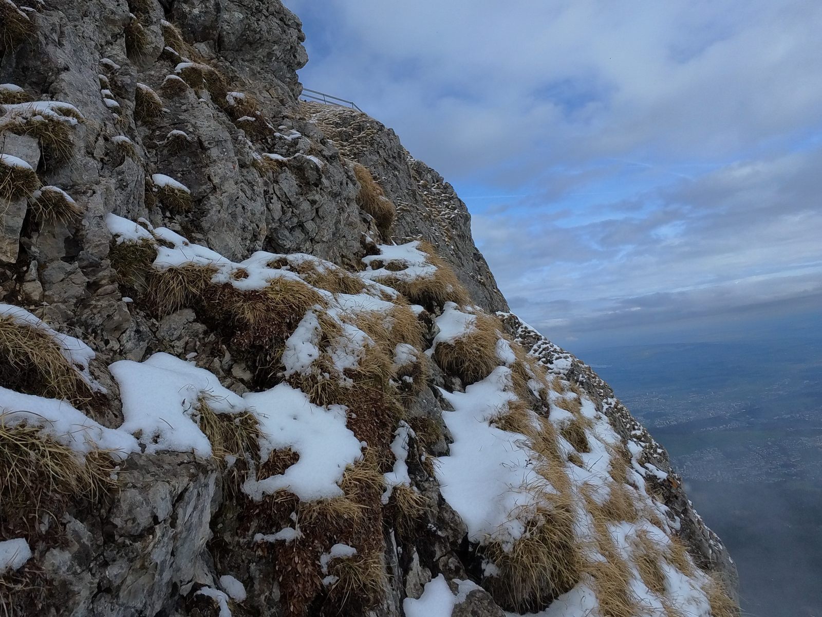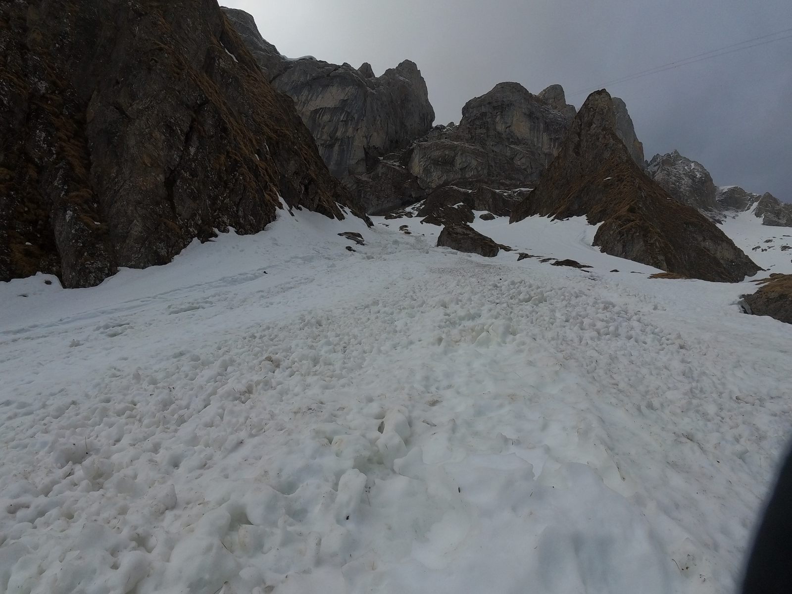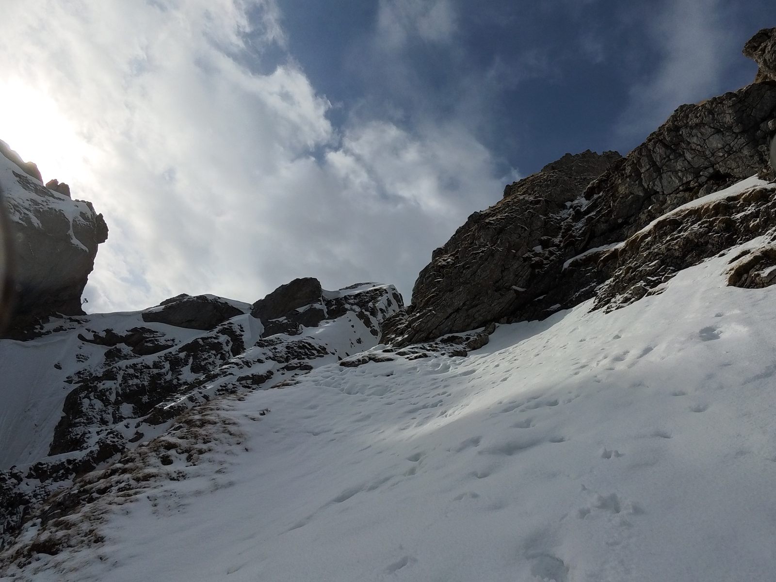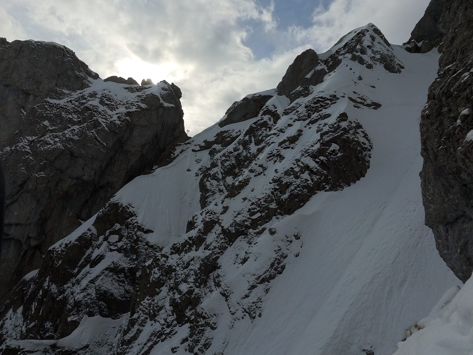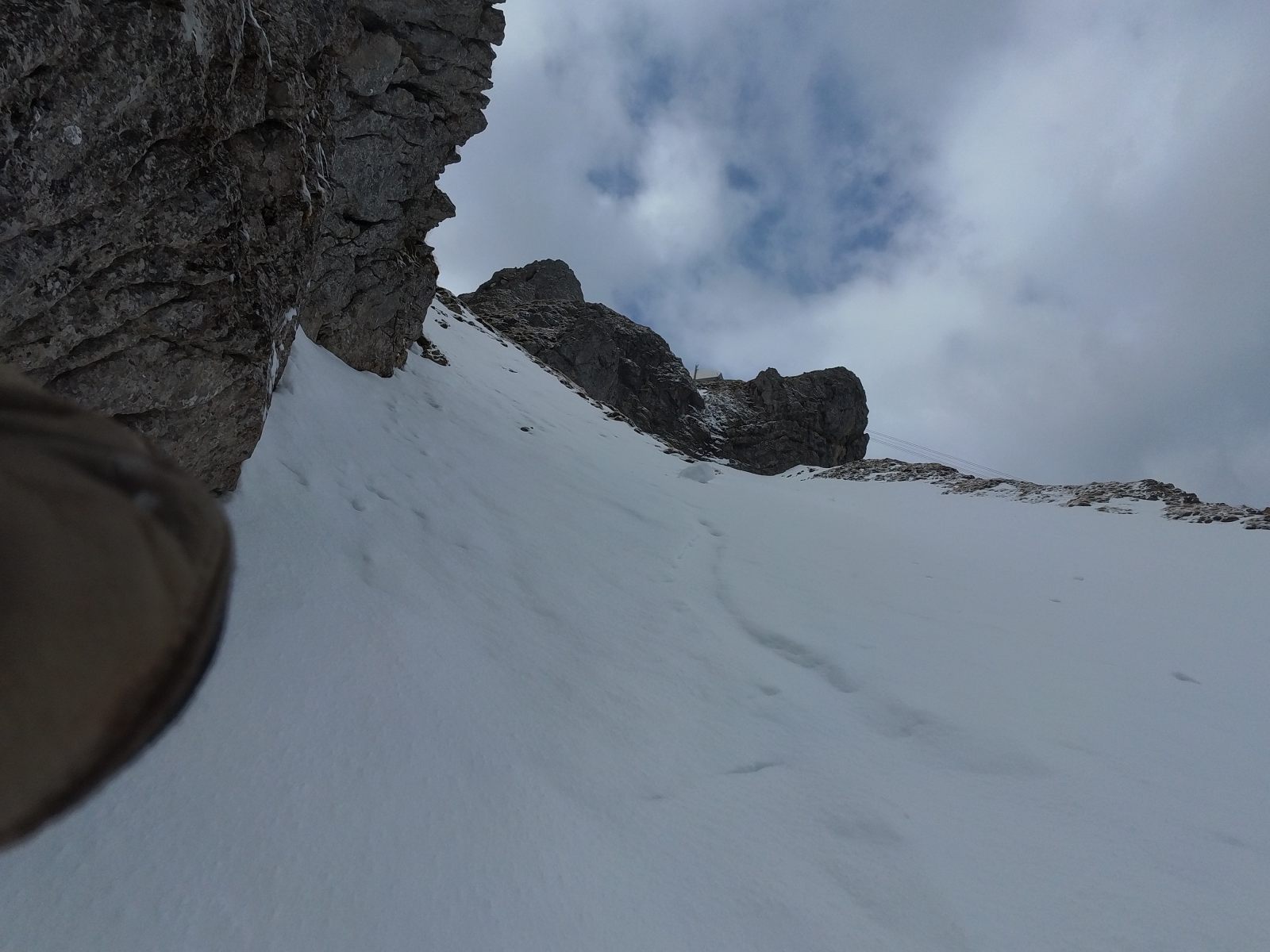 Frohgemut kraxle ich los und stehe alsbald beim ersten grossen Bullauge. Dort ist die Rinne dich mit Schnee gefüllt, der nun wirklich sehr weich ist. (Wie war das genau mit der Warnung?!) Nicht mehr ganz SUVA-konform pflüge ich mich durch den Steilpflotsch und folge rechts dem trockenen Fels. Eine kurze Boulderstelle über den nächsten Aufschwung hoch leitet zum Wandbuch. Rechts raus und dann über gut gestuftes Fels- und Schrofengelände auf den Gipfel. Durchaus exponiert, aber nicht weiter schwierig. — Denkste! In dieser ostseitigen Exposition ist der Schnee gerade nicht weggeschmolzen, sondern ist zu einer kompakten Eisschicht gefroren, welche unter einer dünnen Schneeschicht liegt. Mit einem ganz leichten Anflug von Panik beginne ich, die Eisblattern wegzuhacken. Möglichst sachte, damit ich die Balance nicht verliere, den hinter mit gähnen einige hundert Meter Abgrund. Diese Aktion liegt definitiv im dunkelorangen Bereich, und das 20 Meter unter dem Gipfel!